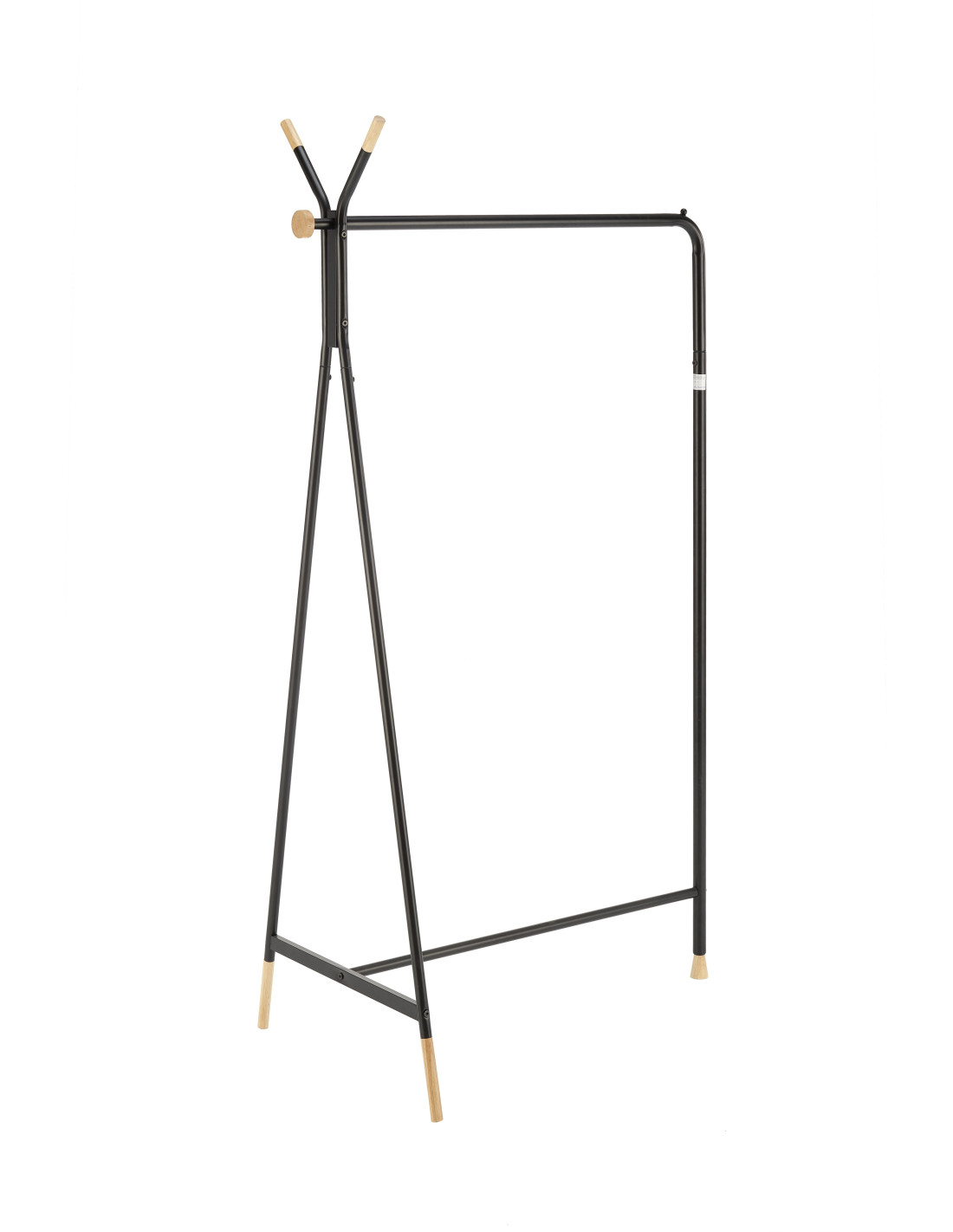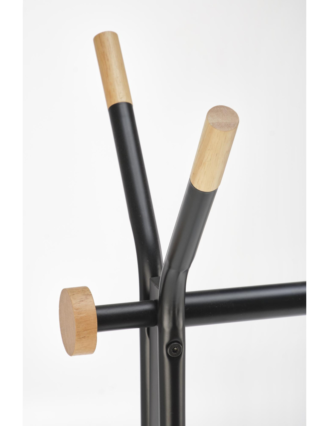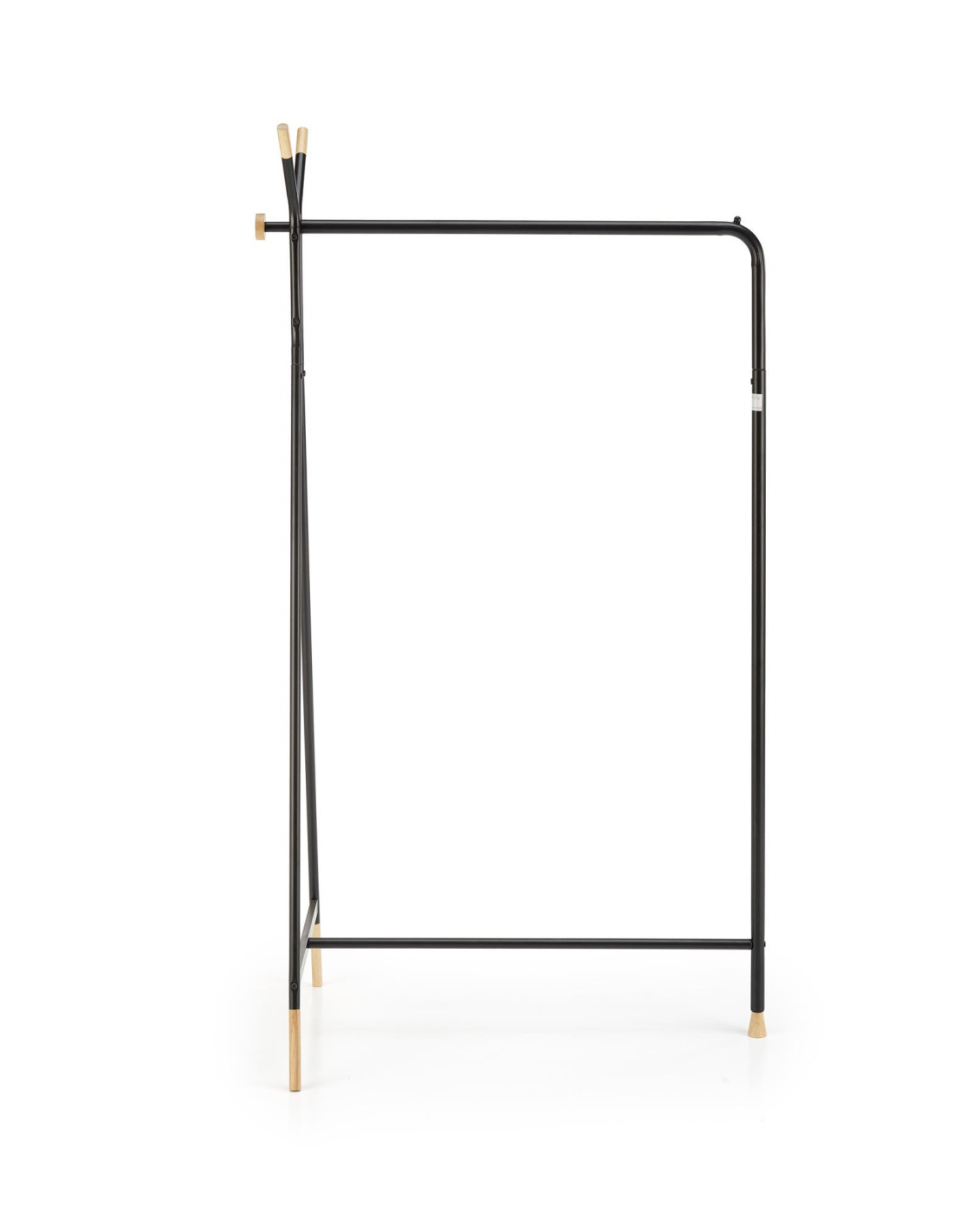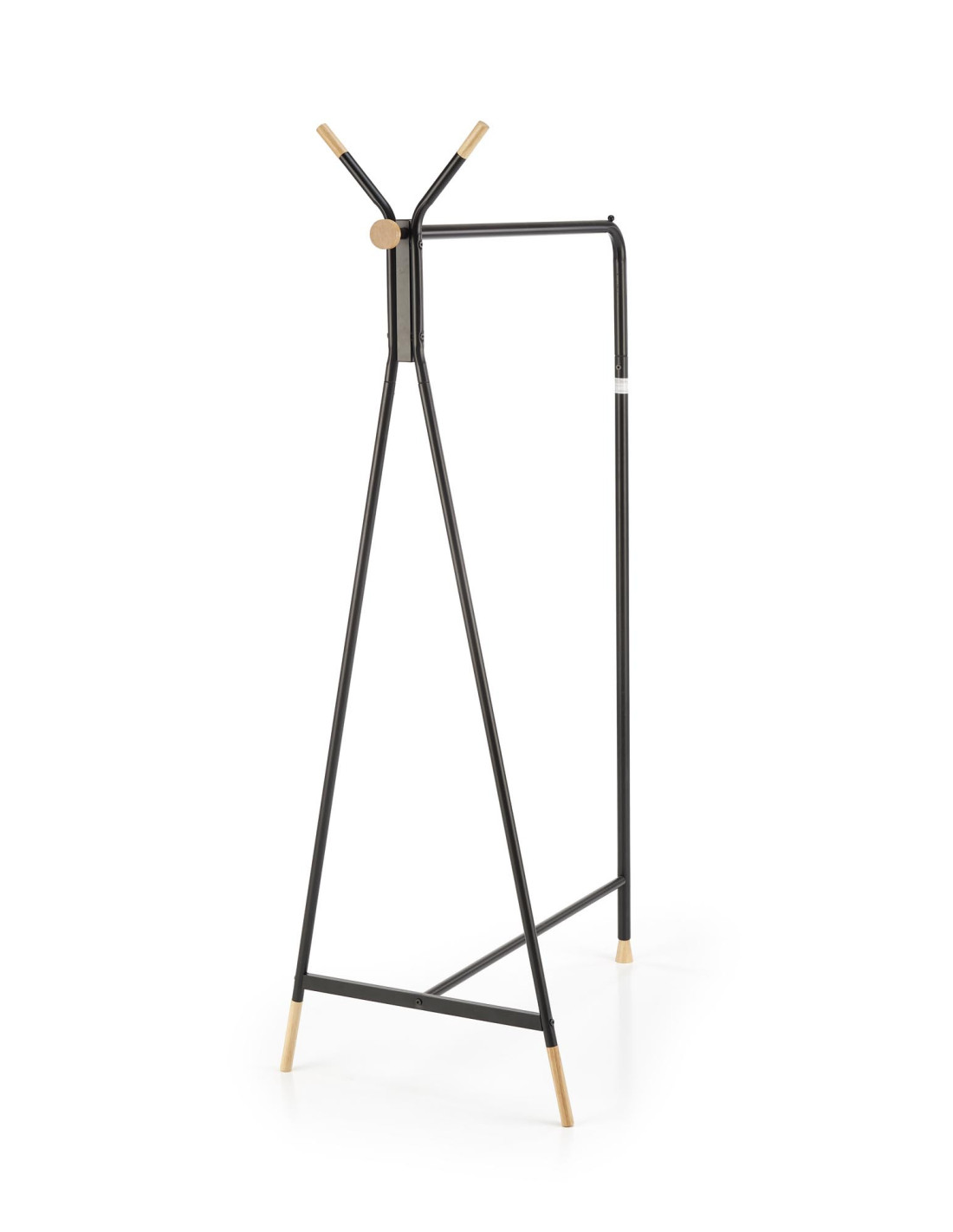 Wieszak WU-32 składa się z metalowej konstrukcji malowanej proszkowo oraz drewnianych akcentów na końcach nóg i haczyków.