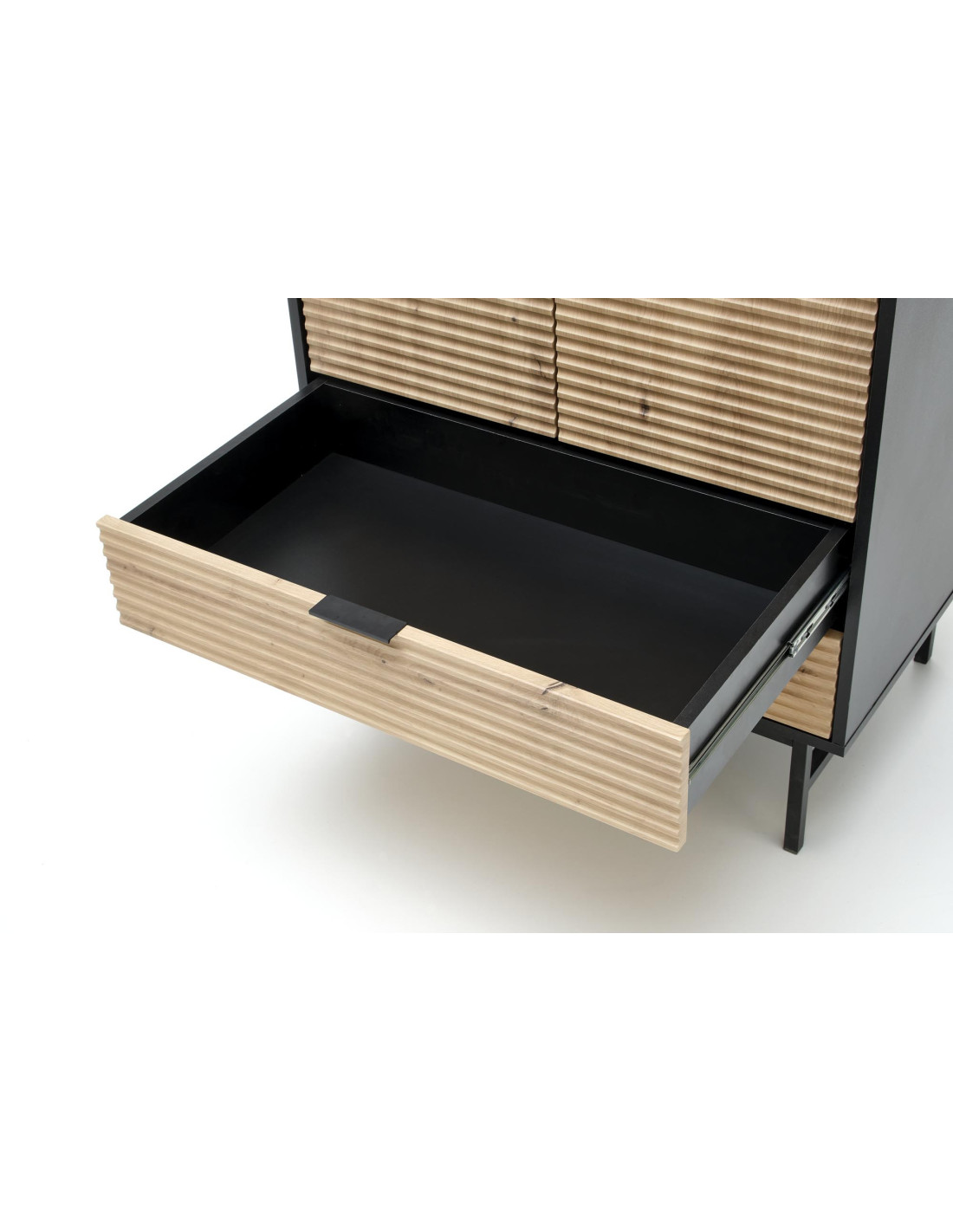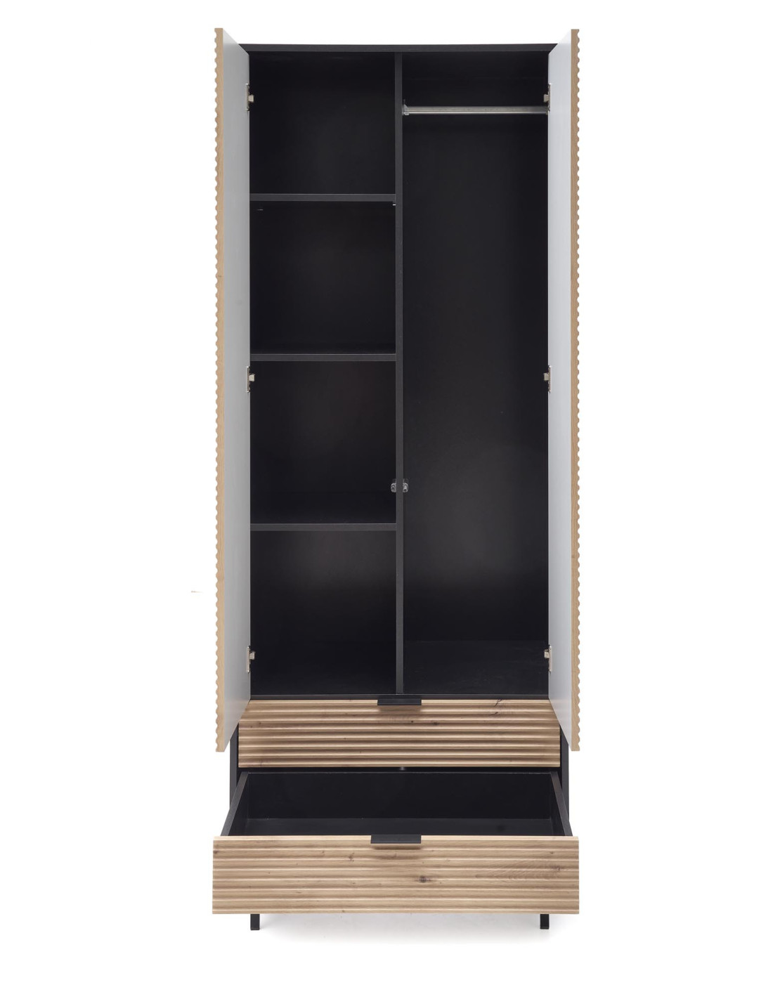 Zaprojektowana z myślą o maksymalnej funkcjonalności, szafa MURANO posiada przestronną wnękę oraz dwie szuflady, które pomogą w organizacji Twojej odzieży i akcesoriów. Wykonana z wysokiej jakości materiałów, takich jak MDF okleinowany oraz stal malowana proszkowo, gwarantuje nowoczesny wygląd oraz trwałość na lata.