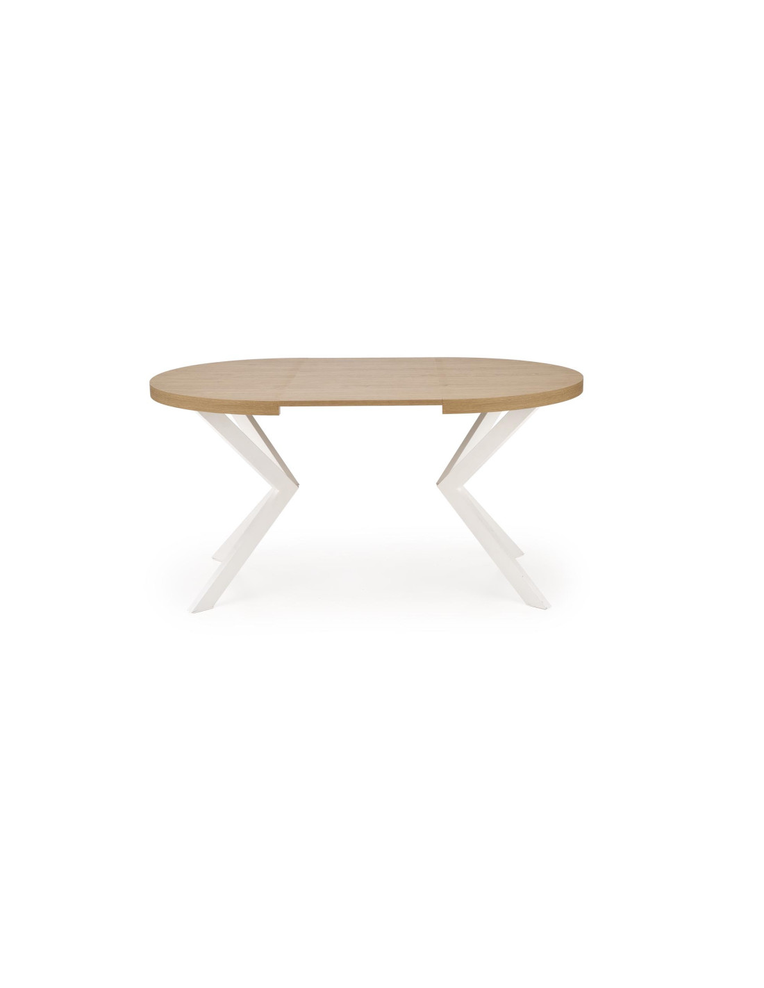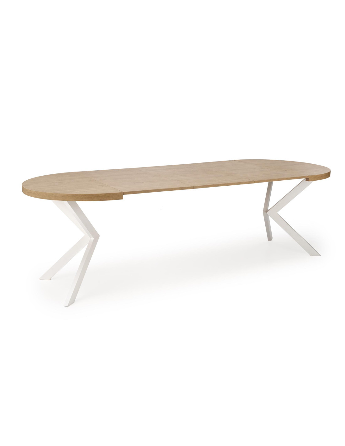 Stół PERONI dostępny jest w kolorze złotego dębu dla blatu oraz białym dla nóg, co tworzy elegancką i nowoczesną kompozycję.