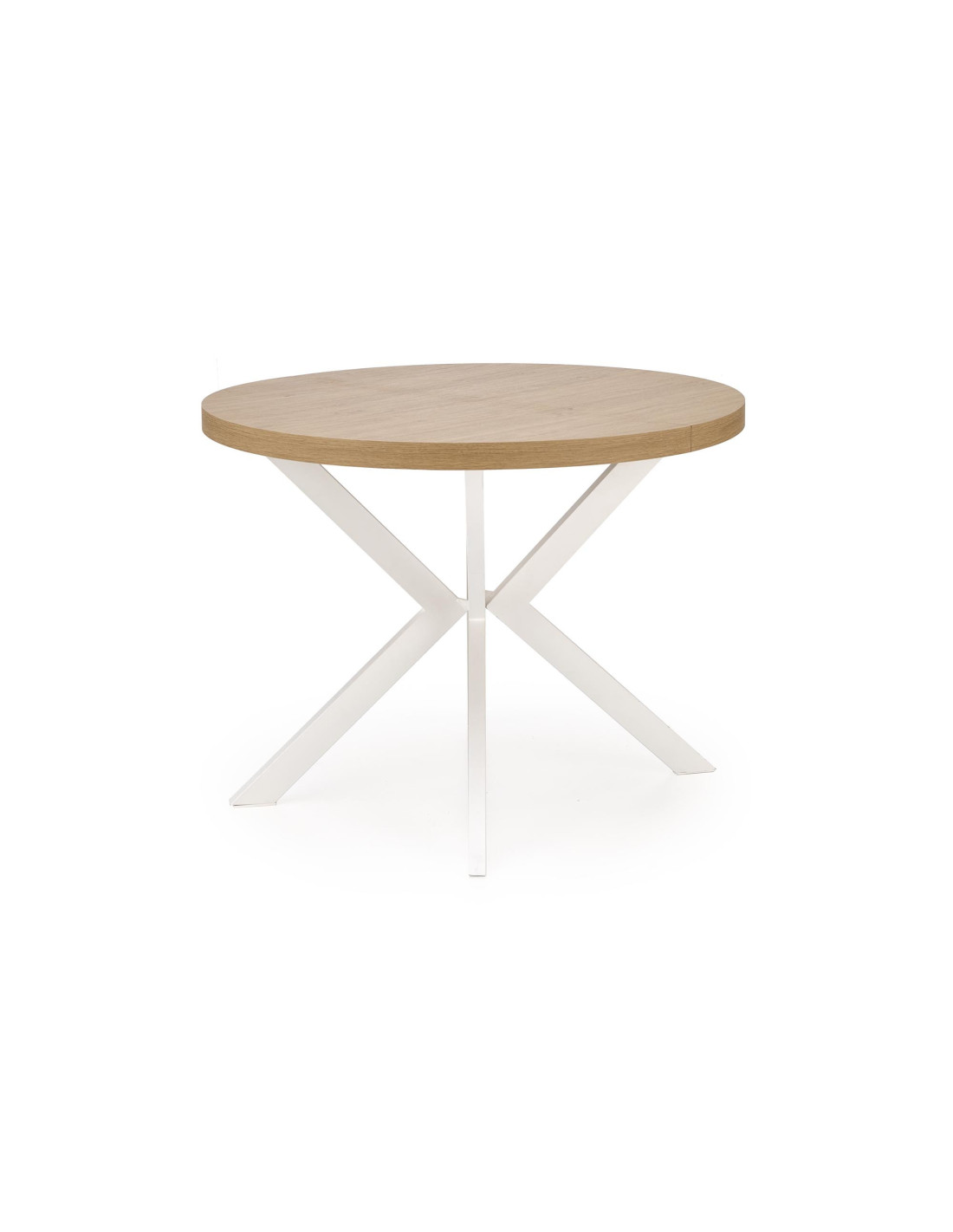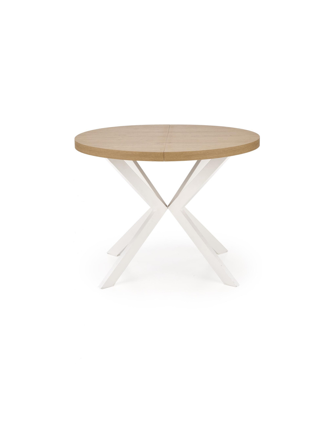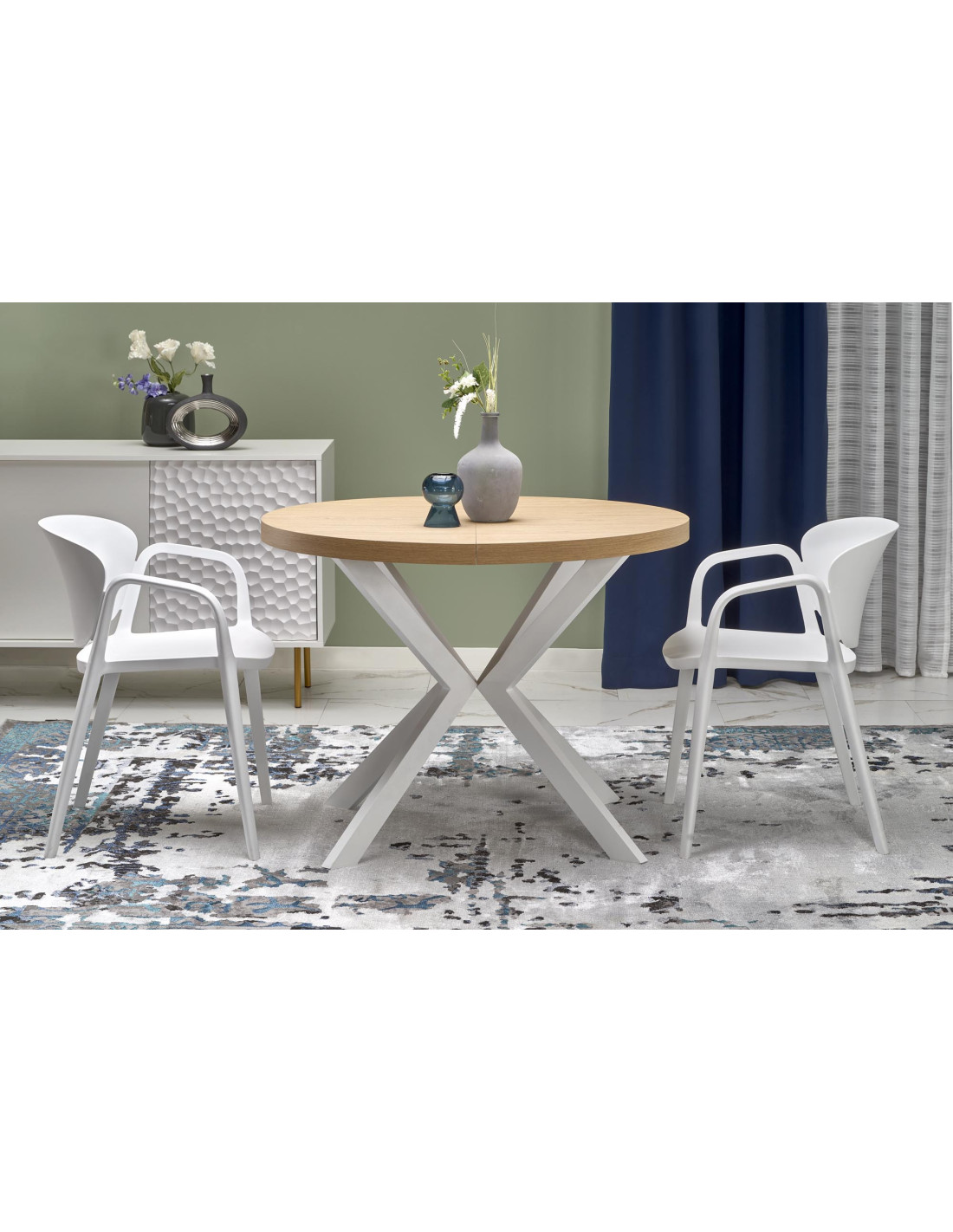 Ciesz się nowym rozszerzanym stołem PERONI, który łączy w sobie elegancki design z funkcjonalnością! Jego okrągły blat w kolorze złotego dębu oraz nowoczesne białe metalowe nogi tworzą harmonijną kompozycję, idealnie wpisującą się w minimalistyczne aranżacje. Ten stół nie tylko zachwyca swoim wyglądem, ale także spełnia oczekiwania w codziennym użytkowaniu, stając się niezastąpionym elementem Twojej jadalni.