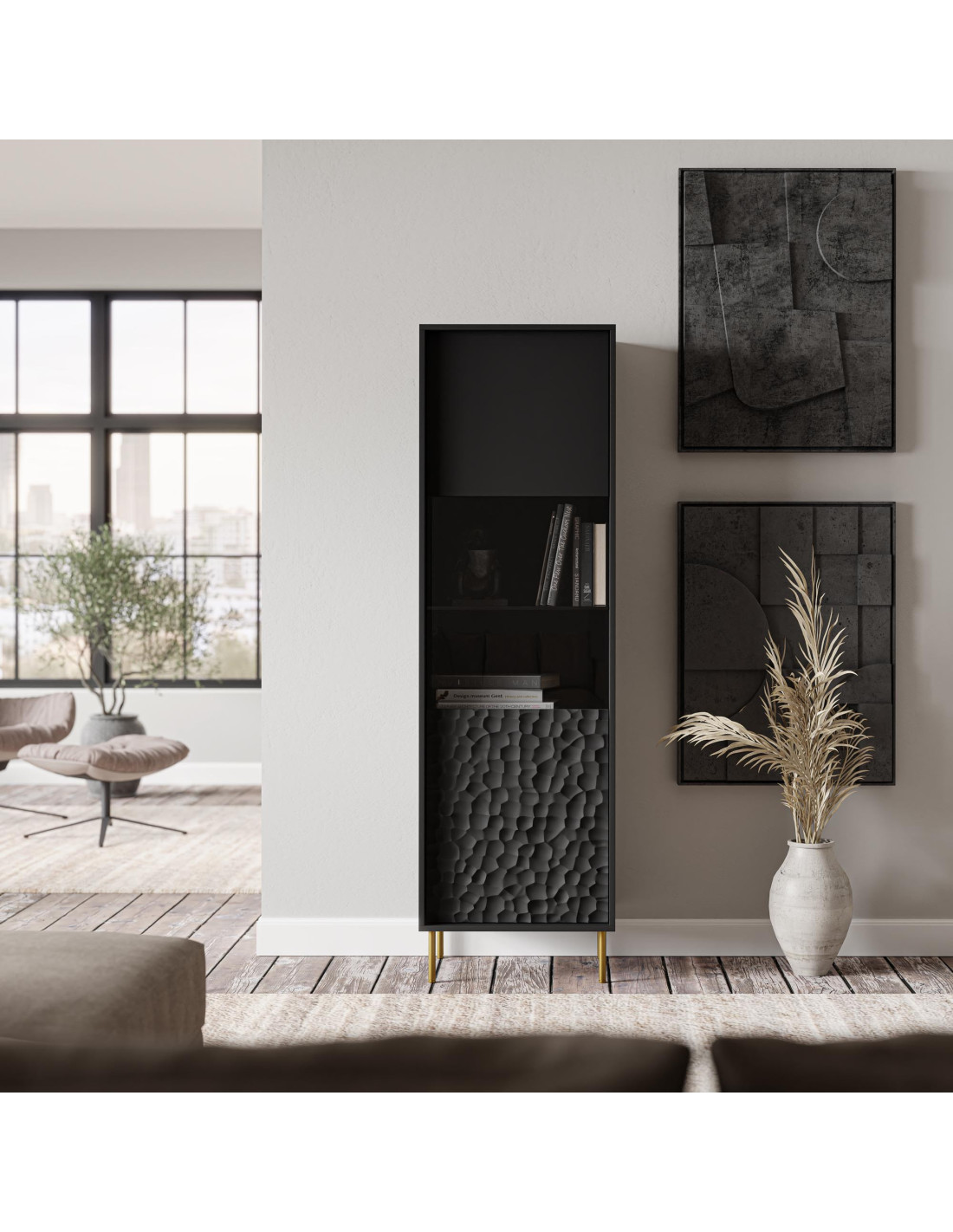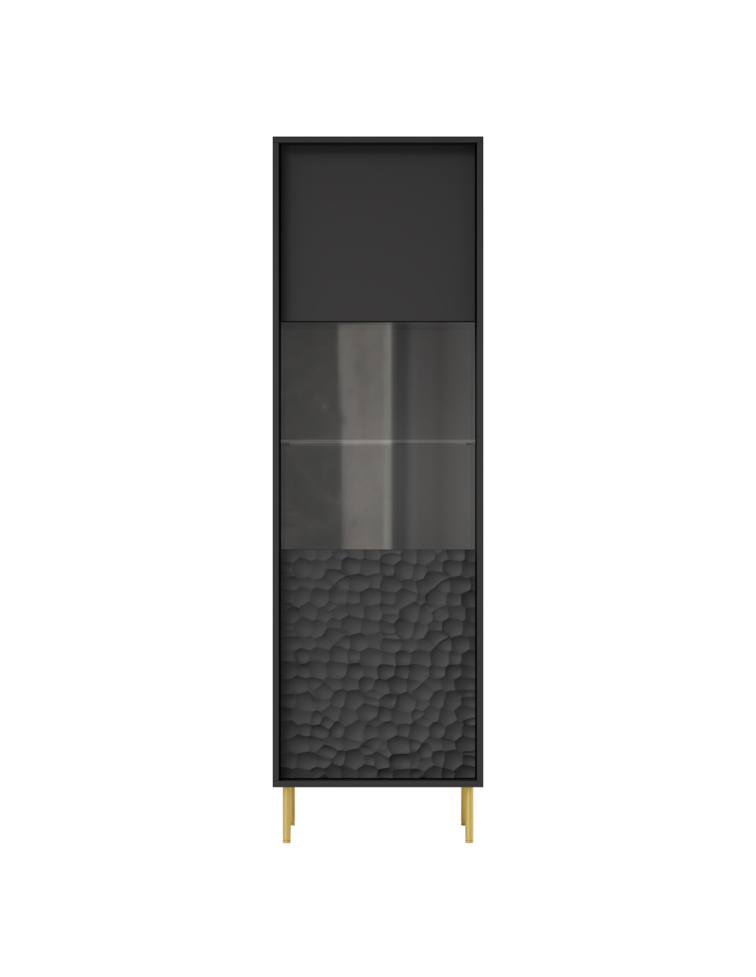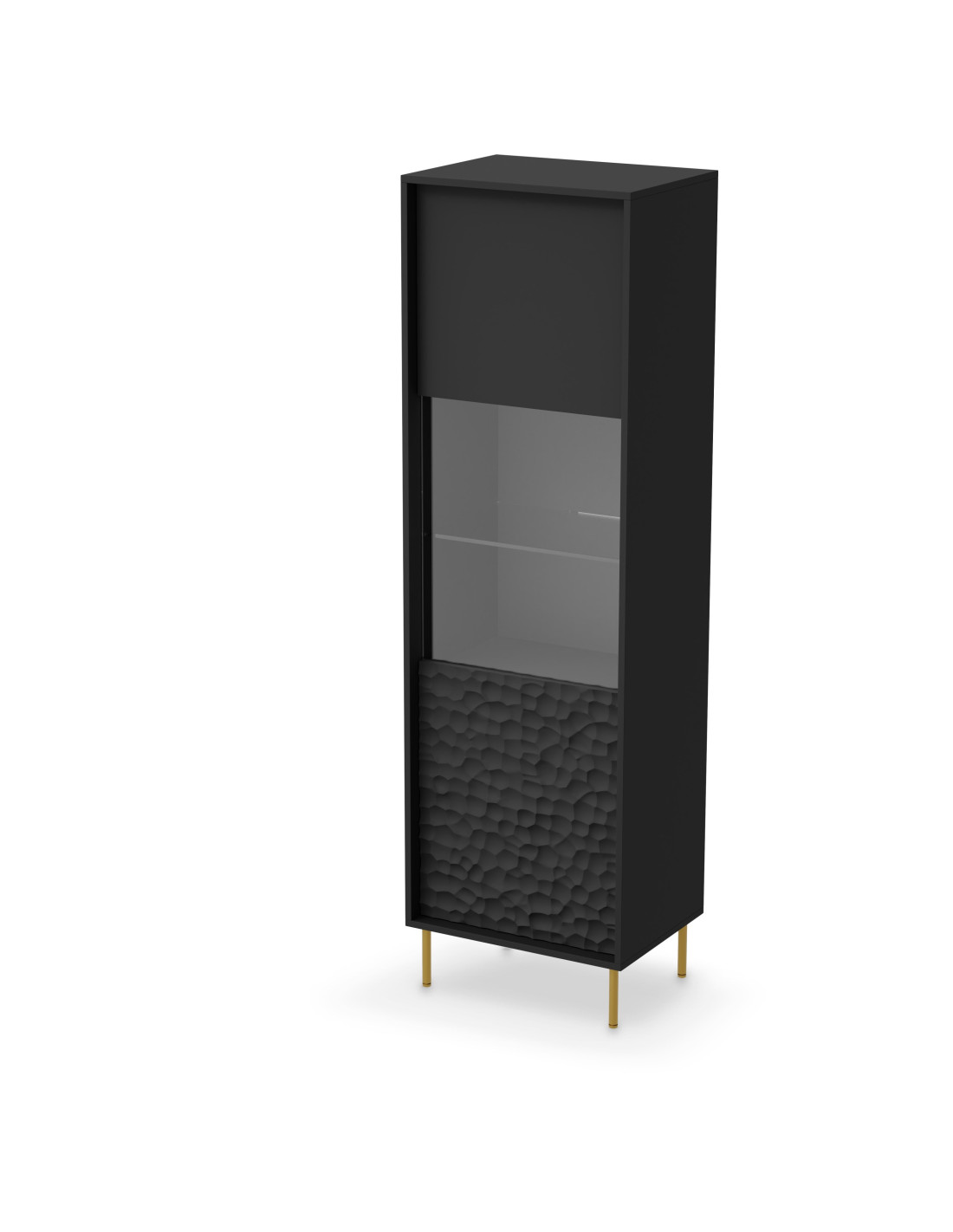 Szukasz mebla, który spełni Twoje oczekiwania? Oto on! Witryna BULLET łączy w sobie nowoczesny design z luksusowymi akcentami. Jej wąska, lecz wysoka konstrukcja sprawia, że doskonale wkomponowuje się w każde wnętrze, oferując jednocześnie przestrzeń do eksponowania Twoich ulubionych przedmiotów. Czarne wykończenie i złote nogi nadają jej elegancji, a teksturowany wzór na dolnej części frontu przyciąga wzrok i dodaje charakteru.