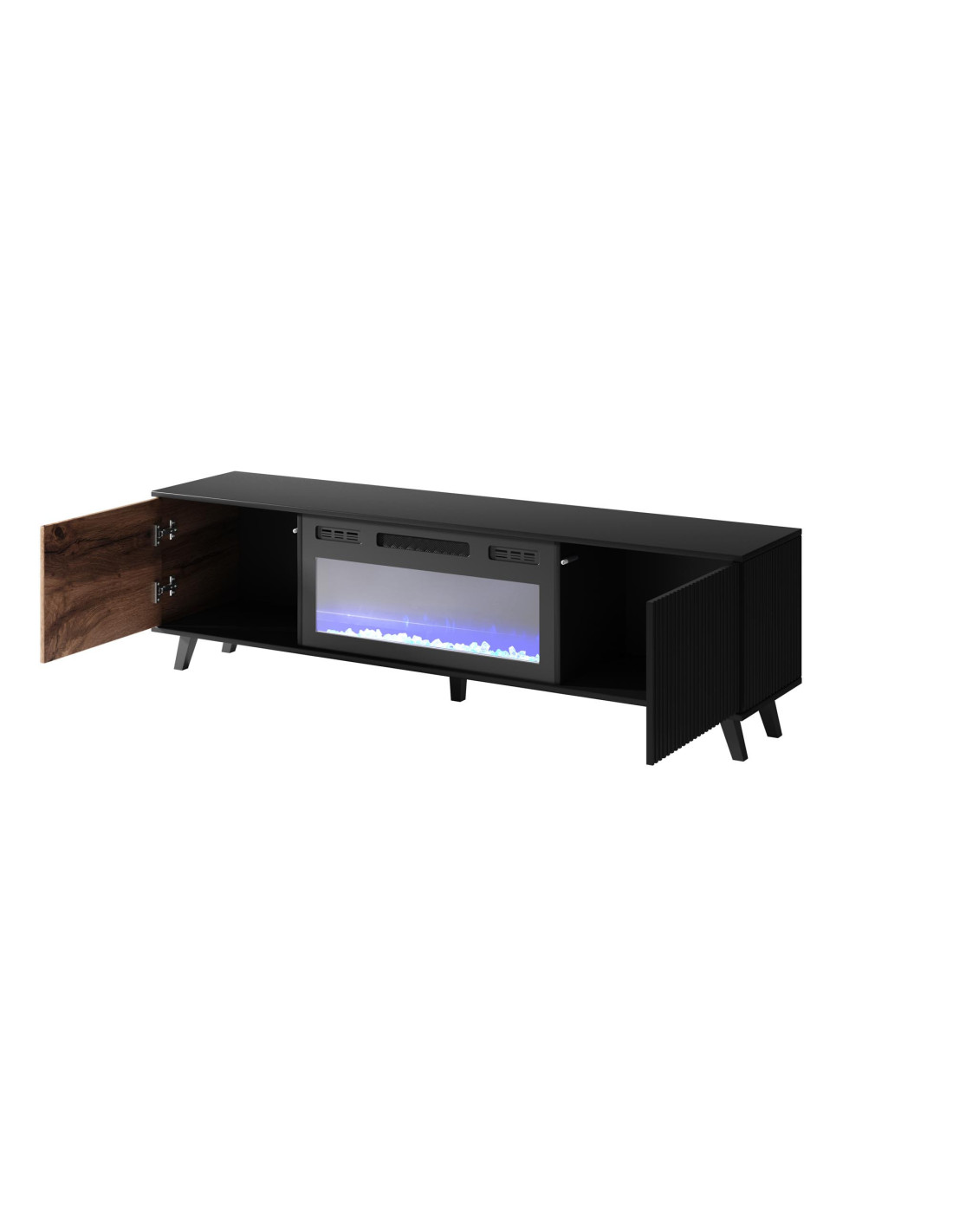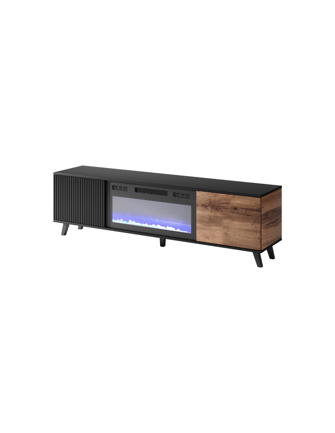 Szukasz rozwiązania? Oto ono! Stolik RTV RANDOM to znakomite połączenie nowoczesnego designu z ciepłem domowego ogniska. Jego prostokątny kształt oraz eleganckie wykończenie w kolorze dębu wotan i czerni tworzą harmonijną całość, która doskonale wpisuje się w nowoczesne oraz industrialne wnętrza. Wbudowany kominek z efektem płomienia dodaje niepowtarzalnego klimatu, sprawiając, że każdy wieczór staje się wyjątkowy.