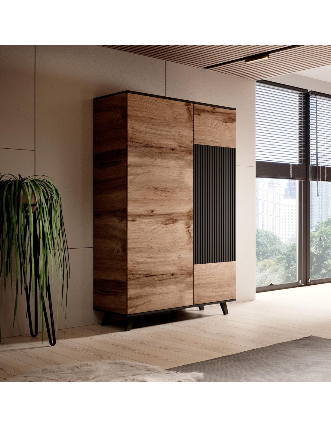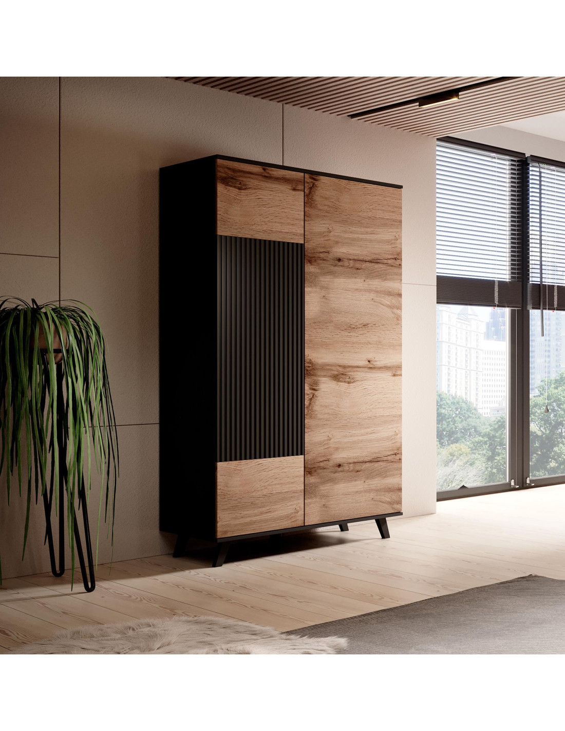 Wzbogać swoje wnętrze! Szafa RANDOM to wyjątkowy mebel, który łączy nowoczesny design z funkcjonalnością, idealnie wpisując się w styl industrialny. Jej drzwi w kolorze dąb wotan, z widocznym usłojeniem, nadają naturalny wygląd, a czarne, pionowe ryflowanie na jednej z części drzwi dodaje charakteru i elegancji. Prostokątny kształt oraz cztery krótkie, czarne nóżki sprawiają, że szafa staje się nie tylko praktycznym elementem, ale także modnym akcentem w każdym pomieszczeniu.
