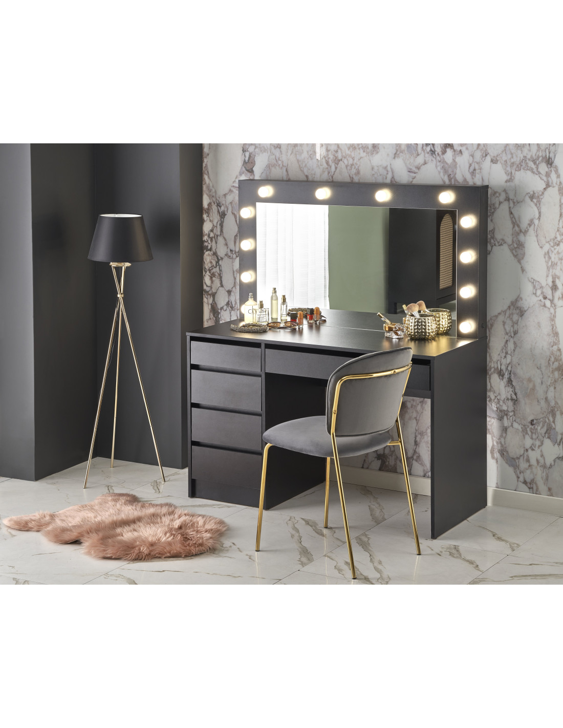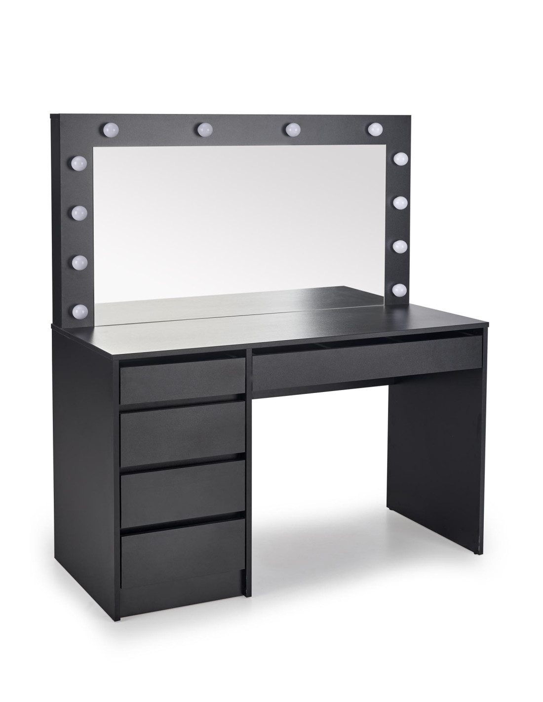Toaletka została wyposażona w duże lustro otoczone dziesięcioma żarówkami LED, które zapewniają doskonałe oświetlenie podczas codziennej pielęgnacji. Dodatkowo, cztery mniejsze szuflady po lewej stronie oraz jedna szeroka szuflada pod blatem dają możliwość uporządkowanego przechowywania kosmetyków oraz akcesoriów do makijażu. Dzięki nowoczesnym liniom i przemyślanej budowie, toaletka HOLLYWOOD XL stanie się Twoim ulubionym miejscem do codziennych rytuałów.