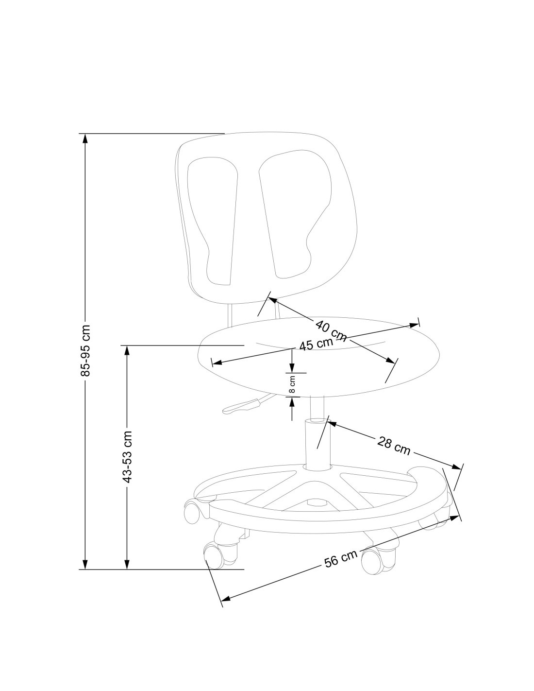 Szerokość wynosi 52 cm, głębokość to 56 cm, a wysokość regulowana jest w zakresie od 85 do 95 cm, z regulacją wysokości siedziska od 43 do 53 cm.