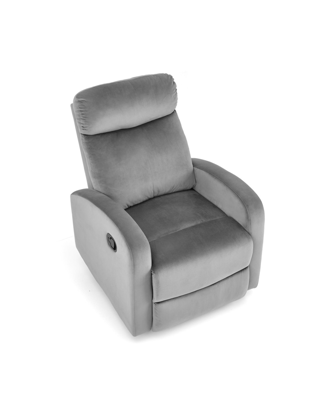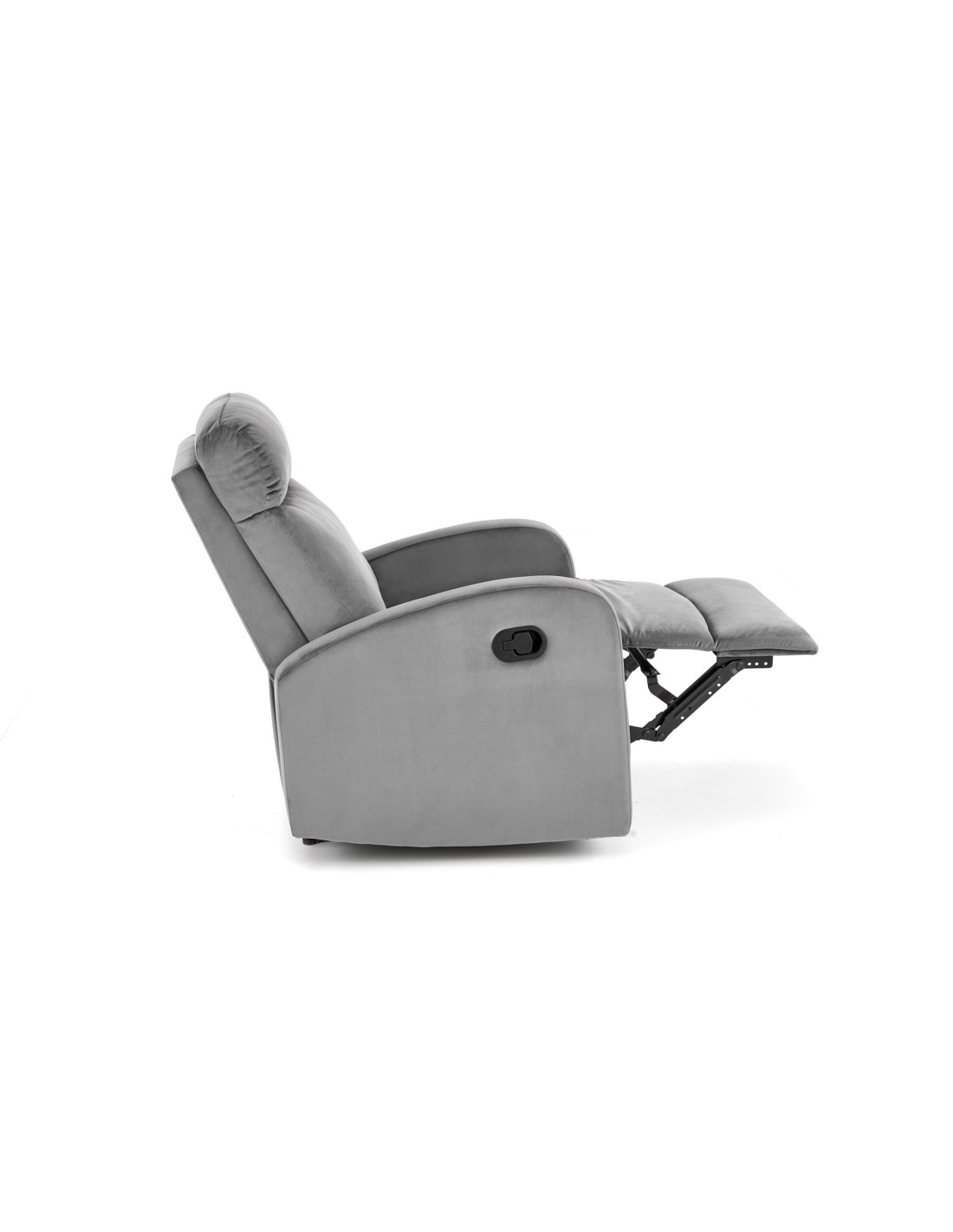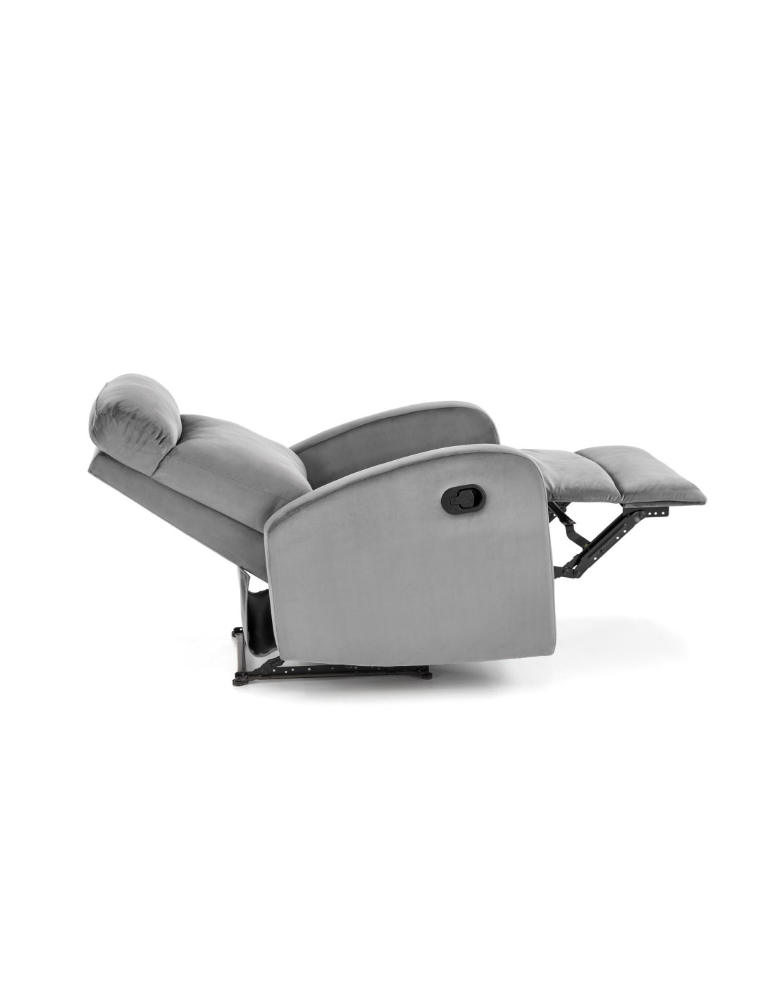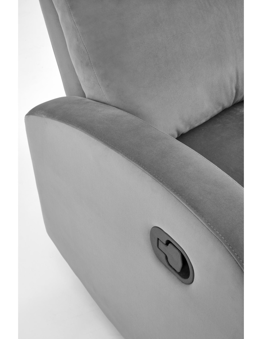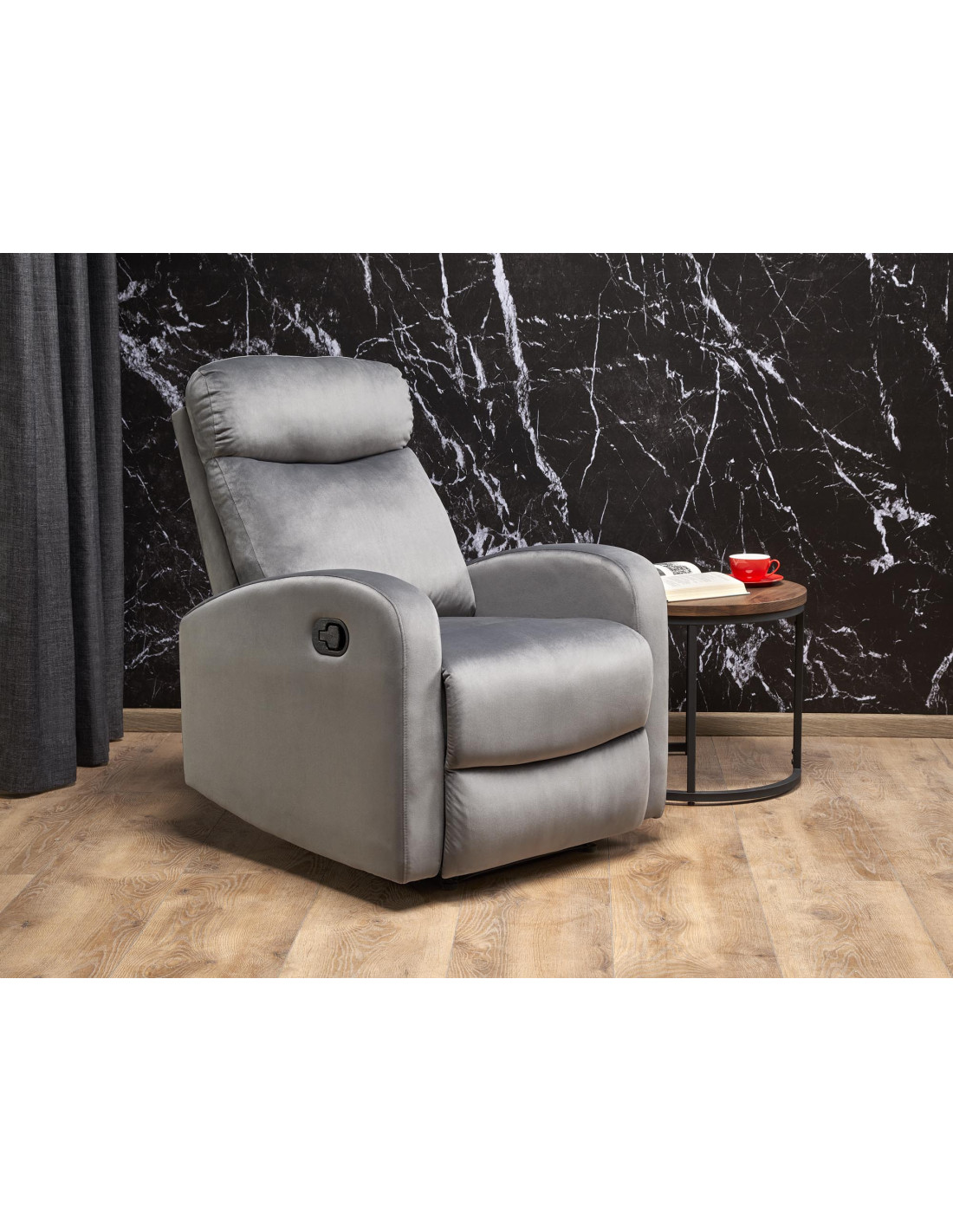Fotel WONDER ma welurowe obicie, regulowane oparcie oraz podnóżek, a także mechanizm rozkładania, który umożliwia szybkie przekształcenie go w wygodne łóżko.