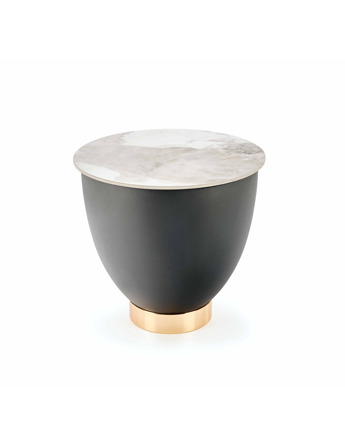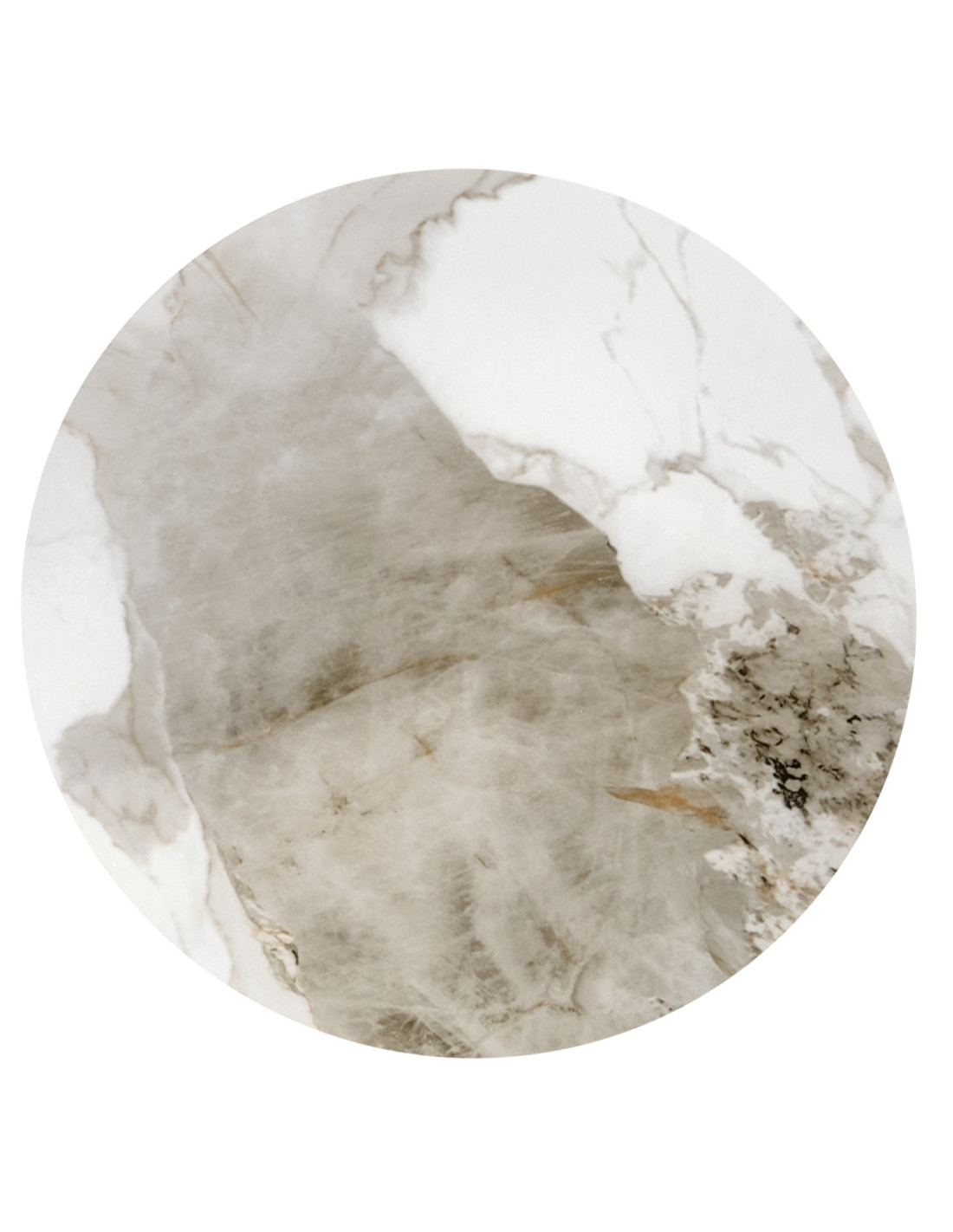 Szukasz rozwiązania? Oto ono! Ława CECILIA S to wyjątkowe połączenie elegancji i nowoczesności. Okrągły blat wykonany z ceramiki imitującej biały marmur nadaje jej wyrafinowanego charakteru, który pięknie dopełnia każde wnętrze. Podstawa w kształcie odwróconego stożka, wykonana z popielatego materiału, wprowadza świeży akcent, a złoty pierścień na końcu podstawy dodaje luksusowego wykończenia.