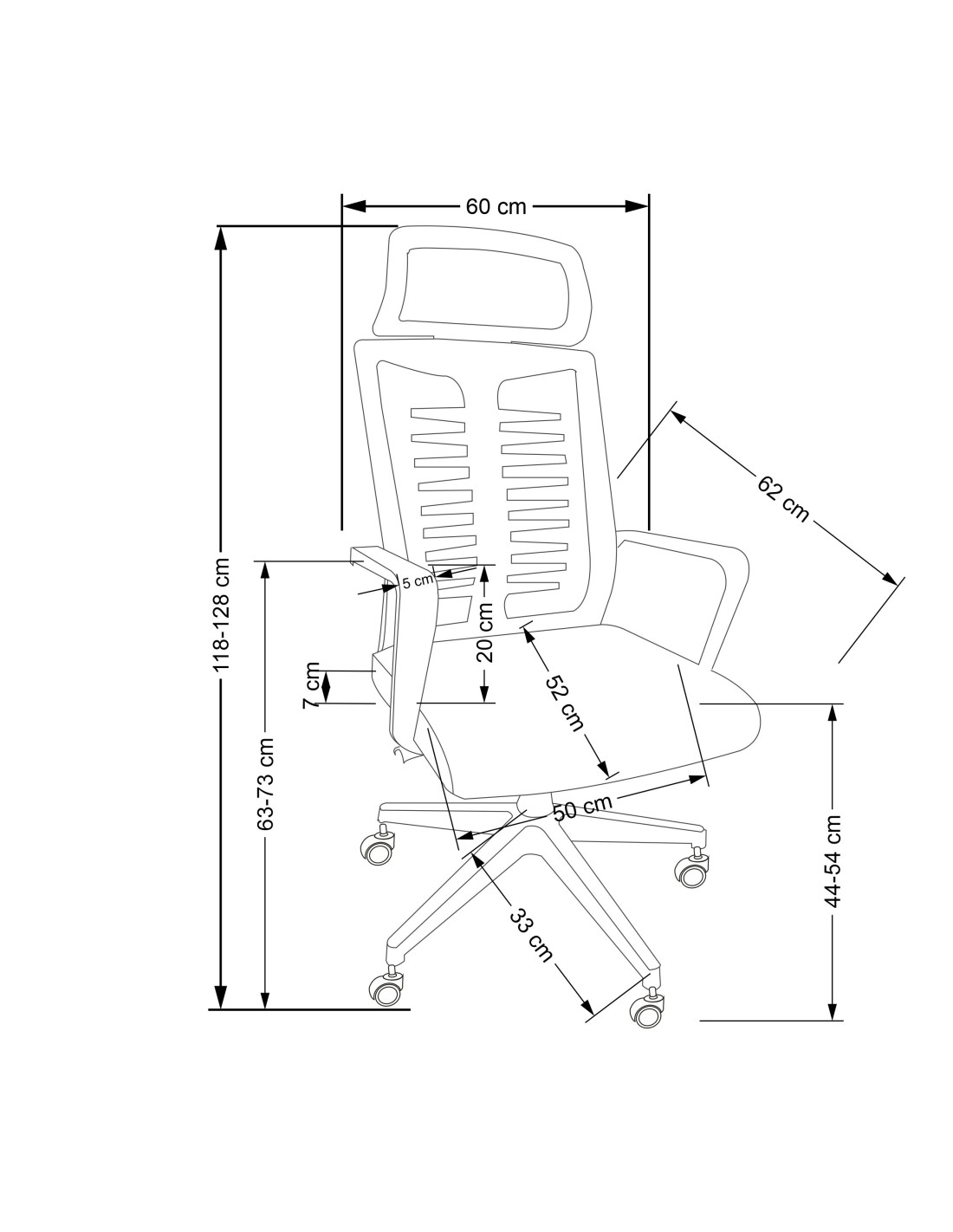 Szerokość wynosi 60 cm, głębokość 62 cm, a wysokość to 118-128 cm, z możliwością regulacji wysokości siedziska od 44 do 54 cm.