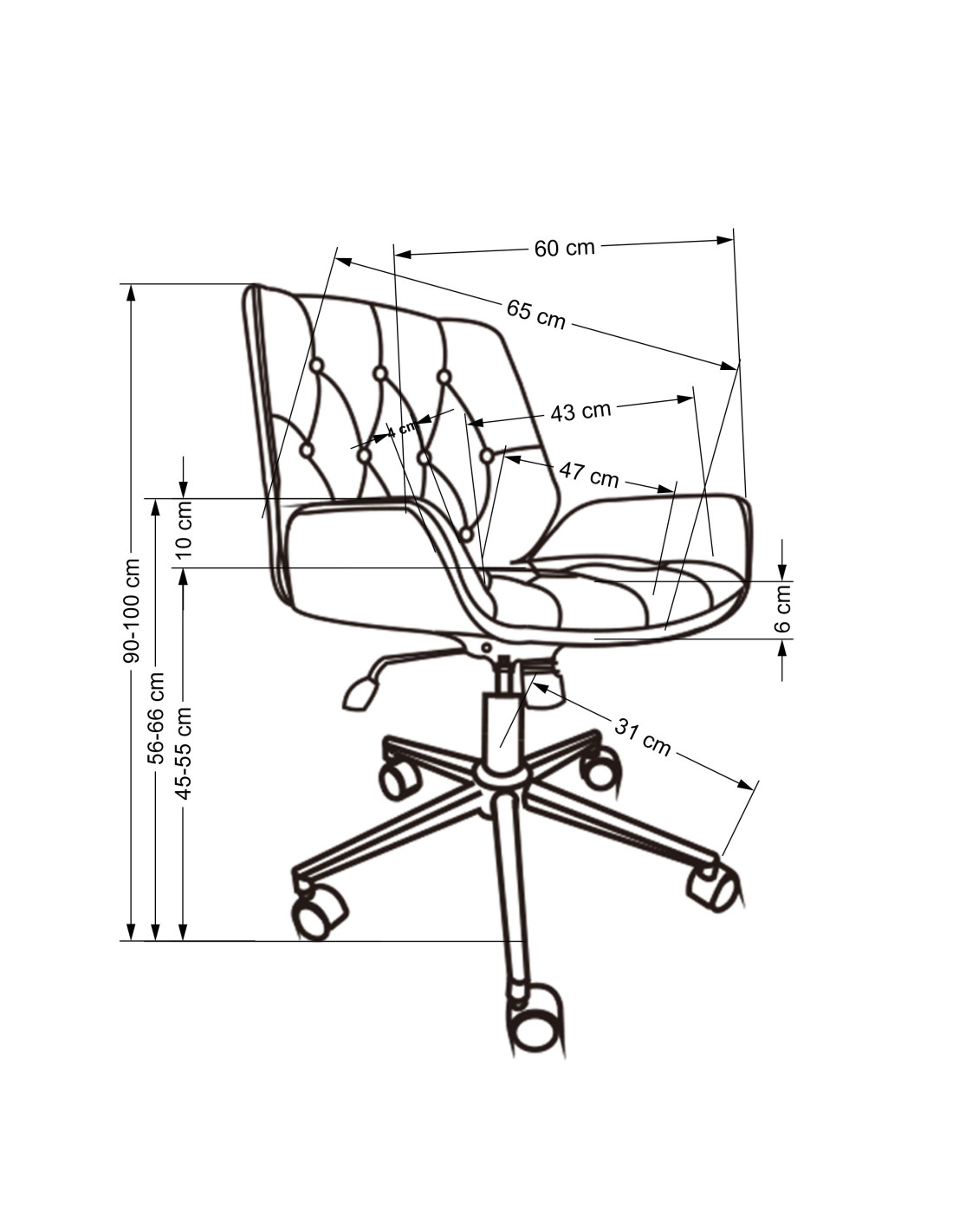 Szerokość wynosi 60 cm, głębokość 65 cm, a wysokość to 90-100 cm, z możliwością regulacji wysokości siedziska od 45 do 55 cm.