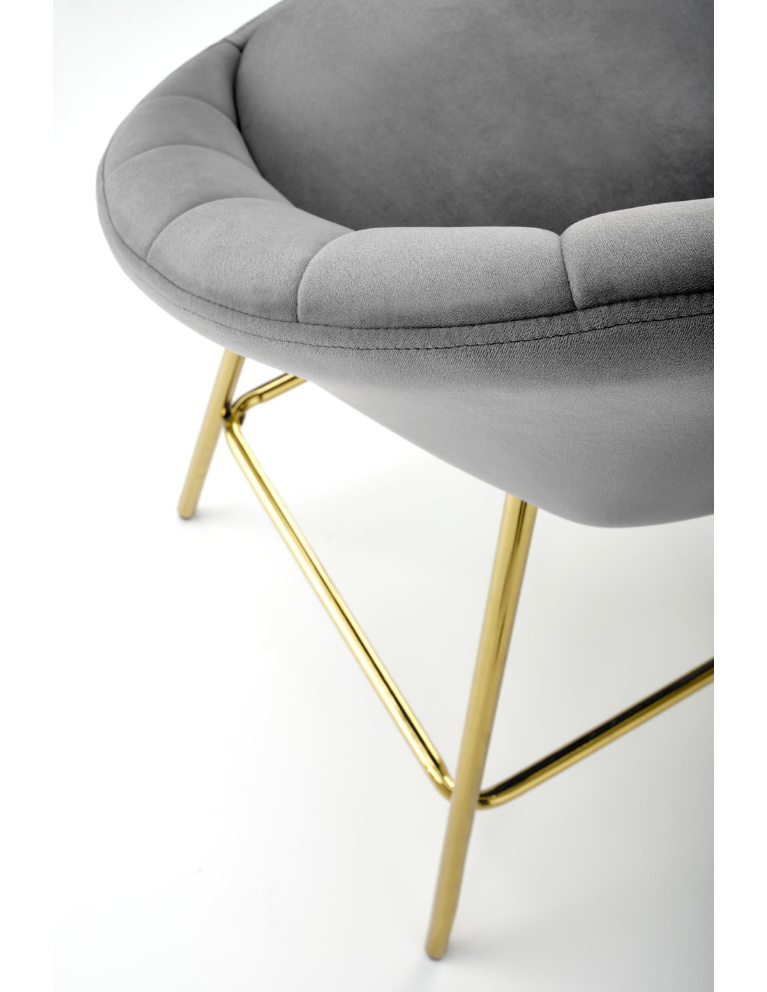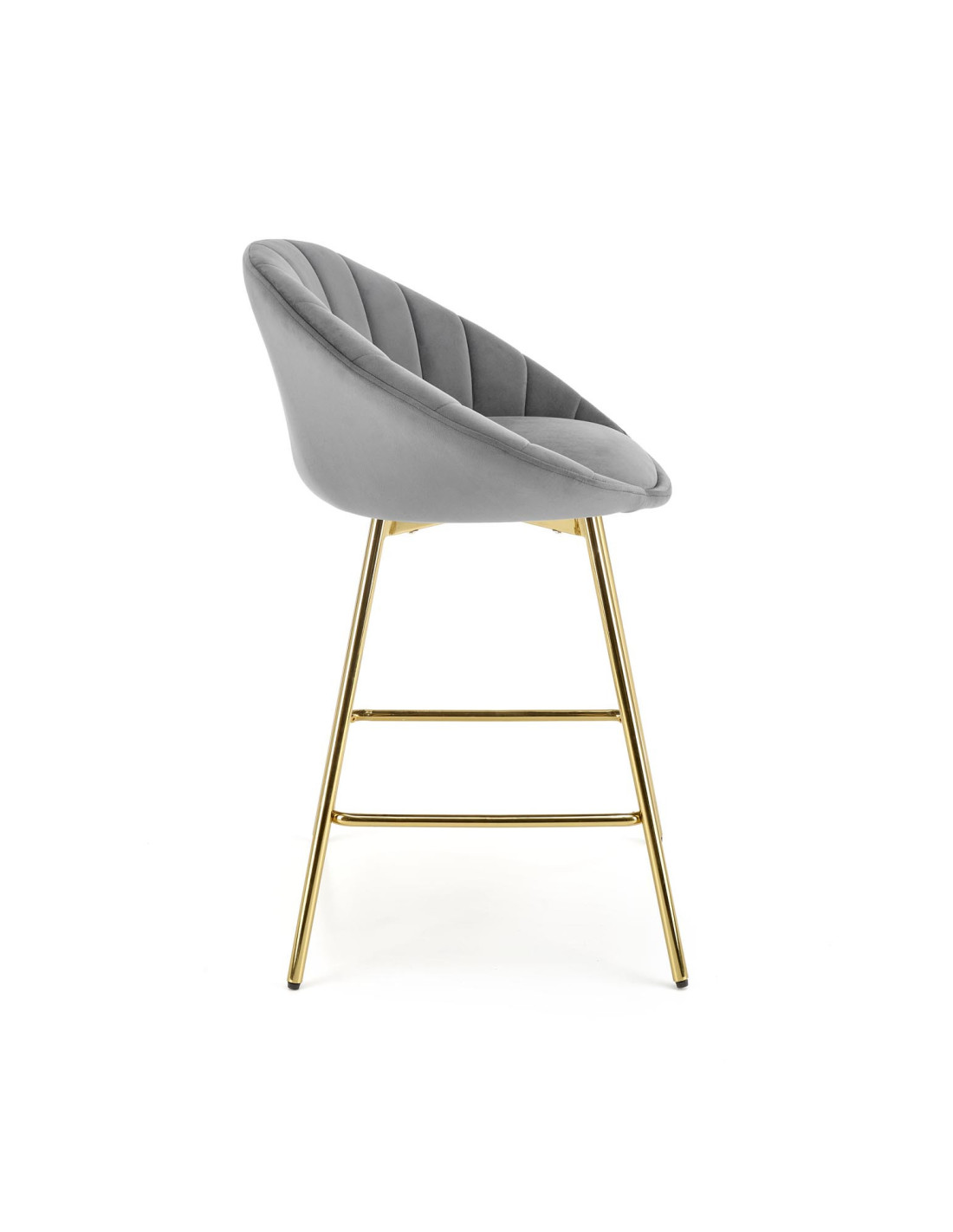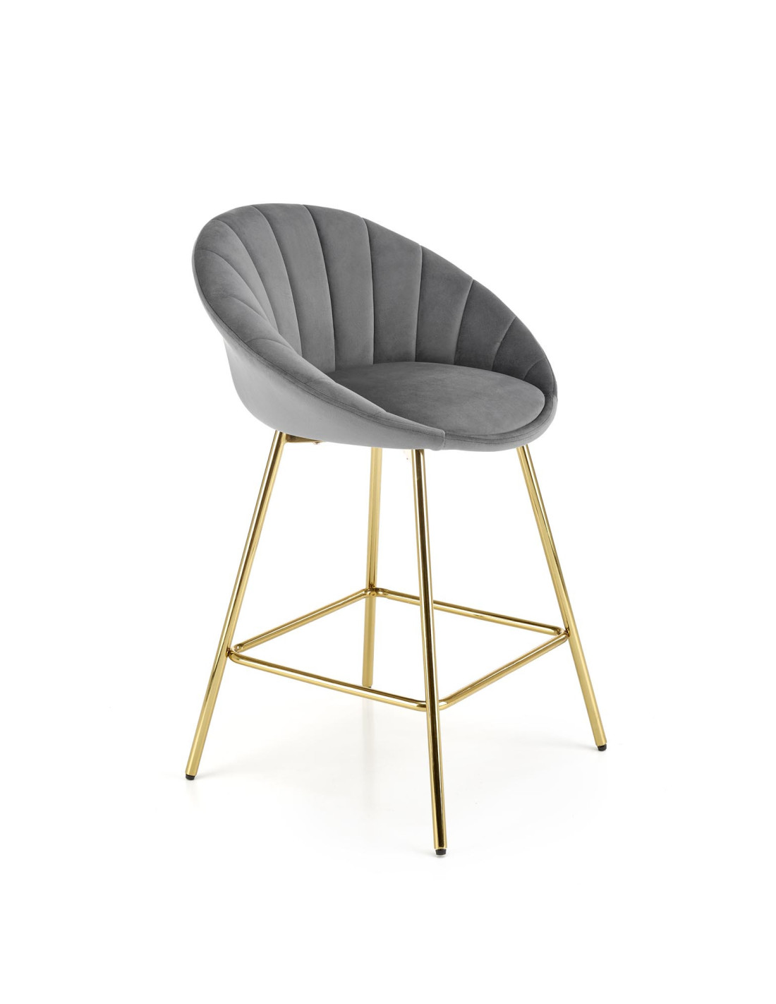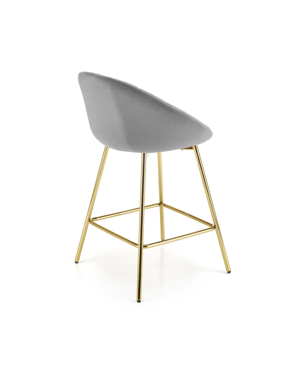 Podkreśl elegancję swojego wnętrza z hokerem H112, który łączy nowoczesny design z luksusowym wykończeniem. Siedzisko w kolorze popielatym, wykonane z tkaniny Bluvel 14, zachwyca zaokrąglonym kształtem oraz pionowymi przeszyciami, które nadają mu wyjątkowy pikowany wygląd. Złote metalowe nogi dodają mu niepowtarzalnego charakteru, a ich smukła konstrukcja zapewnia stabilność i elegancję.