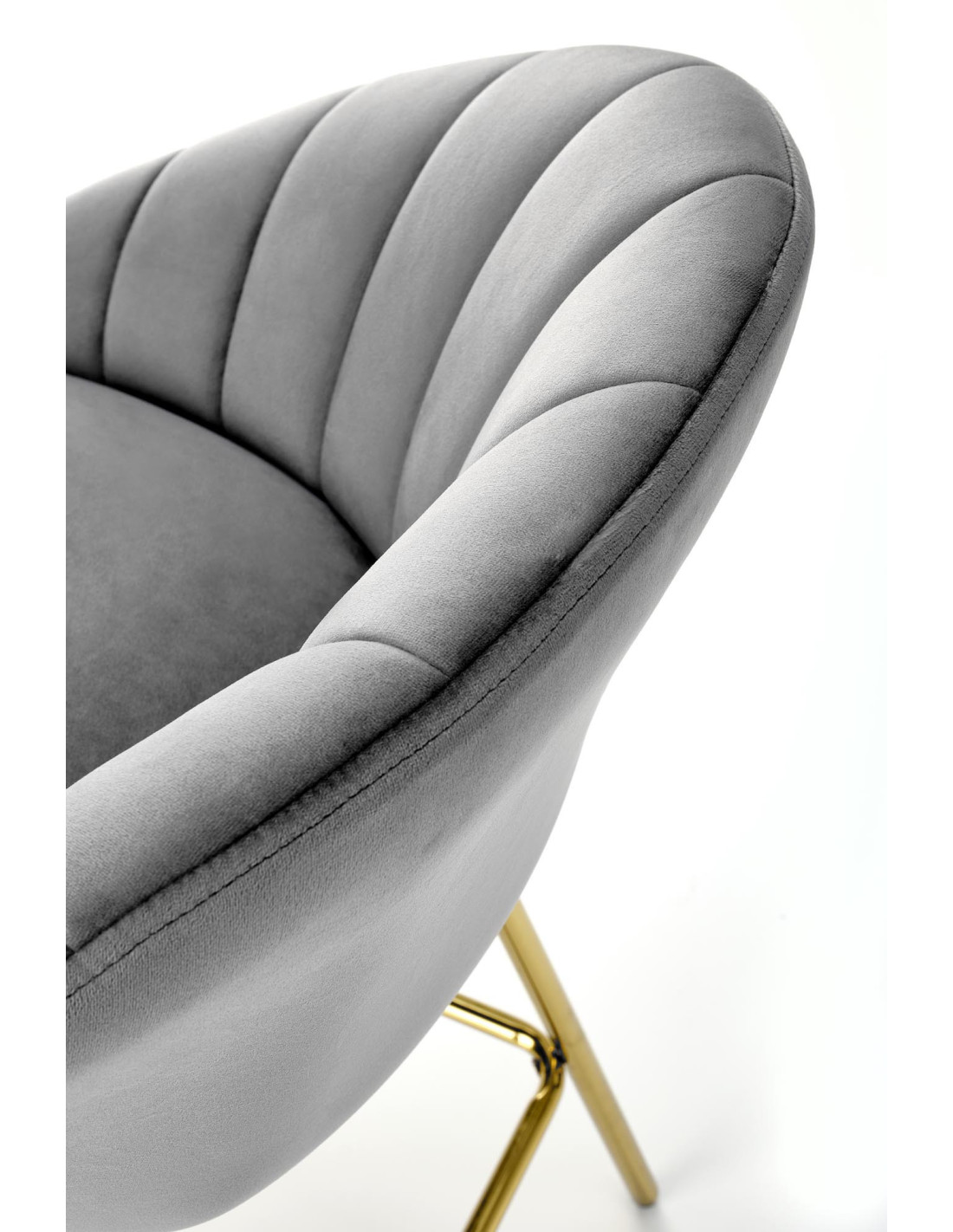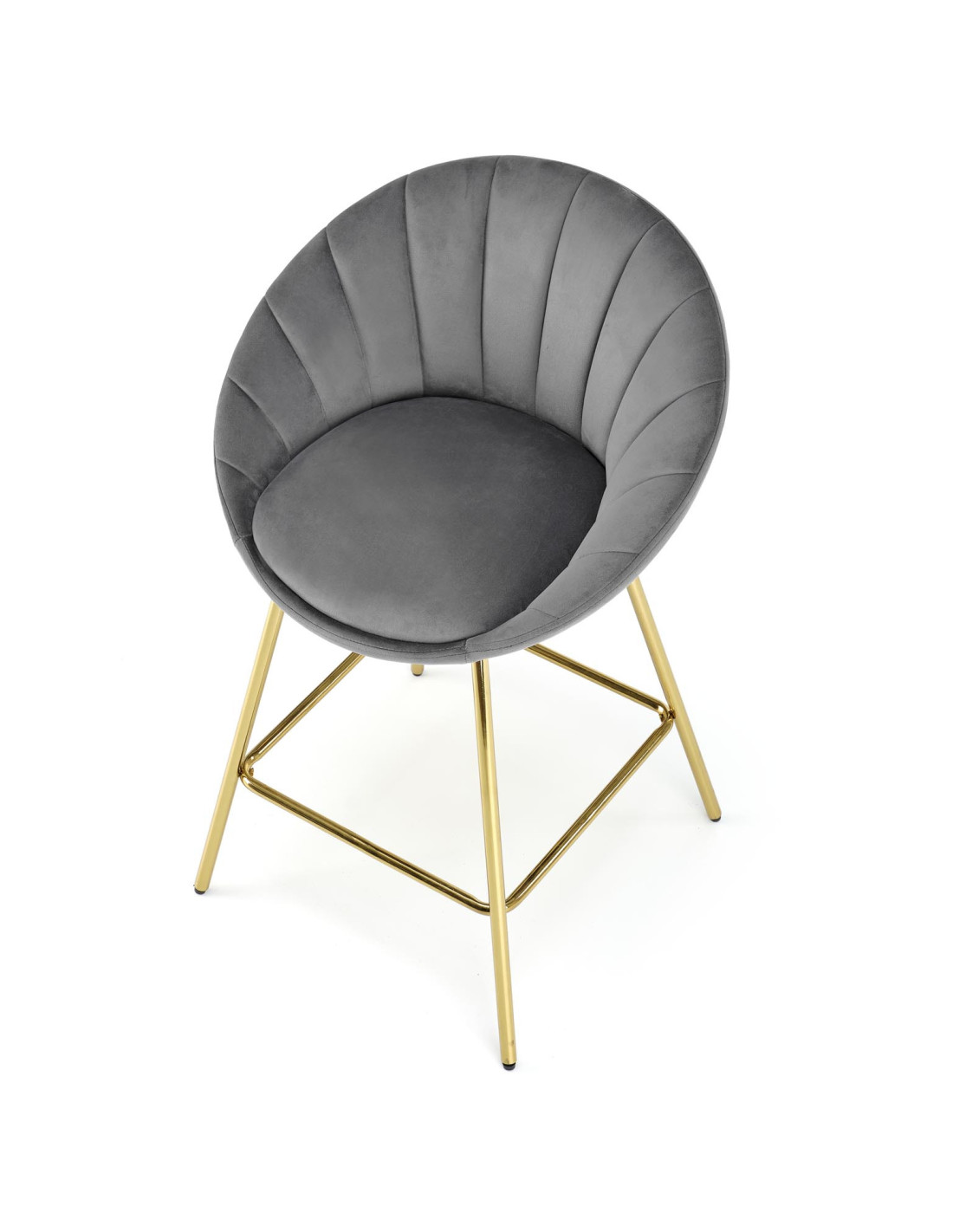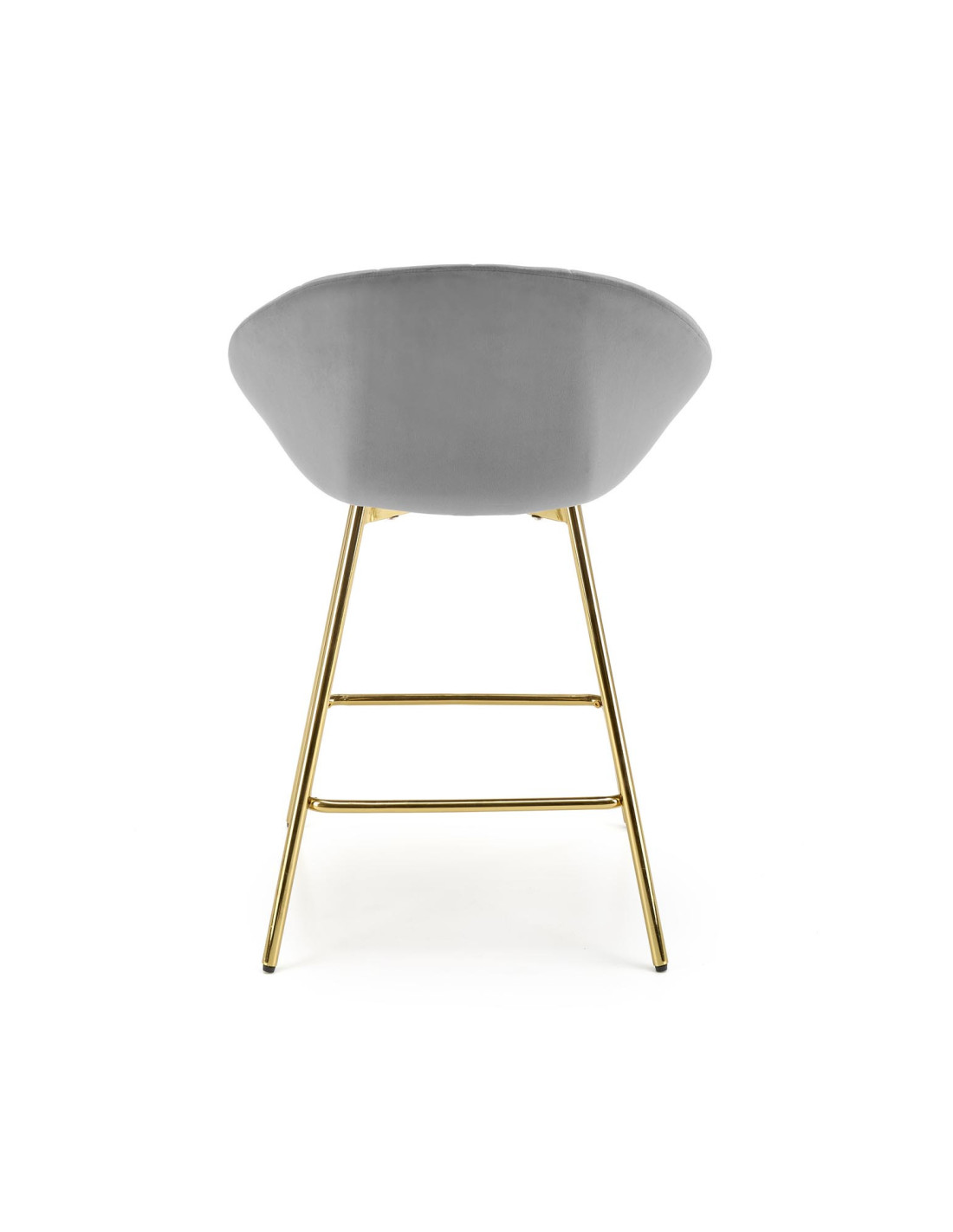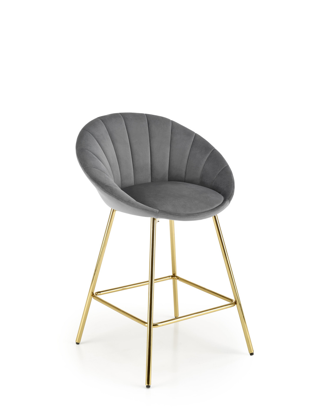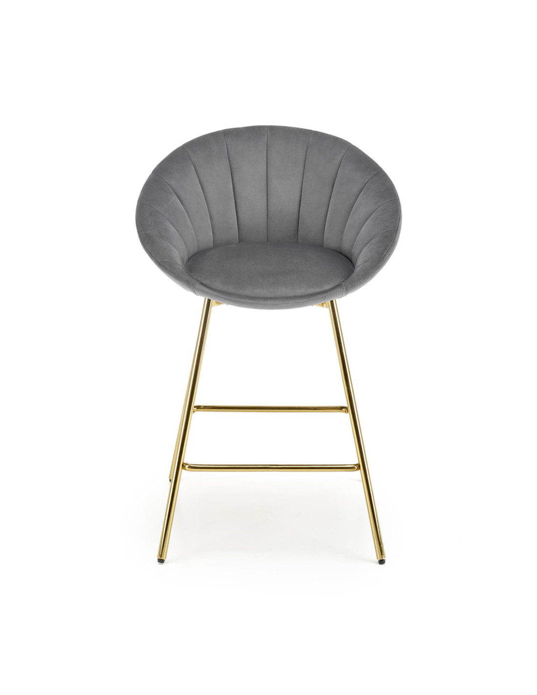 Podkreśl elegancję swojego wnętrza z hokerem H112, który łączy nowoczesny design z luksusowym wykończeniem. Siedzisko w kolorze popielatym, wykonane z tkaniny Bluvel 14, zachwyca zaokrąglonym kształtem oraz pionowymi przeszyciami, które nadają mu wyjątkowy pikowany wygląd. Złote metalowe nogi dodają mu niepowtarzalnego charakteru, a ich smukła konstrukcja zapewnia stabilność i elegancję.