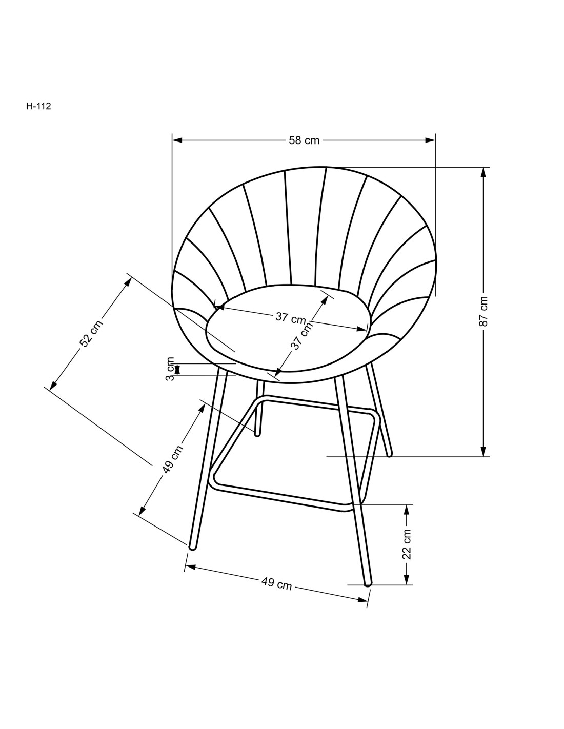 Szerokość wynosi 58 cm, głębokość 52 cm, a wysokość to 87 cm, z możliwością regulacji wysokości siedziska do 62 cm.