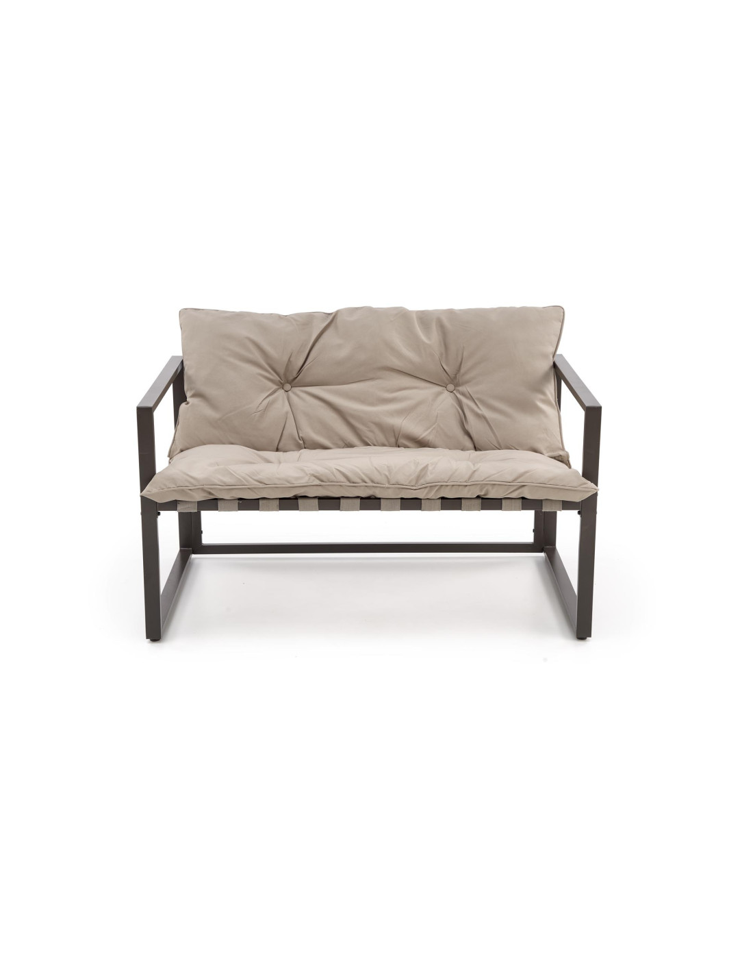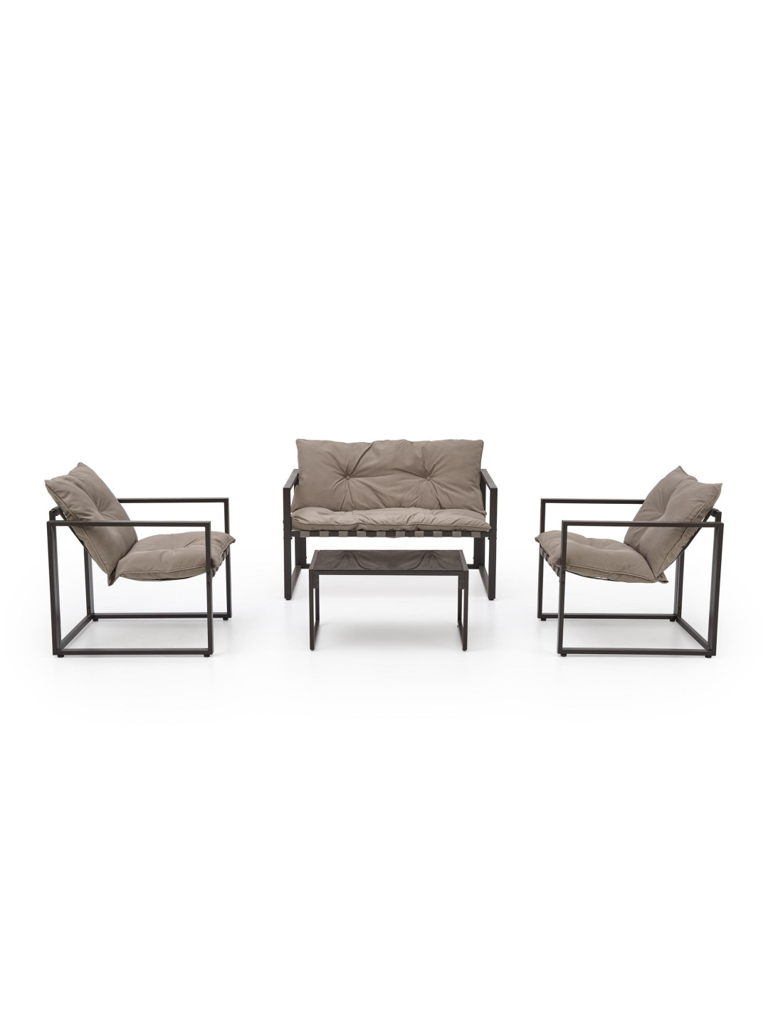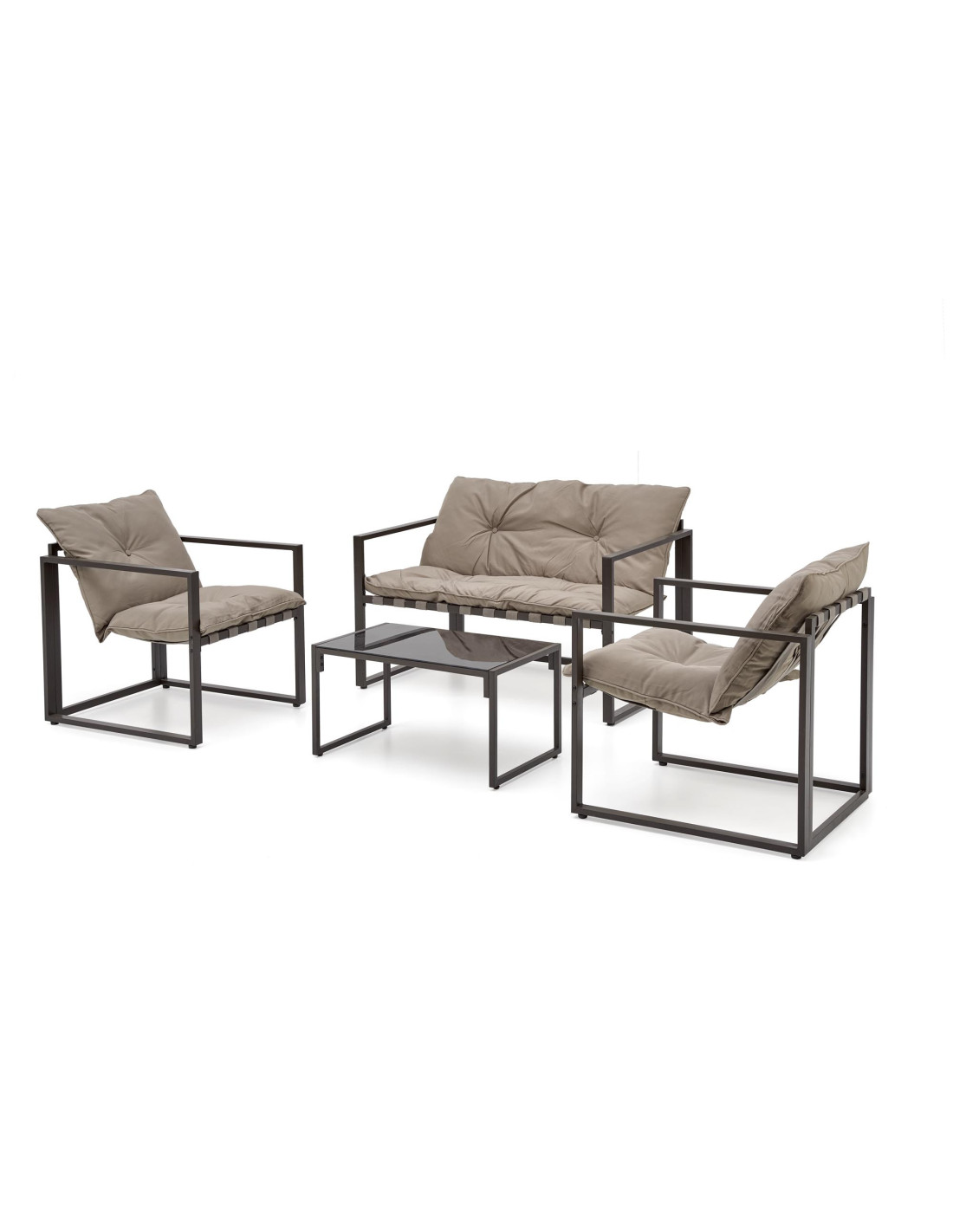 Wszystkie elementy zestawu mają metalową konstrukcję w kolorze ciemnoszarym, co gwarantuje stabilność. Beżowe poduszki z pikowanym wzorem nie tylko pięknie się prezentują, ale również dodają przytulności. Dzięki szklanej ławie możesz z łatwością podać napoje lub przekąski podczas spotkań z rodziną i przyjaciółmi.