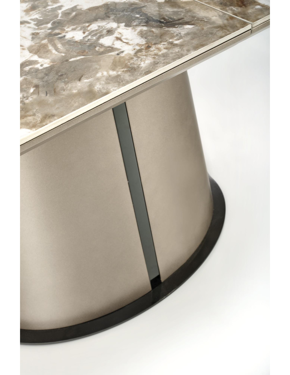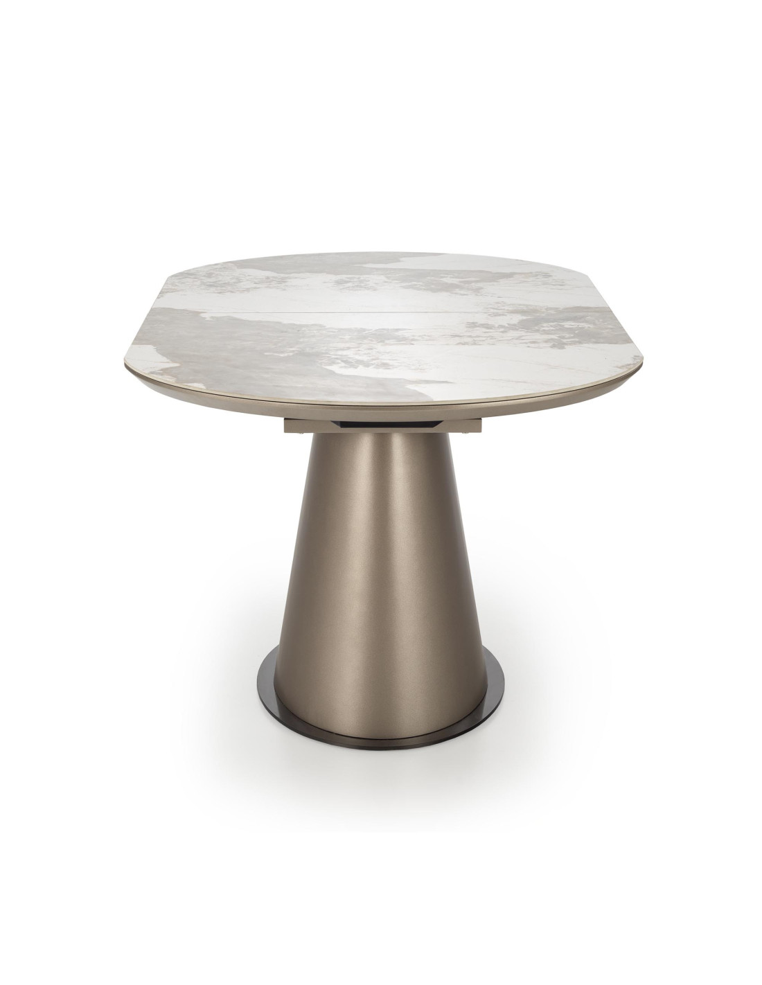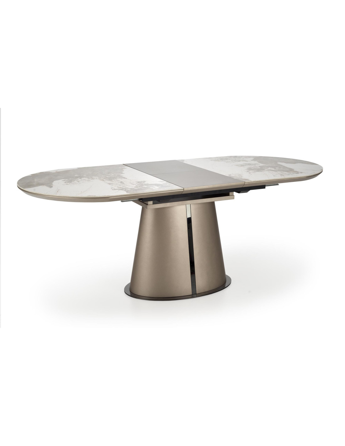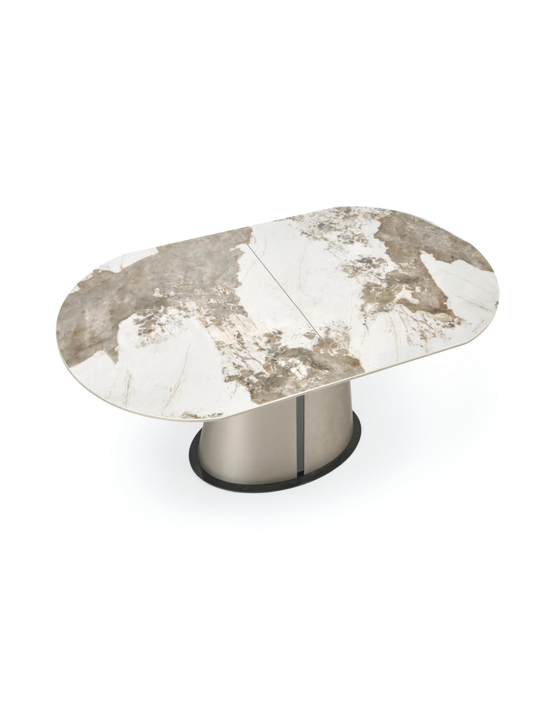 Stwórz doskonałe wnętrze z rozszerzanym stołem ROBINSON, który łączy w sobie elegancję oraz nowoczesność! Ten stół o owalnym kształcie, wykonany z ceramiki w kolorze beżowego marmuru oraz MDF lakierowanego, wprowadza stylowy akcent do każdej jadalni. Jego masywna, stożkowata podstawa w kolorze czarnym zapewnia stabilność i wytrzymałość, a subtelne detale czynią go wyjątkowym elementem wystroju.