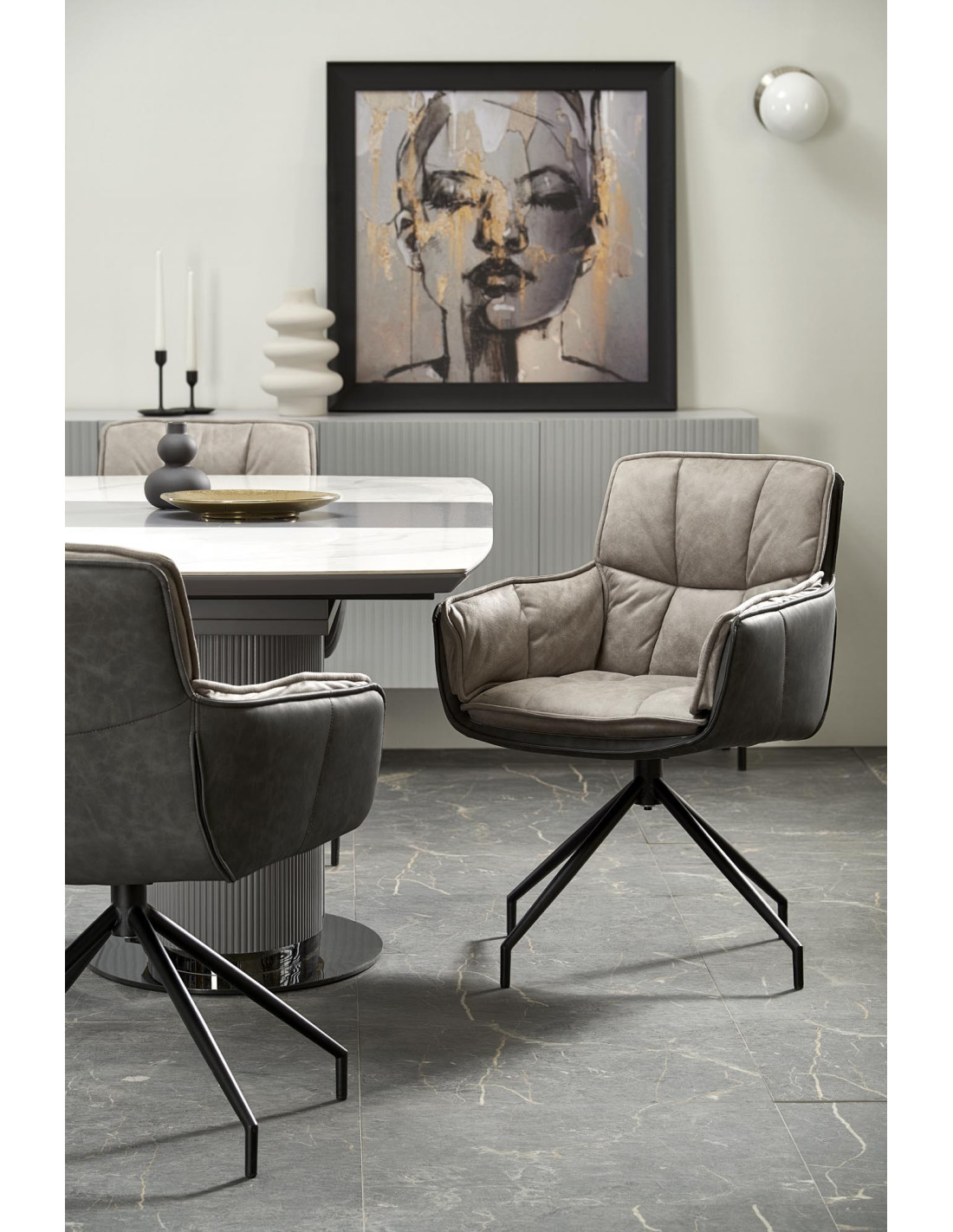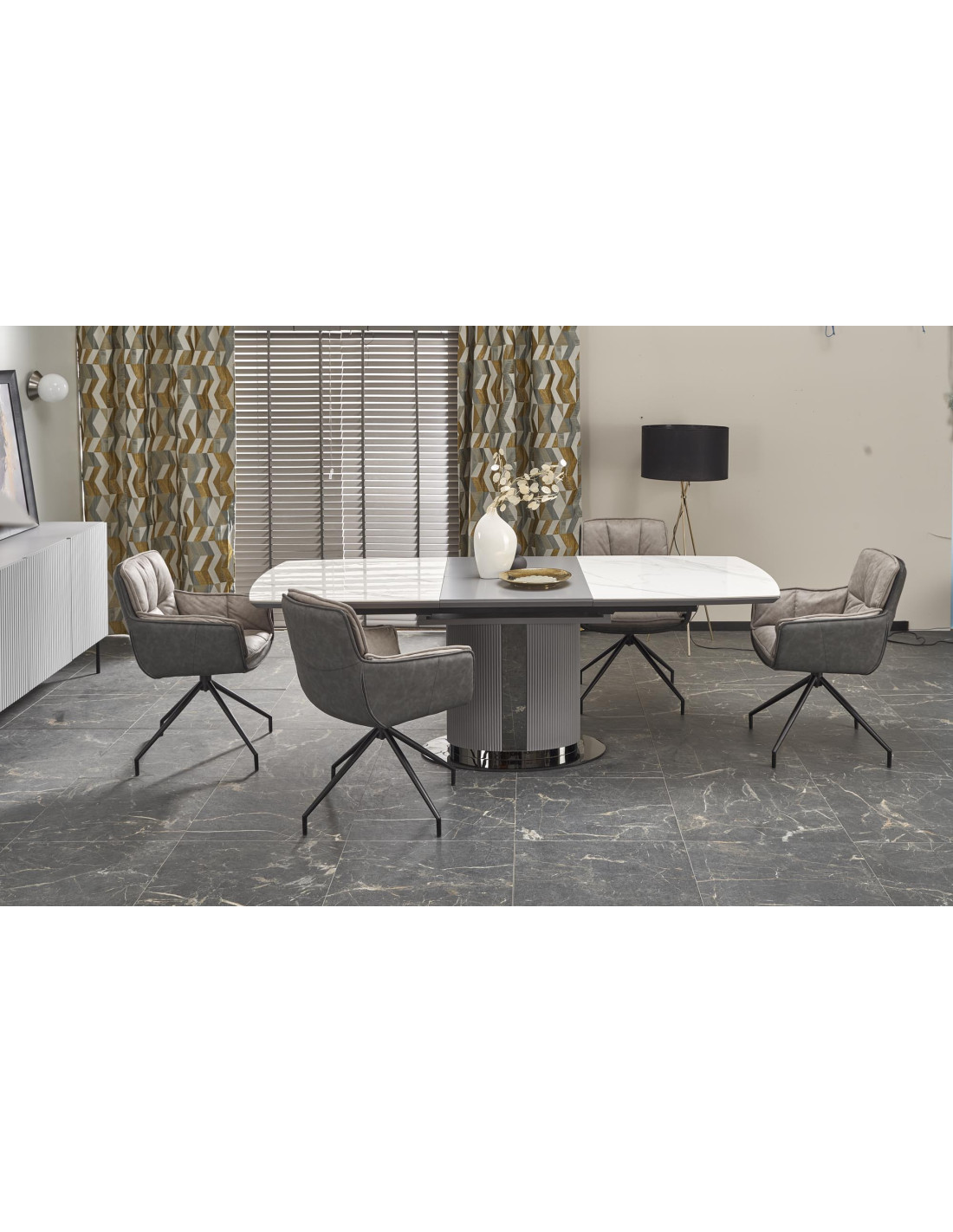 Przedstawiamy Ci rozszerzany stół DANCAN, który zachwyca swoim eleganckim wyglądem i praktycznością! Ten stół o blacie ceramicznym w kolorze białego marmuru oraz popielatej podstawie łączy nowoczesny design z funkcjonalnością. Jego prostokątny kształt z zaokrąglonymi rogami sprawia, że staje się centralnym punktem każdej jadalni, dodając niepowtarzalnego charakteru przestrzeni.