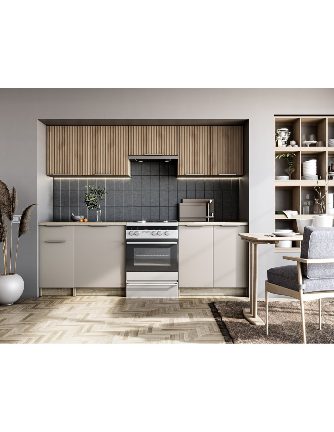 Ożyw swoją przestrzeń! Zestaw kuchenny Pola to doskonałe połączenie nowoczesnego stylu z funkcjonalnością. Jego minimalistyczny kształt oraz harmonijne kolory sprawiają, że stanie się on sercem każdej kuchni. Szafki dolne o gładkich frontach w kolorze popielatym oraz górne z pionowymi żłobieniami w odcieniu dębu sonoma tworzą elegancki duet, który zachwyci każdego.