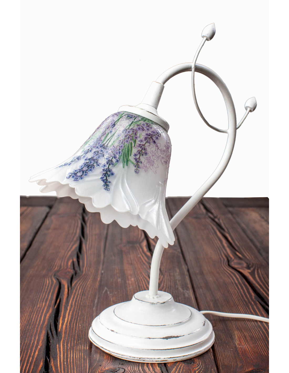 Lampka biurkowa prowansalska biała, ręcznie przecierana z kloszem z motywem lawendy. Max moc z użyciem żarówek typu led to ok.100W. W rodzinie tych lamp dostępny jest kinkiet i żyrandol 3 i 5-płomienny. Lampka ozdobi biurko, szafkę nocną w lawendowej sypialni, czy też stolik w rustykalnym salonie. Odnajdzie się również w urokliwej kawiarni pełnej kwiatów.