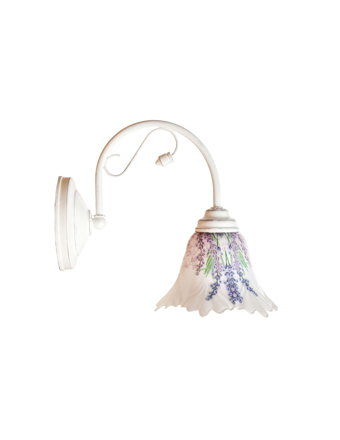 Kinkiet jedno punktowy prowansalski biały, ręcznie przecierany z kloszem z motywem lawendy ręcznie malowanym. Max moc z użyciem żarówek typu led to ok.100W. W rodzinie tych lamp dostępny jest jeszcze żyrandol 3pkt.,5pkt. i lampka biurkowa.