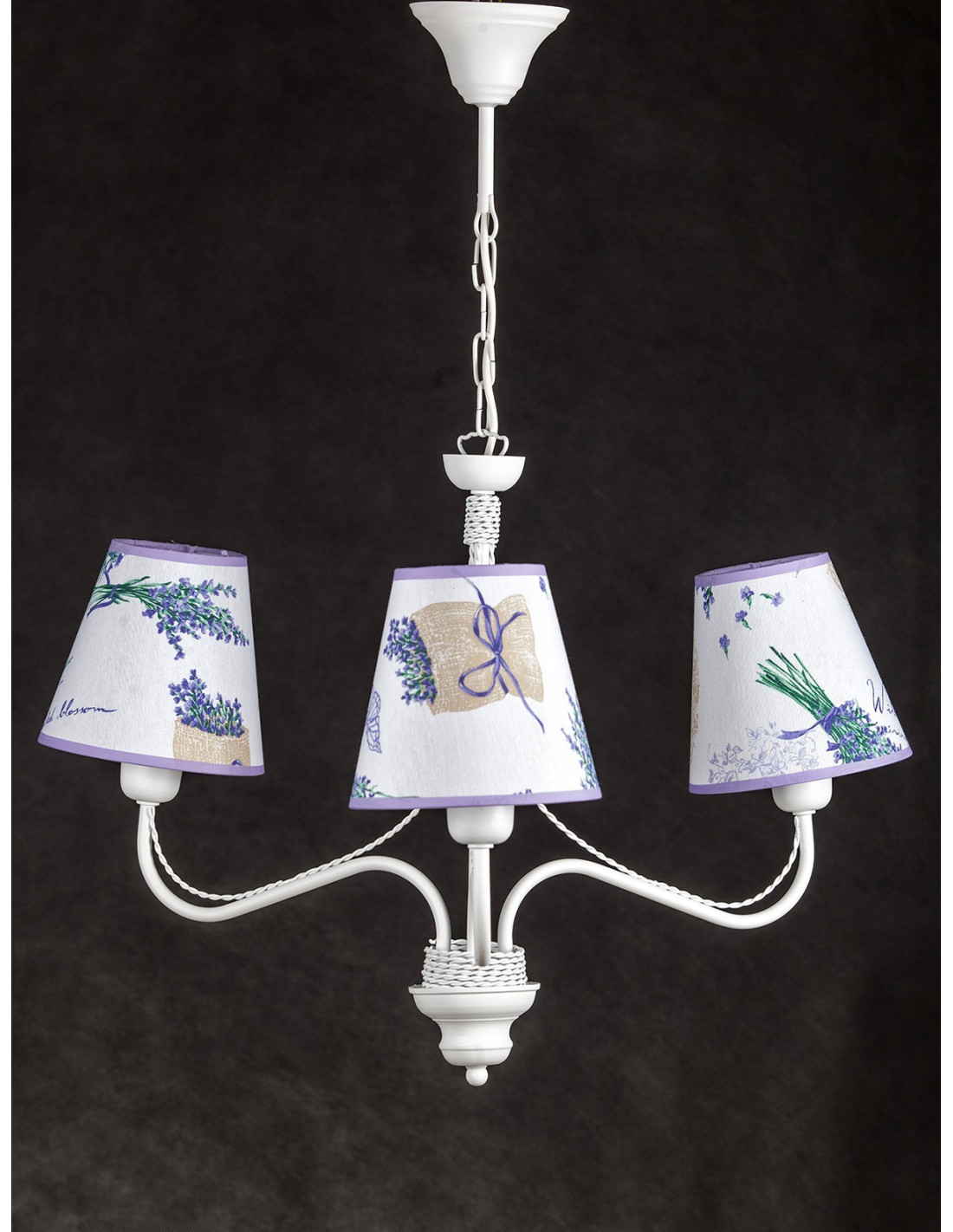 Żyrandol prowansalski KATRIN biały z abażurami z motywem kwiatów lawendy jest lampą trzyramienną, w której jest możliwość świecenia żarówek 1, 2 i 3. Abażury do tej lampy są szyte ręcznie i materiał został podklejony transparentnym pcv co pozwoli na długie użytkowanie tych abażurów. Kształt żarówek przy lampach z abażurami jest nieistotny bo ich nie widać.