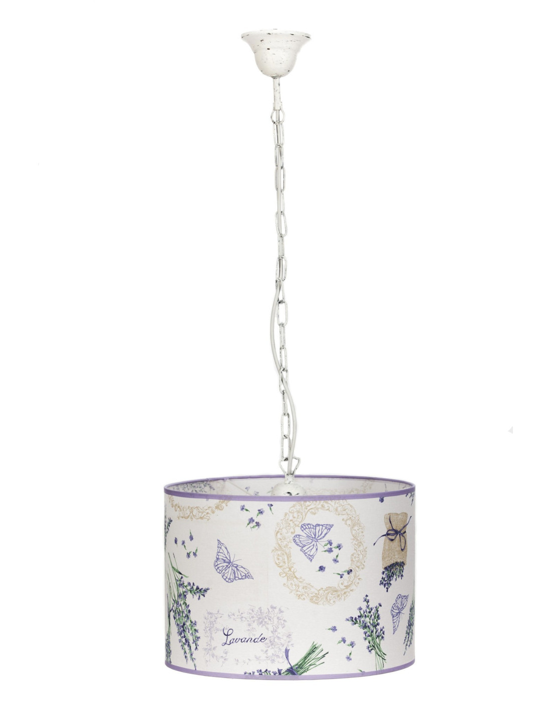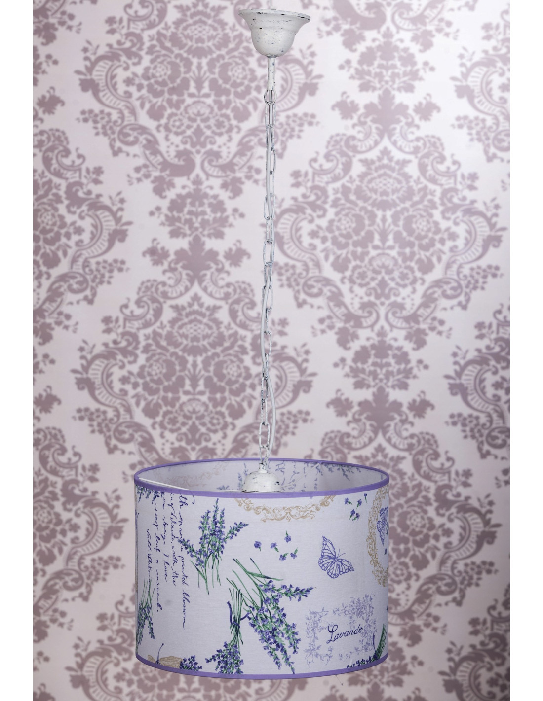 LAMPA PROWANSALSKA LAWENDA jest wykonana w całości ręcznie, począwszy od łańcucha w stylu shabby chic i abażura z motywem kwiatowym lawendy szytego ręcznie. Dominującymi kolorami jest biel i fiolet z małymi wtrąceniami zieleni. Praktycznie pasuje do każdego wnętrza robionego w stylu prowansalskim.