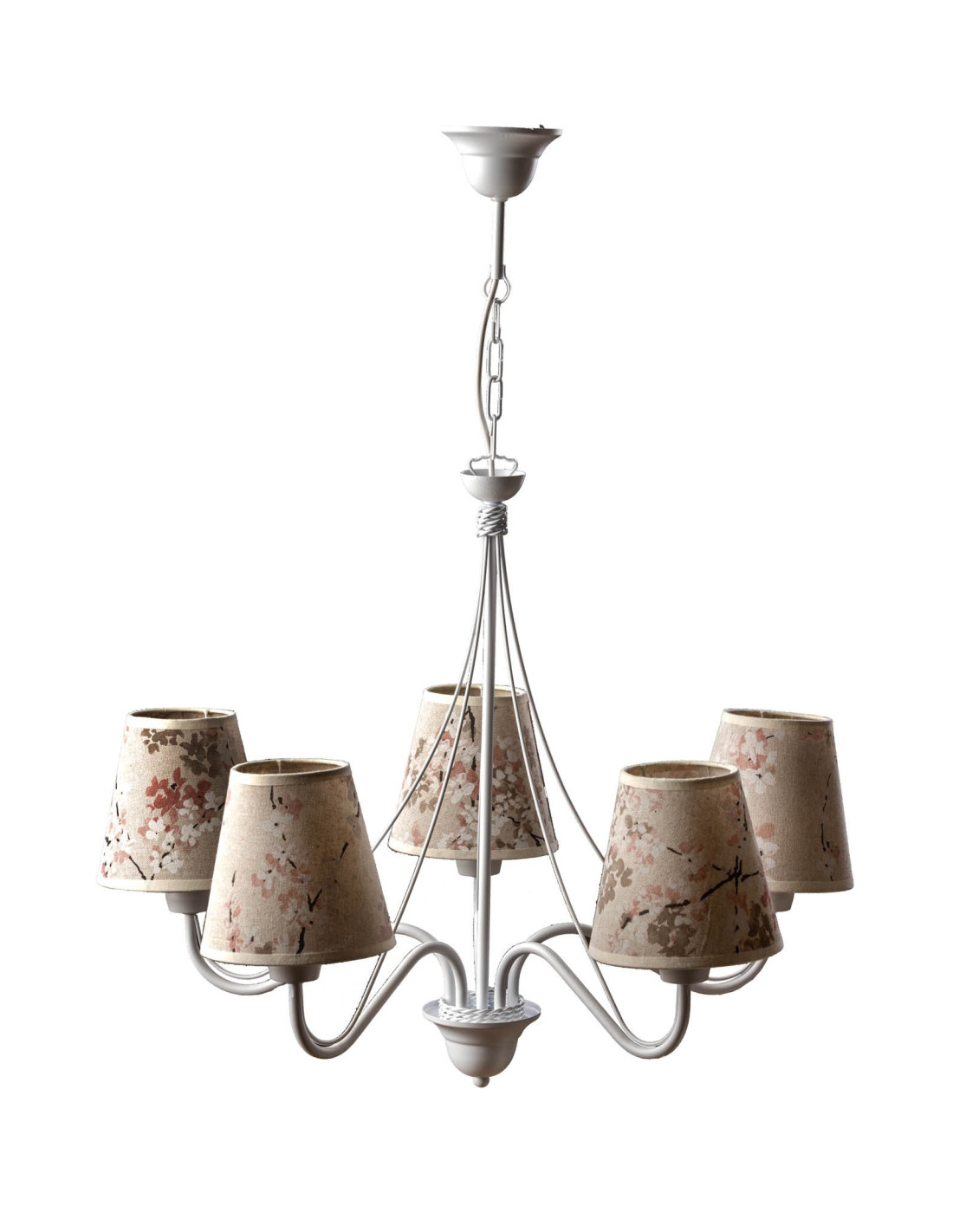 Ekskluzywny żyrandol prowansalski KATRIN biały z abażurami z motywem kwiatów wiśni jest lampą pięcioramienną, w której jest możliwość świecenia żarówek 2, 3 i 5. Abażury do tej lampy są szyte ręcznie z postarzanego lnu, dodatkowo materiał został podklejony transparentnym PCV co pozwoli na długie użytkowanie tych abażurów. Konstrukcja żyrandola jest wykonana z elementów stalowych również ręcznie i pomalowana w kolorze białej struktury.