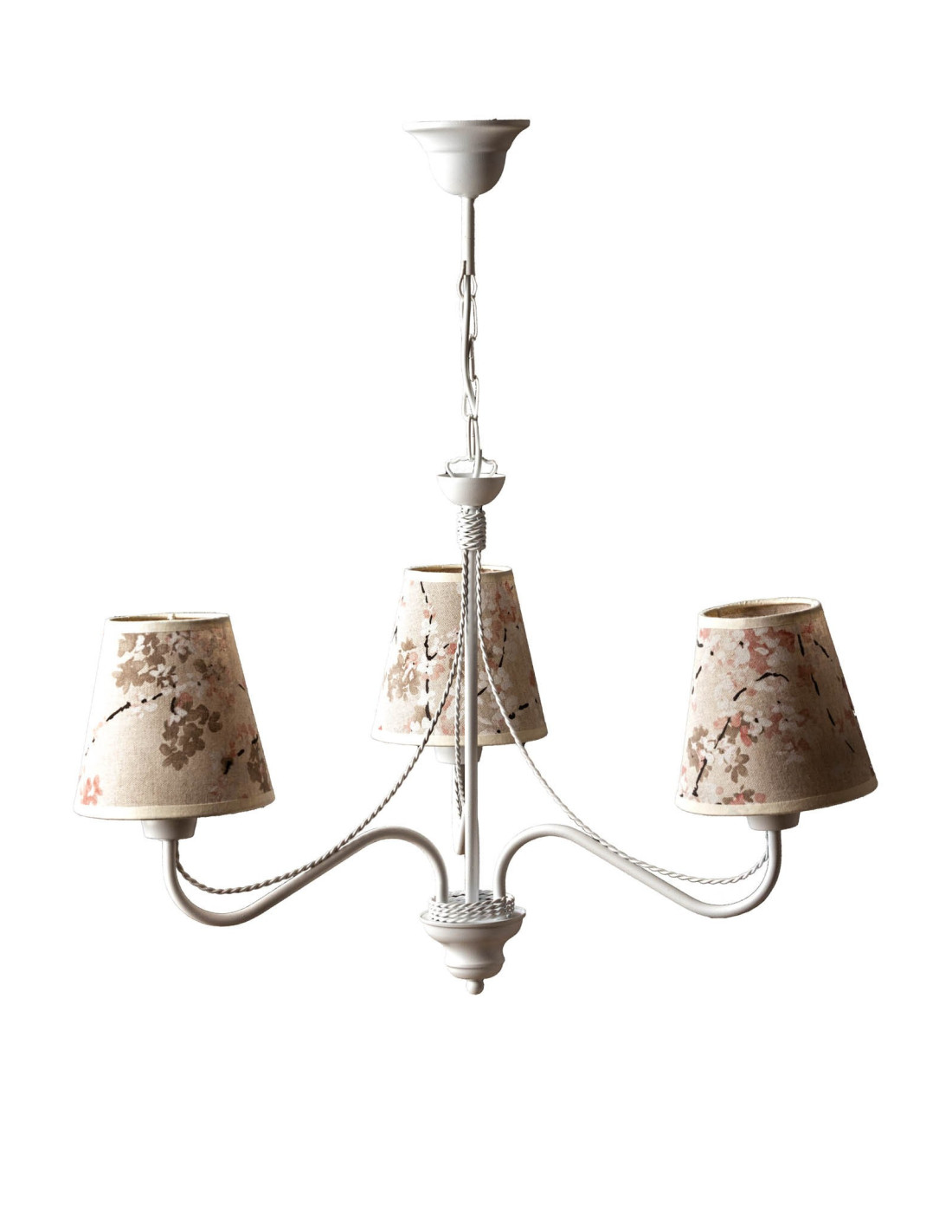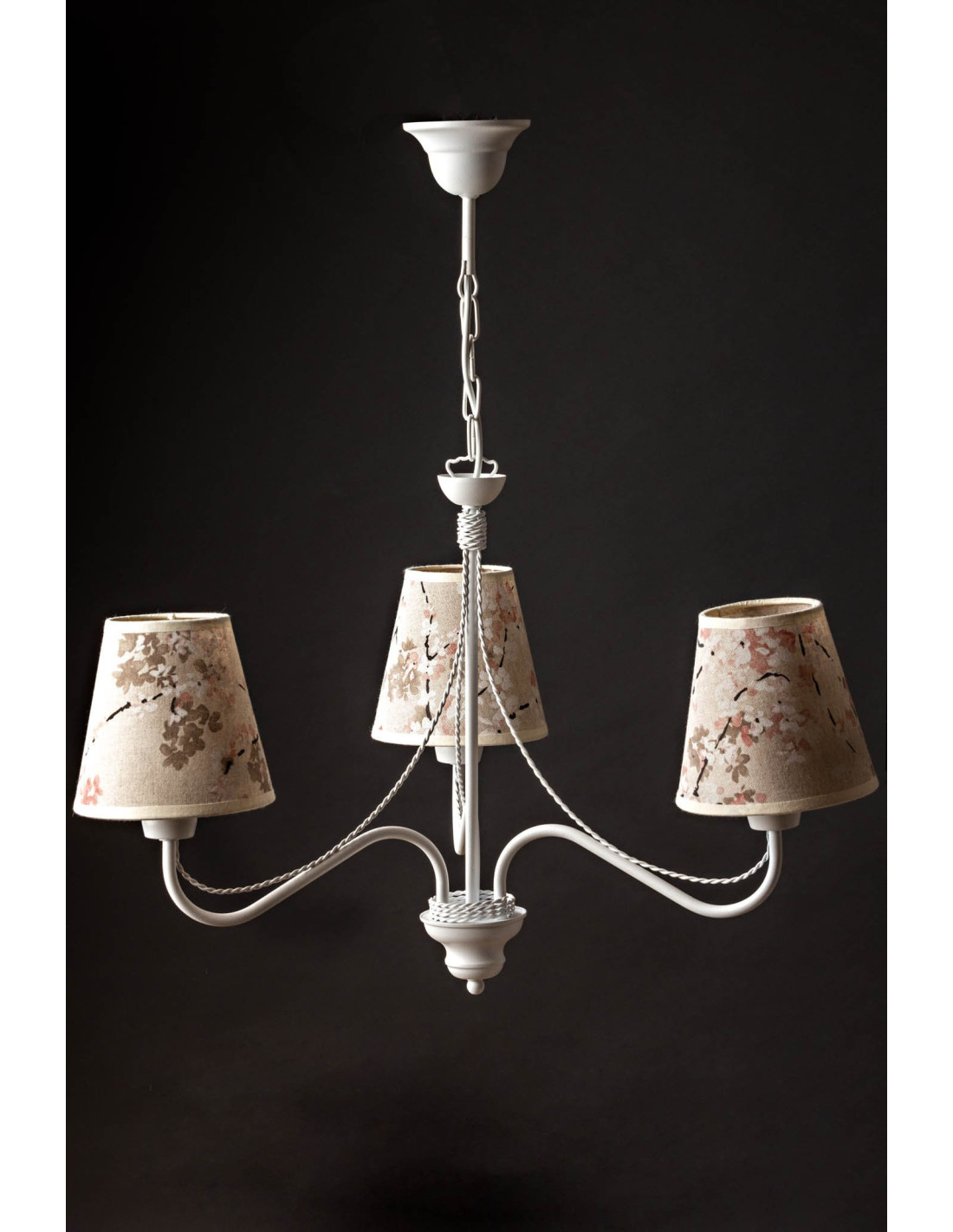 Ekskluzywny żyrandol prowansalski KATRIN biały z abażurami z motywem kwiatów wiśni jest lampą trzyramienną, w której jest możliwość świecenia żarówek 1, 2 i 3. Abażury do tej lampy są szyte ręcznie z postarzanego lnu, dodatkowo materiał został podklejony transparentnym PCV co pozwoli na długie użytkowanie tych abażurów. Konstrukcja żyrandola jest wykonana z elementów stalowych również ręcznie i pomalowana w kolorze białej struktury.
