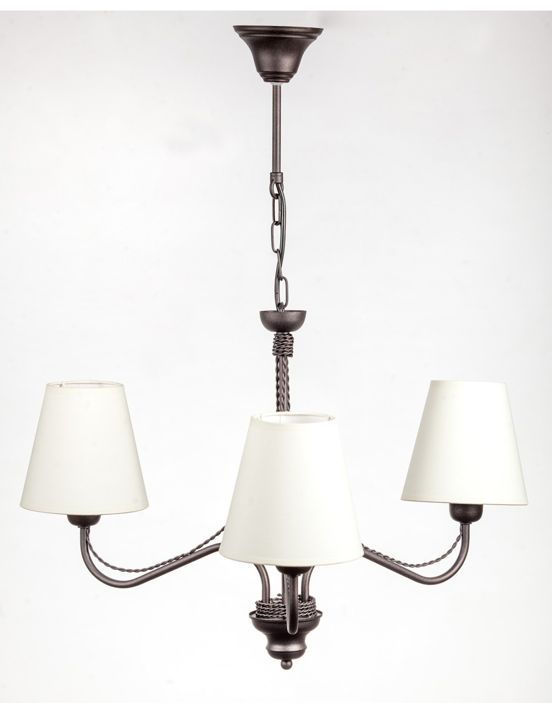 Żyrandol prowansalski KATRIN w kolorze wenge z jednolitymi abażurkami w kolorze ecru- jest lampą trzyramienną, w której jest możliwość świecenia żarówek 1, 2 i 3. Abażury do tej lampy są szyte ręcznie i materiał został podklejony transparentnym pcv co pozwoli na długie użytkowanie tych abażurów. Kształt żarówek przy lampach z abażurami jest nieistotny bo ich nie widać.