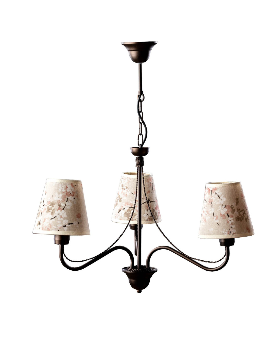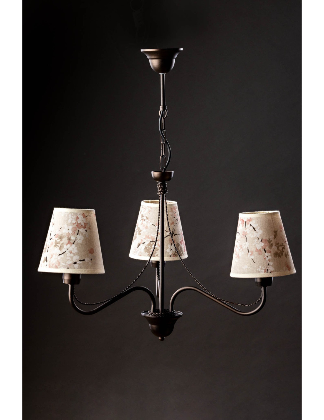 Ekskluzywny żyrandol prowansalski KATRIN w kolorze wenge, z abażurami z motywem kwiatów wiśni jest lampą trzyramienną, w której jest możliwość świecenia żarówek 1, 2 i 3. Abażury do tej lampy są szyte ręcznie z postarzanego lnu, dodatkowo materiał został podklejony transparentnym PCV co pozwoli na długie użytkowanie tych abażurów. Konstrukcja żyrandola jest wykonana z elementów stalowych również ręcznie i pomalowana w kolorze wenge.