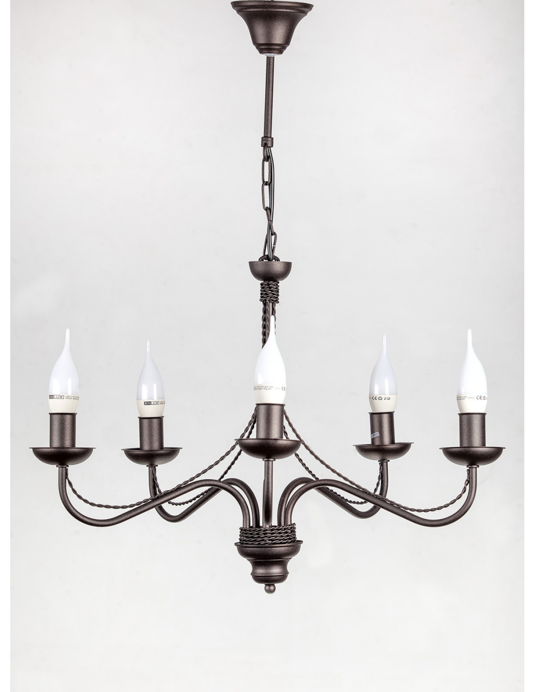 Żyrandol Katrin 5 w kolorze wenge został wyprodukowany przez naszą firmę z myślą o pokojach urządzonych w stylu prowansalskim i retro Oświetlimy nim pokój ok. 30m2-lampa ta może max świecić 300 W. Ważnym elementem w lampie Katrin są żarówki i ich kształt.Polecamy do tej lampy żarówki w kształcie świeczki z czubem. O żarówki spytajcie naszego sprzedawce.