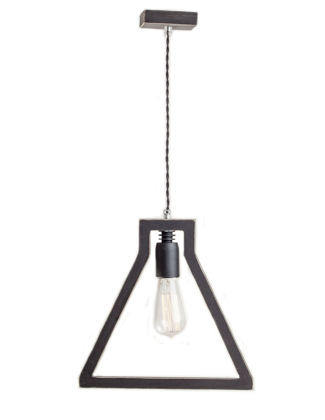 Lampa LAMPADINA kształtem przypominająca zarys żarówki wykonana jest ze sklejki o grubości 1,7 cm, którą pomalowaliśmy na czarno i przetarliśmy. Dopełnieniem jej są elementy metalowe wyglądające jakby były nie domalowane w kolorze czarnym. Ekspresji dodaje też czarny kabel podwójnie skręcony w czarnym bawełnianym oplocie. Lampa wyróżniająca się designem, dobrze się wpisuje w różne wnętrza.