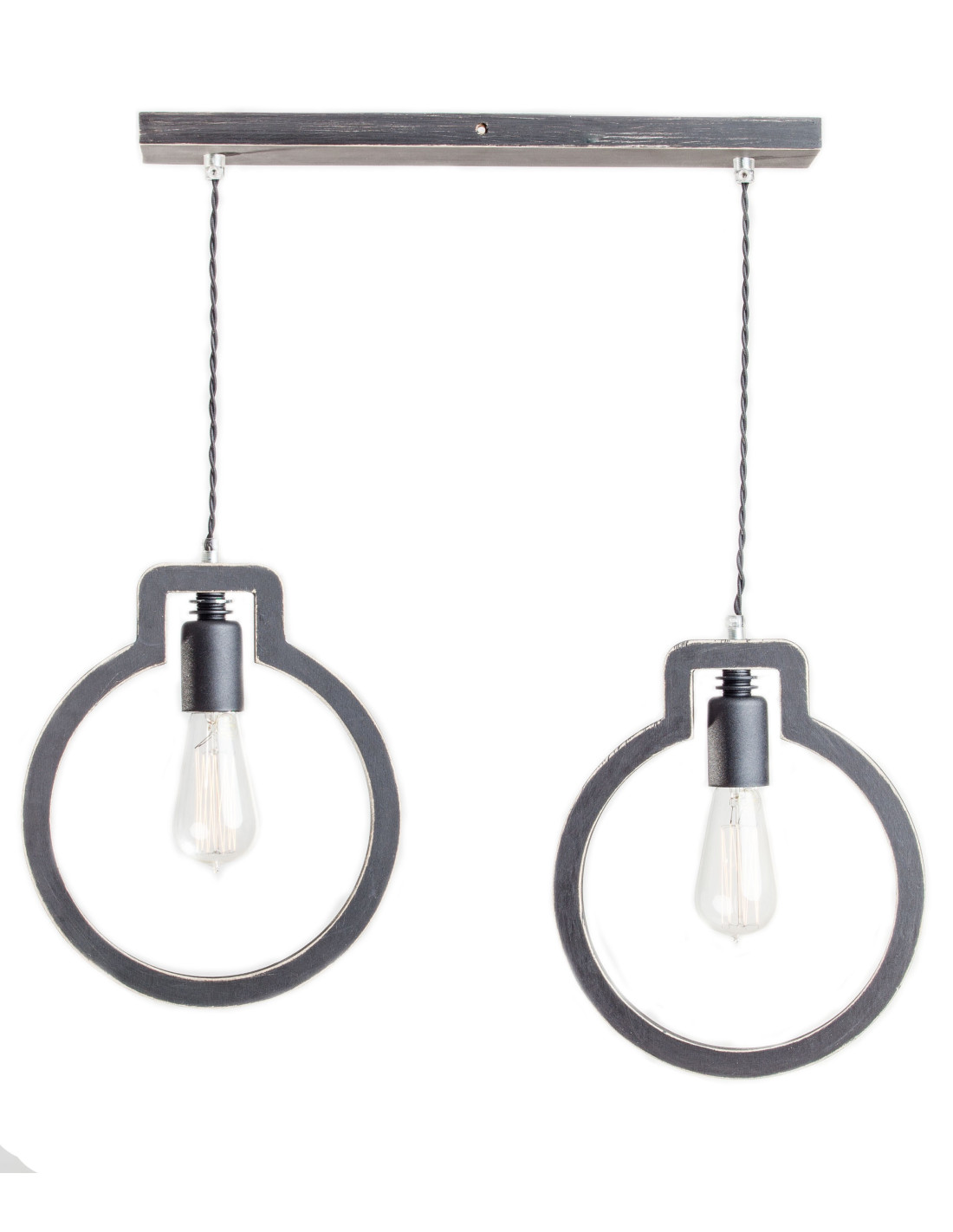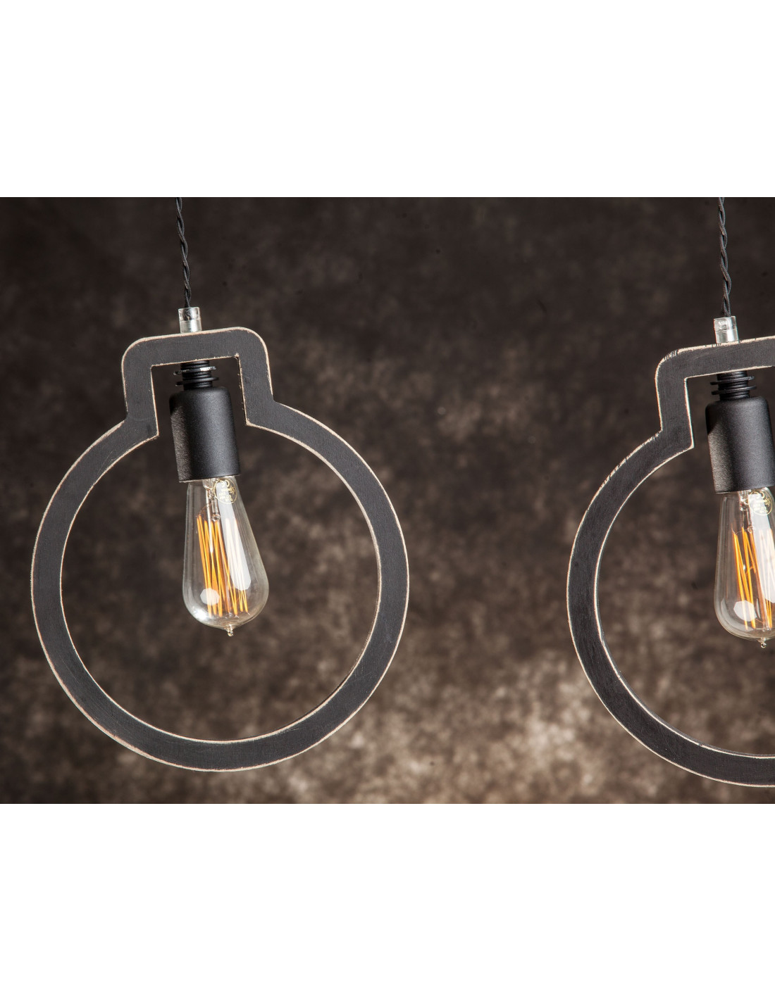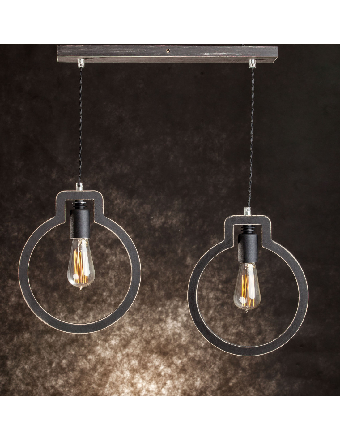 Lampa Light Bulb 2 kształtem przypominająca zarys dwóch żarówek, wykonana jest ze sklejki o grubości 1,7 cm, którą pomalowaliśmy na kolor czarny i przetarliśmy . Dopełnieniem jej są elementy metalowe wyglądające jakby były nie domalowane też w kolorze czarnym. Ekspresji dodaje też czarny kabel podwójnie skręcony w bawełnianym oplocie. Lampa wyróżniająca się designem,dobrze się wpisuje w różne wnętrza.