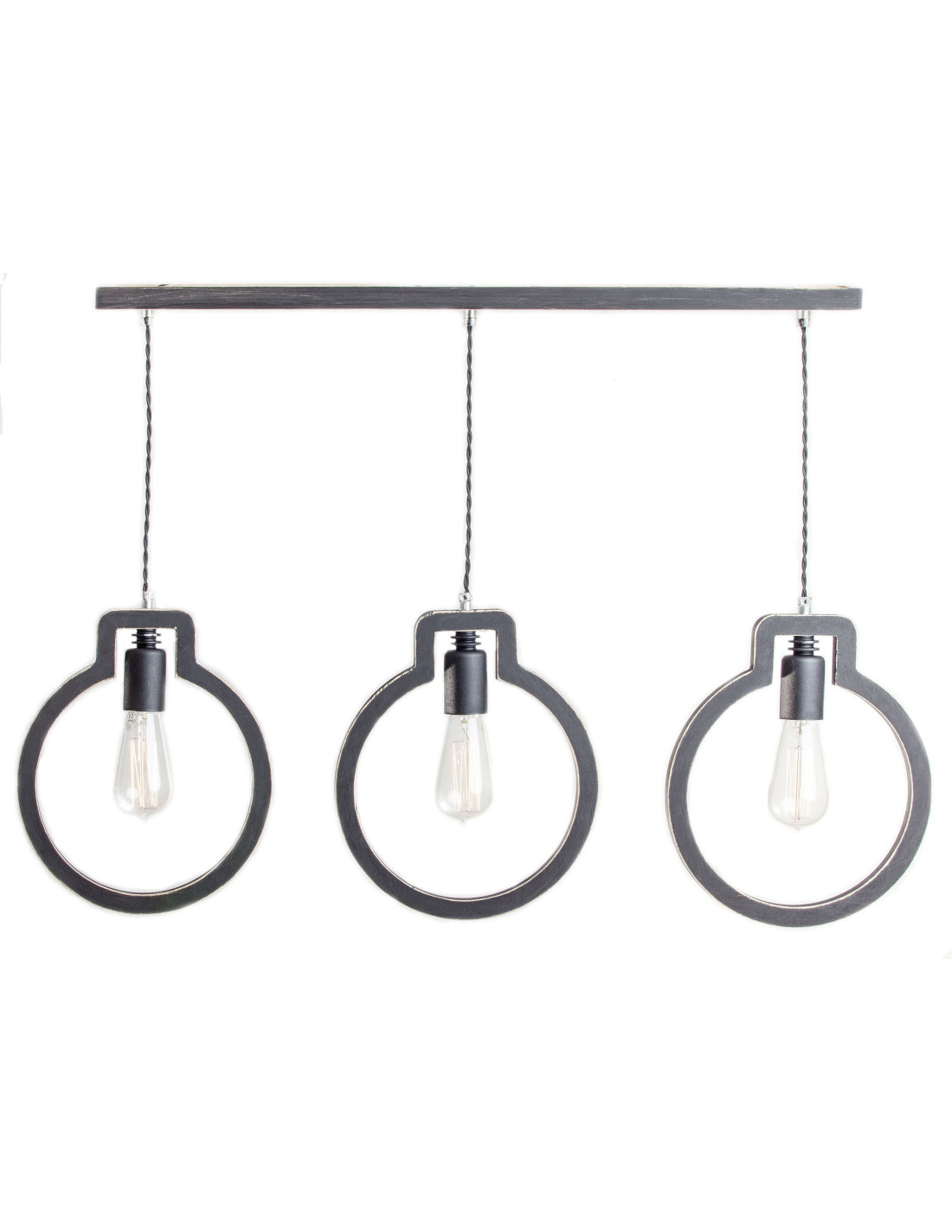 Lampa Light Bulb 3 kształtem przypominająca zarys trzech żarówek, wykonana jest ze sklejki o grubości 1,7 cm, którą pomalowaliśmy na kolor czarny i przetarliśmy . Dopełnieniem jej są elementy metalowe wyglądające jakby były nie domalowane też w kolorze czarnym. Ekspresji dodaje też czarny kabel podwójnie skręcony w bawełnianym oplocie. Lampa wyróżniająca się designem,dobrze się wpisuje w różne wnętrza.