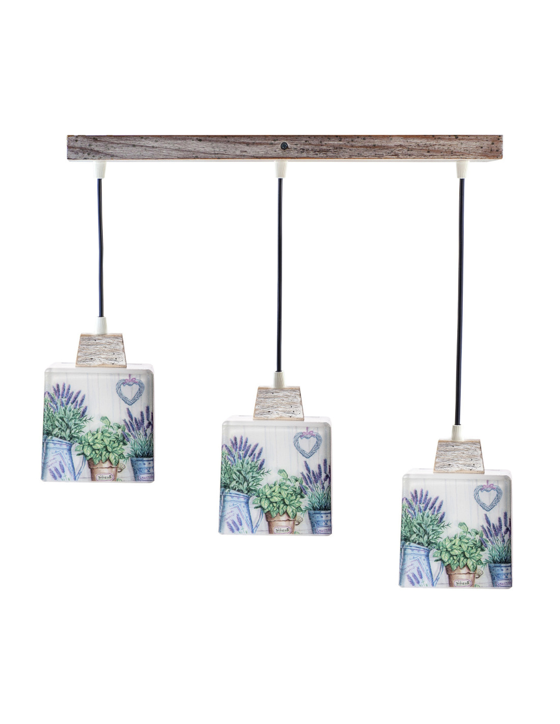 Przepiękna lampa prowansalska wisząca z trzema punktami światła wypełni zarówno miejsce nad stołem w salonie, jadalni czy kuchni lecz będzie również doskonałą dekoracją w sypialni. Motyw kwitnącej lawendy namalowany ręcznie na kloszach wzbudzi zaciekawienie. Lampa została wykończona elementami z drewna bukowego, które po pomalowaniu zostało przetarte.
