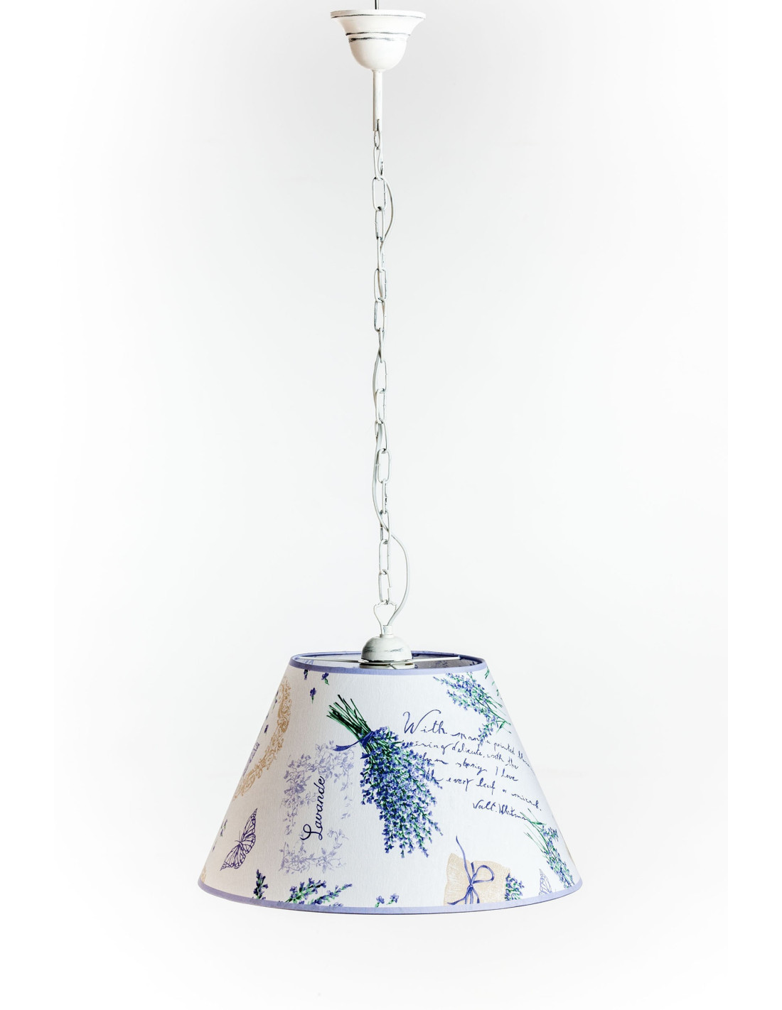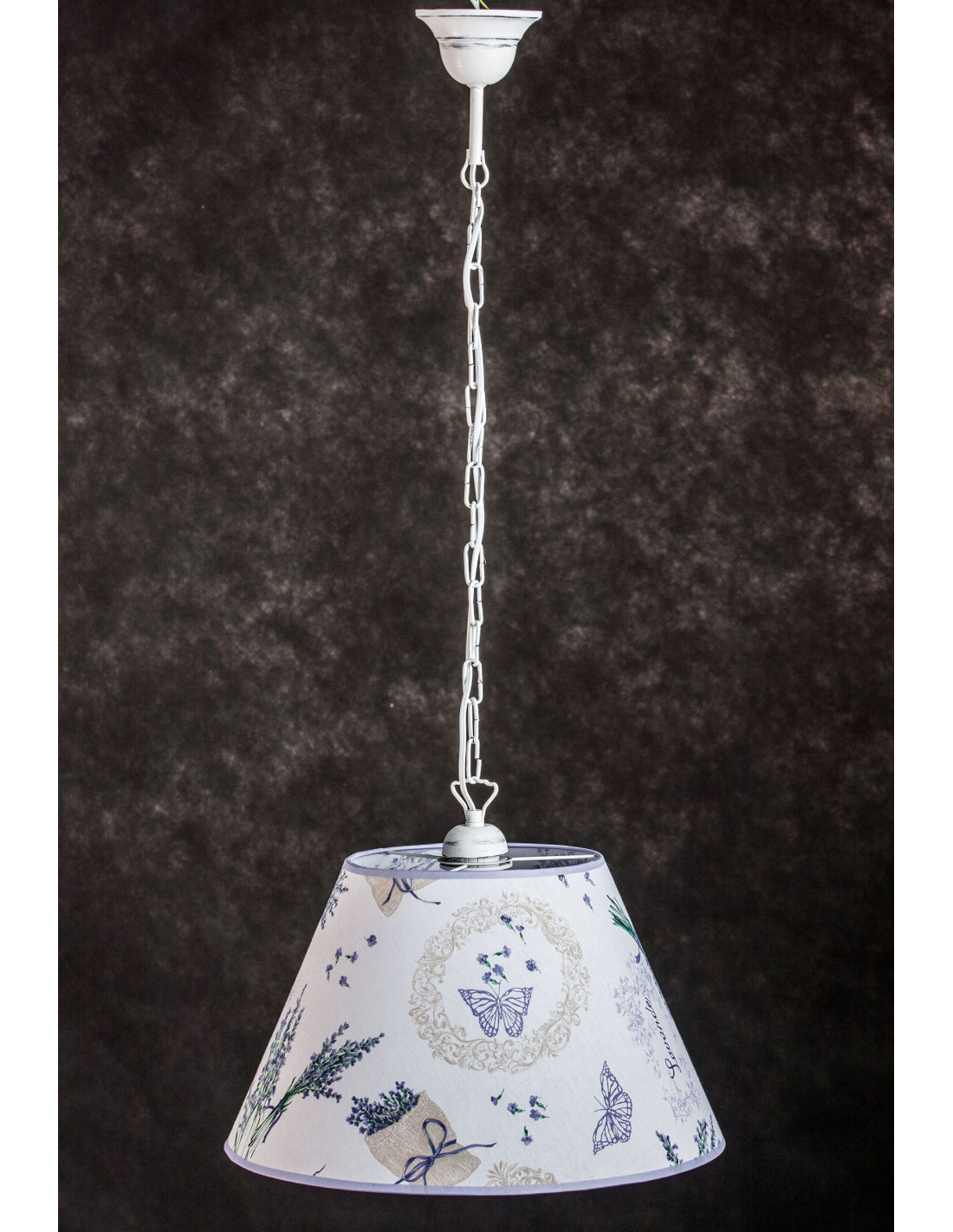 LAMPA PROWANSALSKA LAWENDA jest wykonana w całości ręcznie, począwszy od łańcucha w stylu shabby chic i abażura z motywem kwiatowym lawendy szytego ręcznie. Dominującymi kolorami jest biel i fiolet z małymi wtrąceniami zieleni. Praktycznie pasuje do każdego wnętrza robionego w stylu prowansalskim.