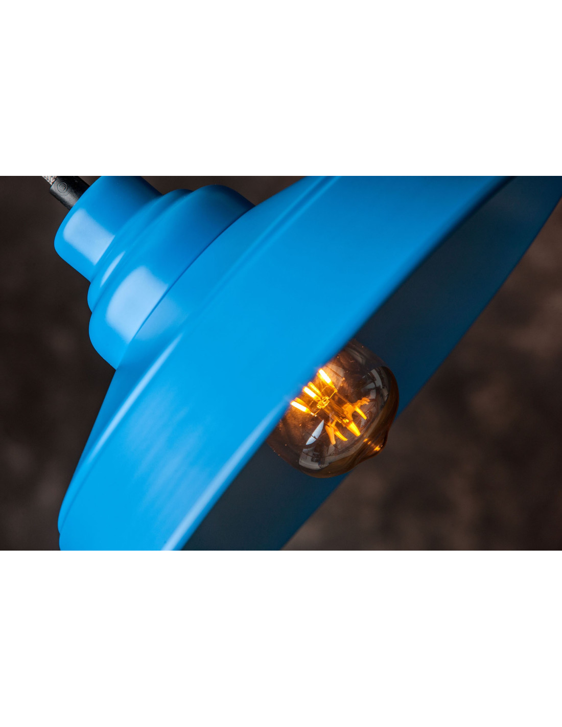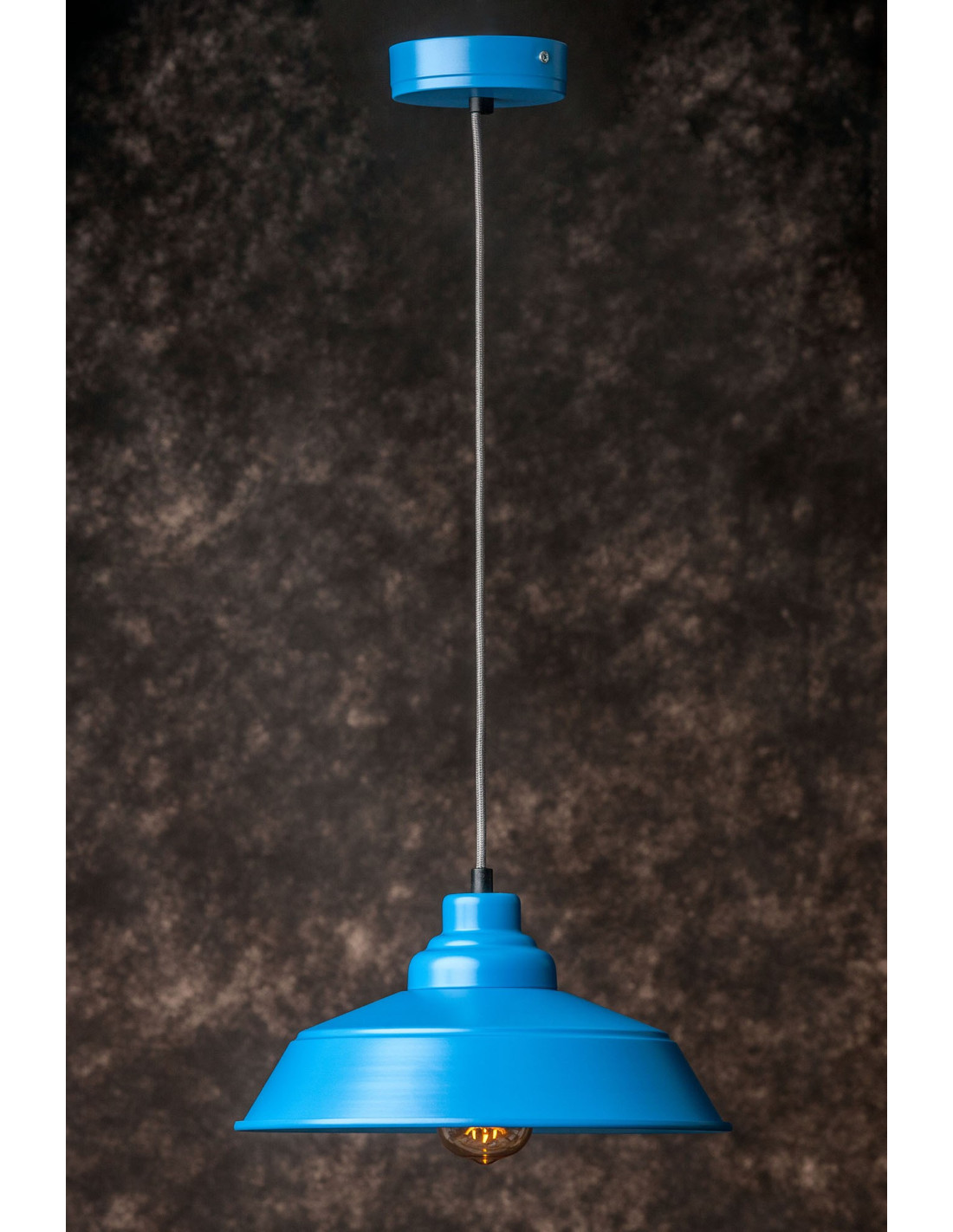 Lampa industrialno-loftowa TB/SPS/TGD wykonana jest ze stali.Klosz i podsufitka zostały pomalowane proszkowo na kolor niebieski i połączone kablem w szarym bawełnianym oplocie.Regulacja wysokości na kablu góra/dół.Oprawka schowana w podkloszówce na duży gwint.Lampa się świetnie wpisuje w każde wnętrze.Unikalny kolor lampy i prosty kształt przyciąga uwagę klientów lubiących minimalizm.