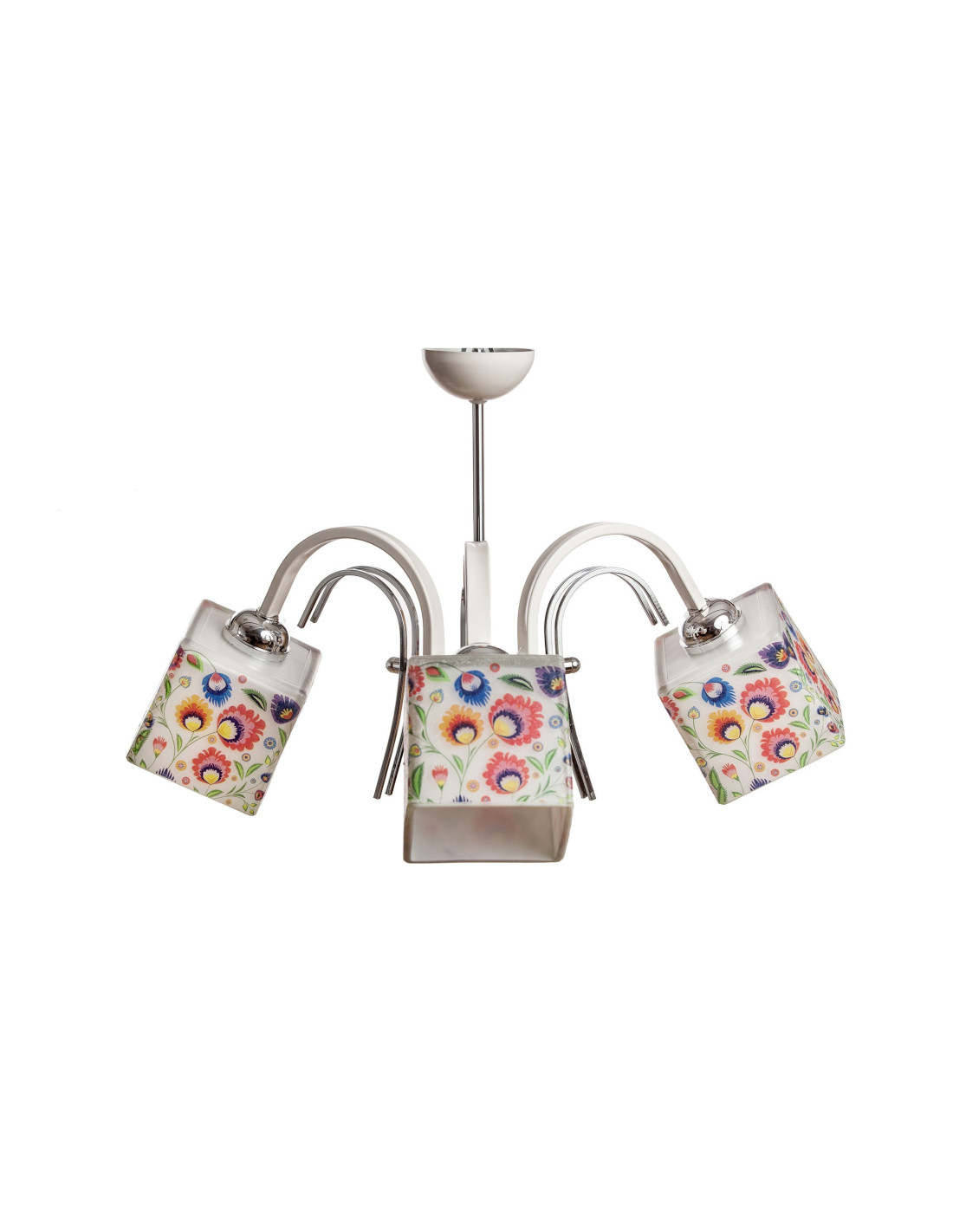 Żyrandol Folkowy 3A wykonany jest z metalu w kolorze białym z dodatkami chromu..Do produkcji jej użyliśmy klosze w kształcie kwadratu ,które ręcznie zostały ozdobione motywami w stylu folk.Lampę wyposażono w oprawki E27 co powoduje ,że w epoce ledów może oświetlić ok 20 m2.Unikalny design lampy powoduje ,że nie przejdziemy obok niej obojętnie.