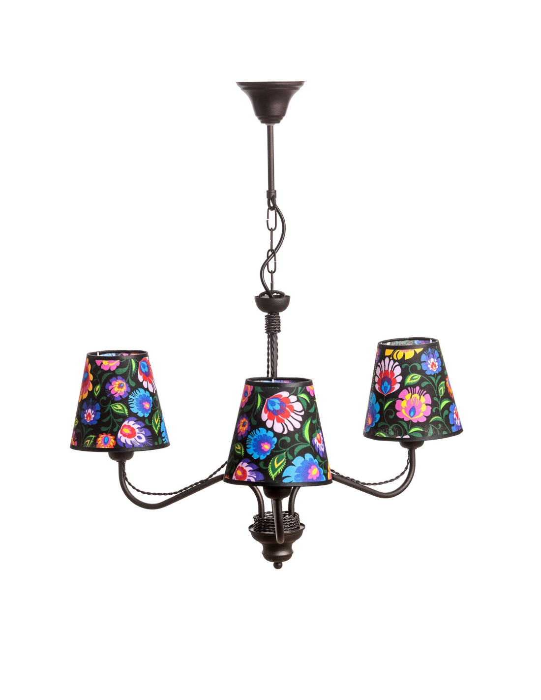 Żyrandol Katrin 3 to kwintesencja idealnej lampy.Połączenie koloru wenge(część metalowa) i abażurów z motywami folklorystycznymi rozmieszczonymi na czarnym tle,powodują ,że lampa ta będzie zawsze zauważona i na pewno nada pomieszczeniu ostrości i wyrazistości.Lampa jest ręcznie wykonana począwszy od części metalowej po abażury.