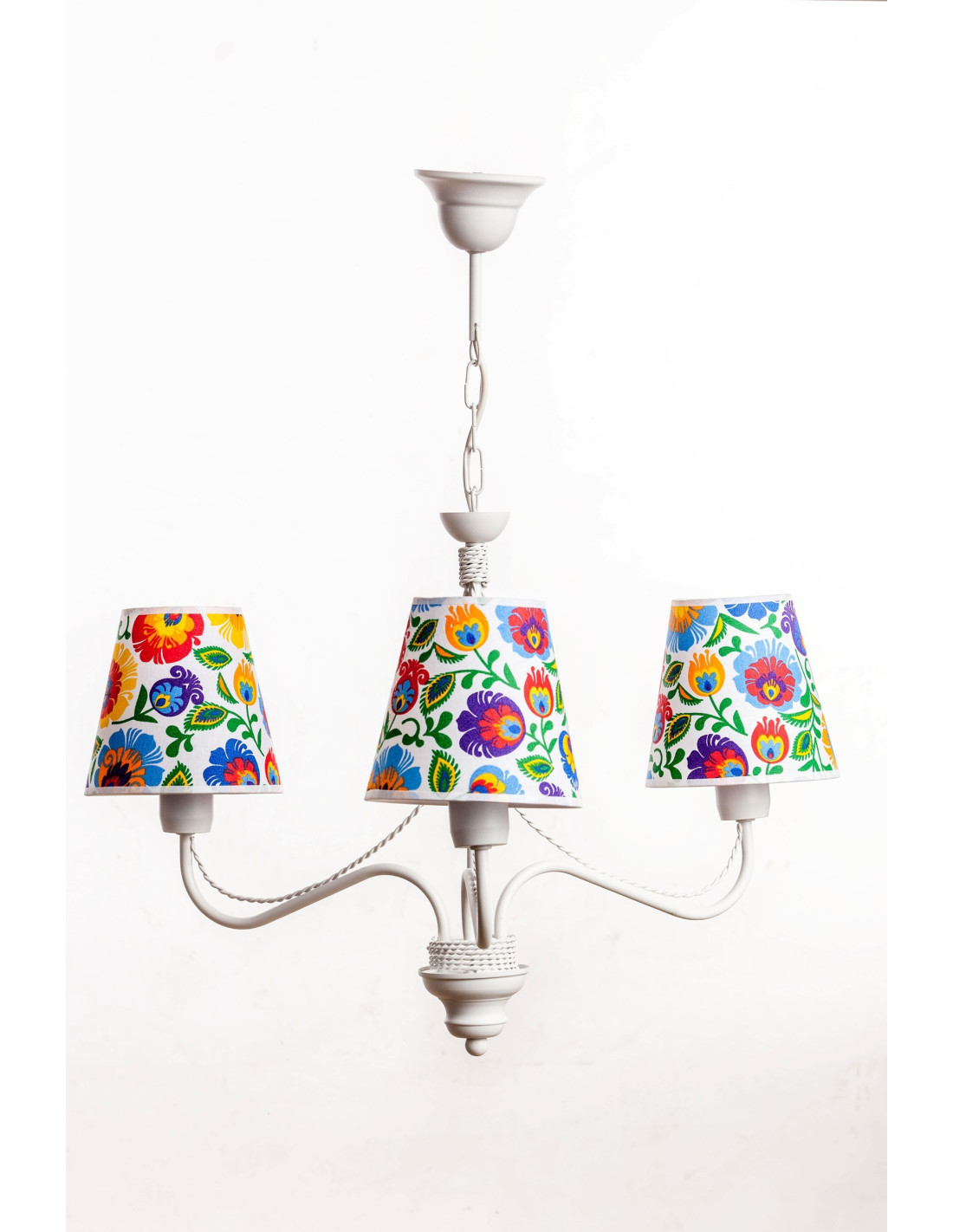 Żyrandol Katrin 3 to kwintesencja idealnej lampy.Połączenie koloru białego(część metalowa) i abażurów z motywami folklorystycznymi rozmieszczonymi na białym tle,powodują ,że lampa ta będzie zawsze zauważona i na pewno nada pomieszczeniu ostrości i wyrazistości.Lampa jest ręcznie wykonana począwszy od części metalowej po abażury.Lampa ta świetnie wpisze się w nurt wnętrz prowansalskich jak i boho.