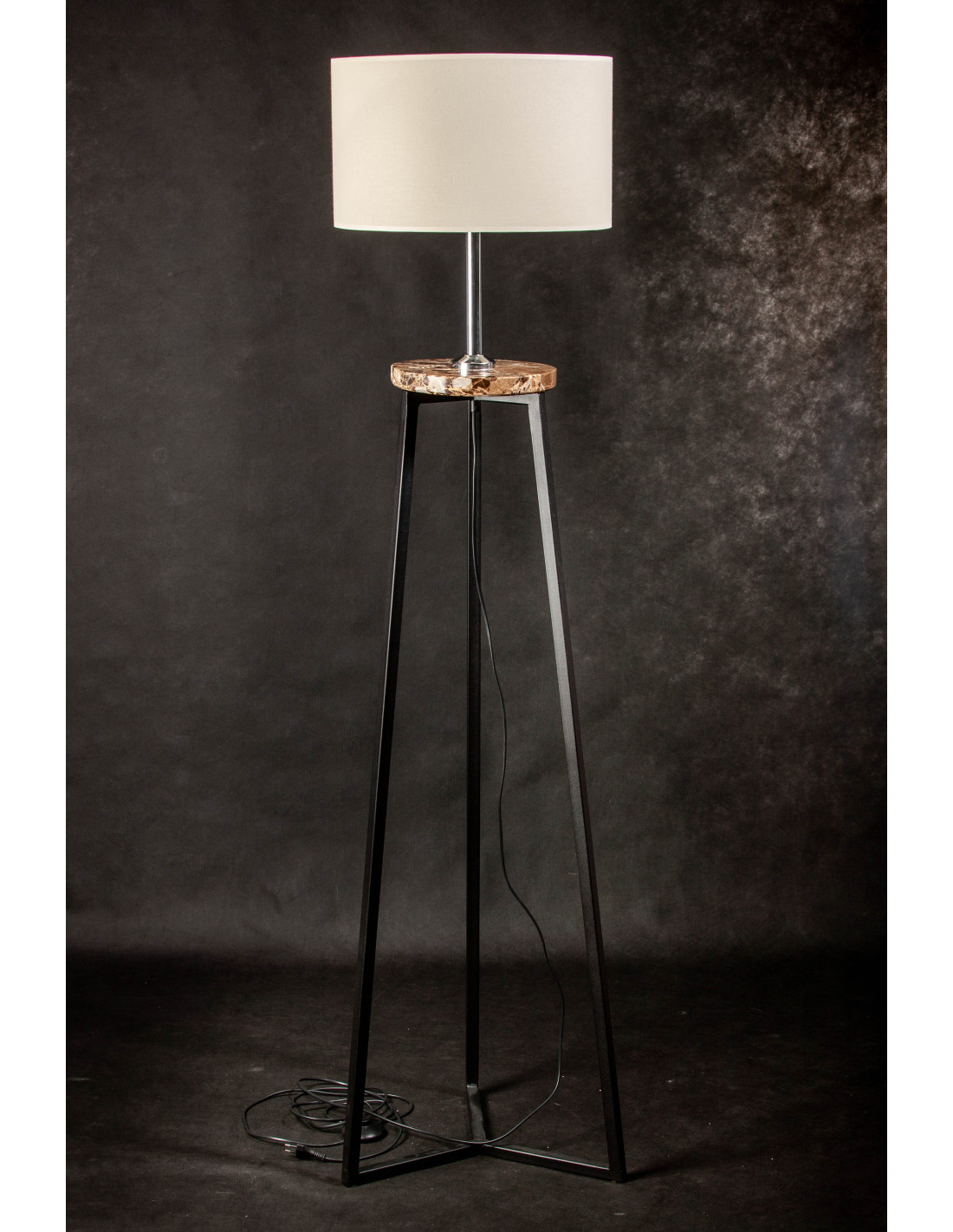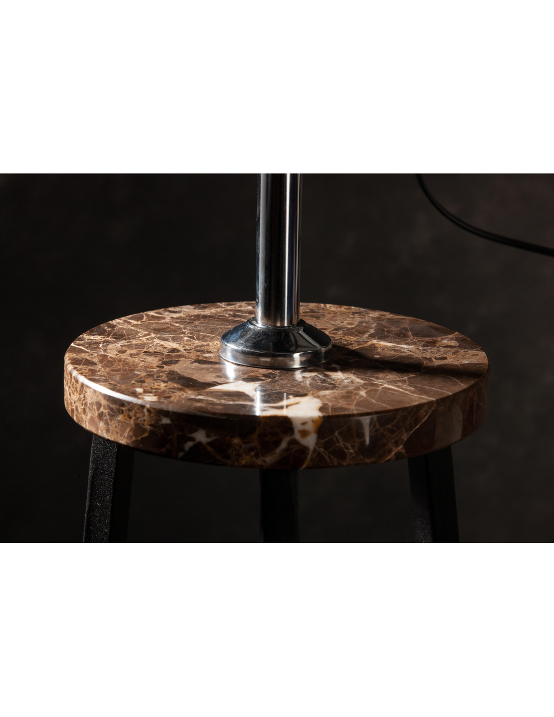 Lampa podłogowa FLOKI ABAŻUR w kolorze ecru to połączenie stylu glamour i stylu industrialnego. Widać to po użytych w lampie elementach. Trójnóg wykonany jest ze stali pomalowanej w kolorze czarnej głębokiej struktury, a podstawa abażura w kształcie koła, z marmuru emperador dark. Uzupełnieniem lampy są elementy w kolorze chromu.