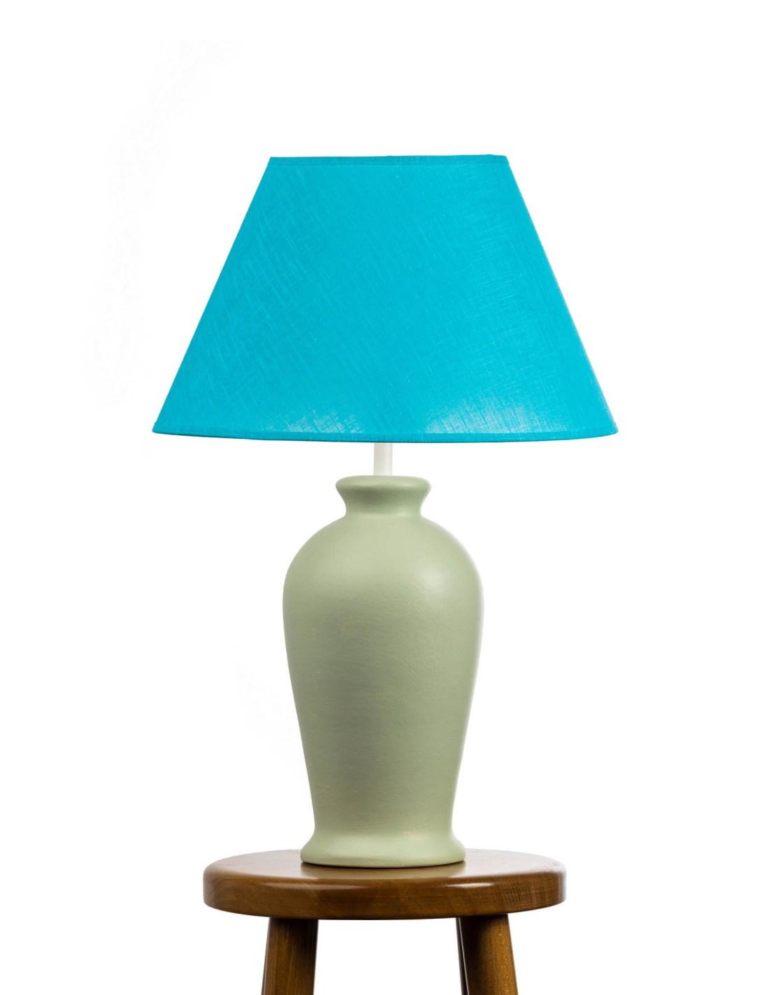 Lampa Ceramiczna ERIS w kolorze miety z abażurem z tkaniny w kolorze turkusu, ręcznie przeszytym i podklejonym PCV, wykończonym lamówką w tym samym kolorze. Idealna zarówno do nowoczesnych i klasycznych wnętrz ,lampa też świetnie wpisze się w nurt pomieszczeń w stylu prowansalskim. Nasze lampy stołowe są wykonane z najwyższej jakości glinki ceramicznej.