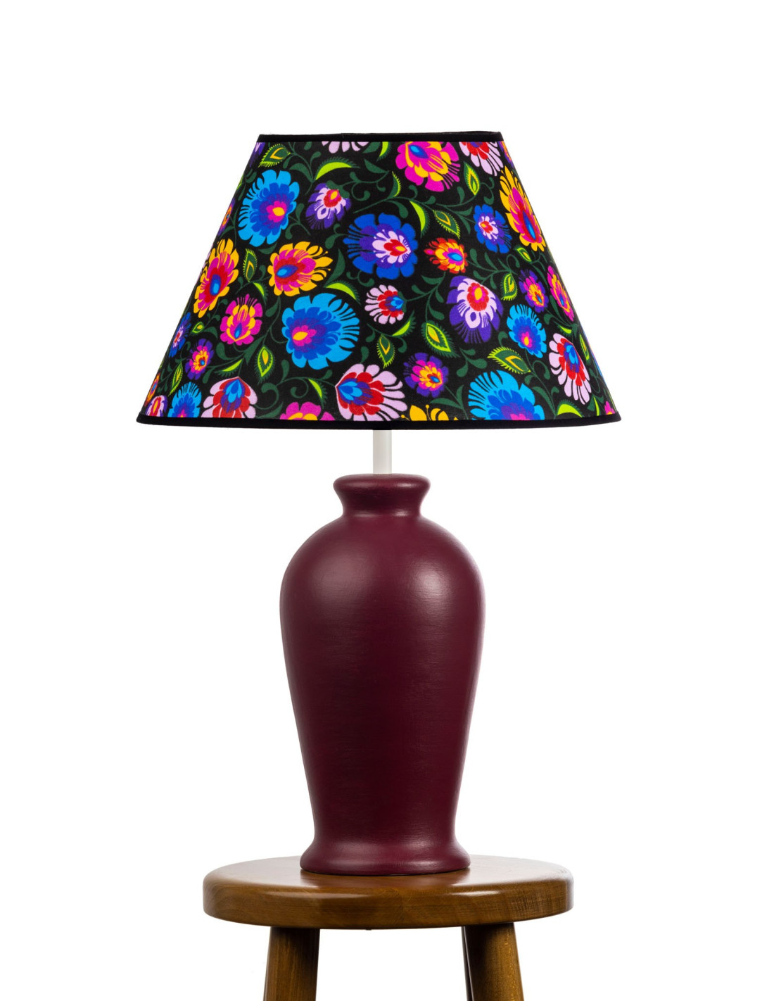 Lampa Ceramiczna ERIS w kolorze bordo z abażurem z tkaniny, ręcznie przeszytym i podklejonym PCV z motywem folkowym, wykończonym lamówką w tym samym kolorze. Idealna zarówno do nowoczesnych i klasycznych wnętrz ,lampa też świetnie wpisze się w nurt pomieszczeń w stylu prowansalskim i folkowym. Nasze lampy stołowe są wykonane z najwyższej jakości glinki ceramicznej.