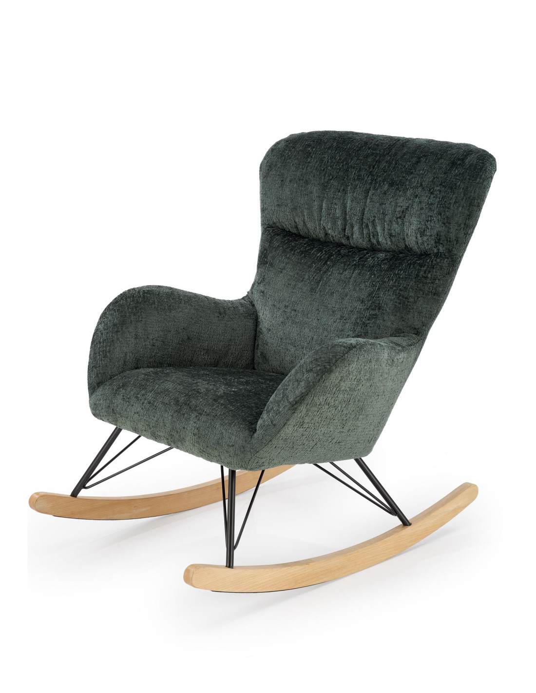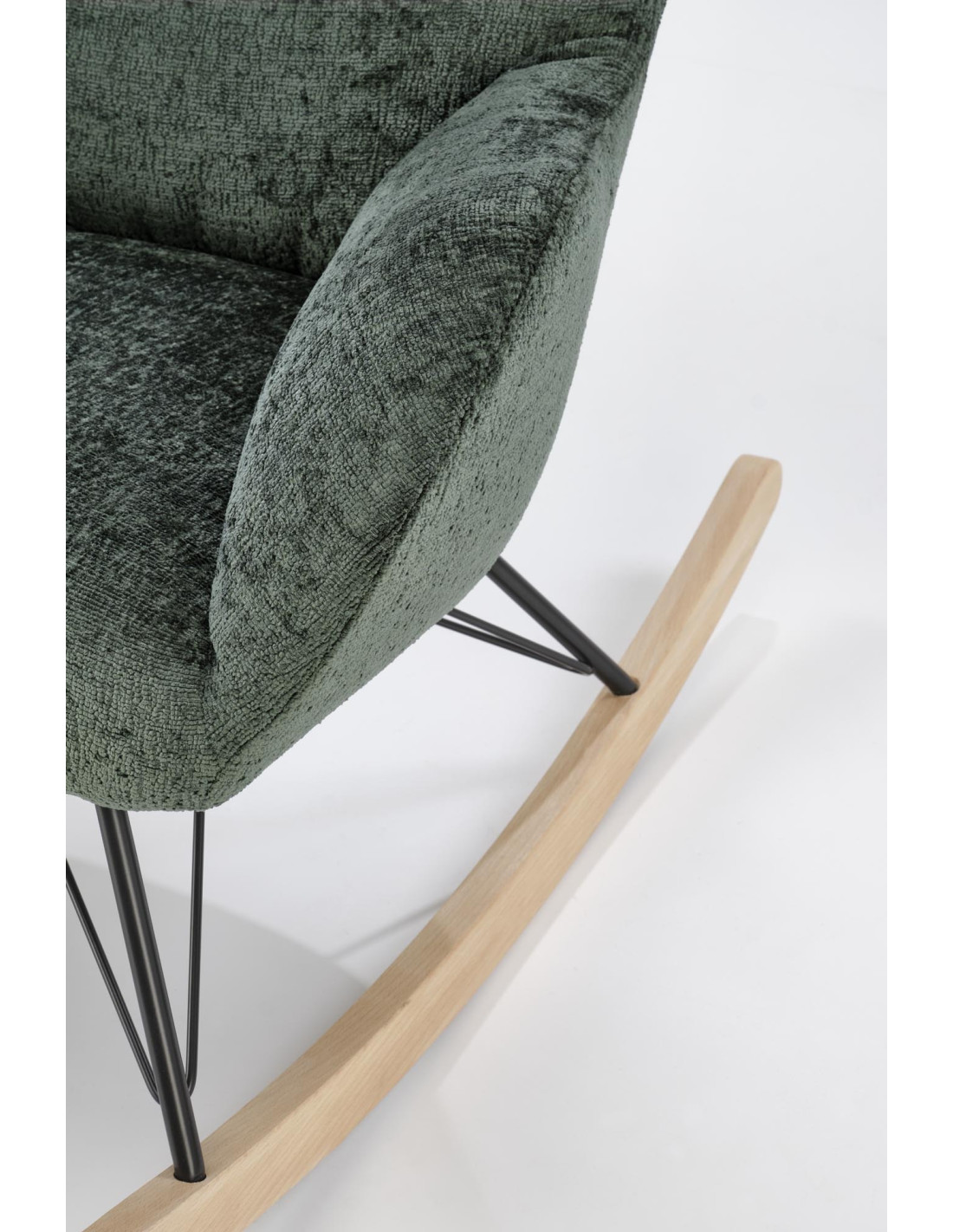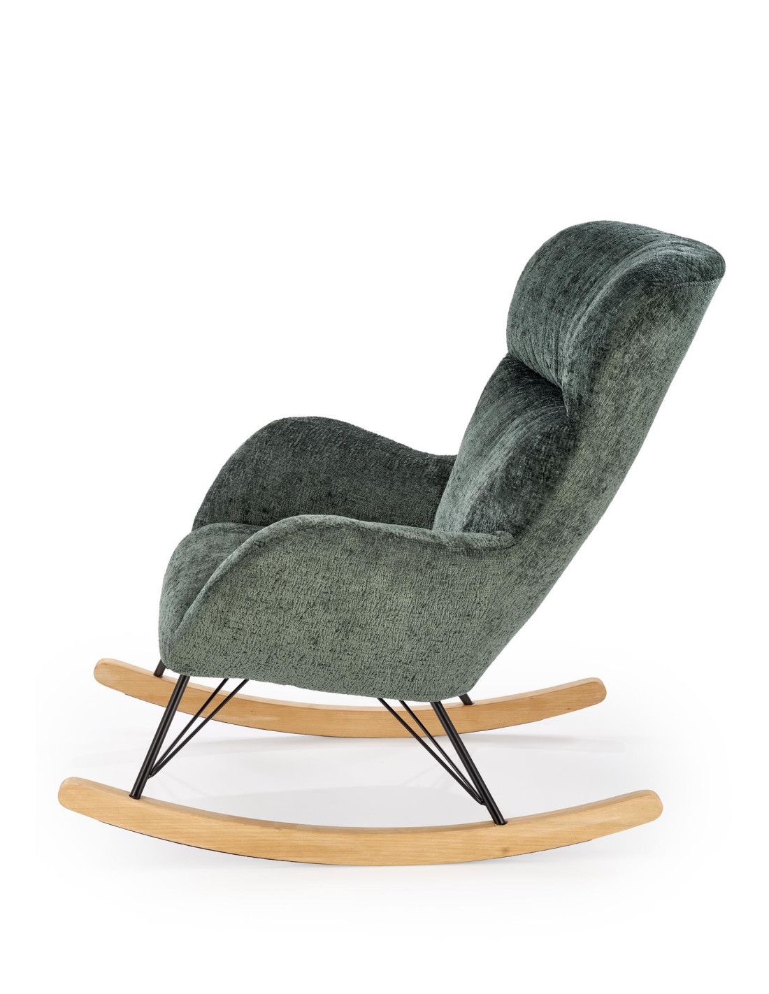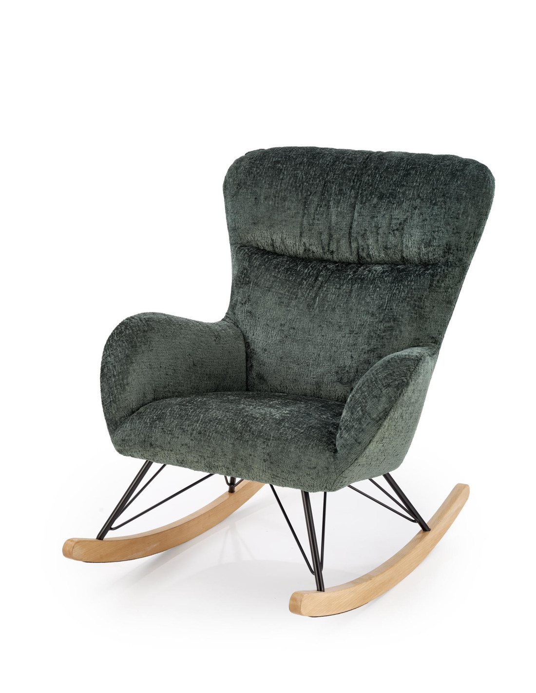 Przedstawiamy Ci fotel bujany CASTRO, który łączy przytulny design z przyjemnością użytkowania. Jego ciemnozielone obicie jest nie tylko aksamitne w dotyku, ale również zachwyca swoją elegancją. Zaokrąglone oparcie oraz podłokietniki zapewniają wygodę, a stalowe nogi malowane na czarno w połączeniu z płozami z litego drewna nadają mu nowoczesny charakter, który idealnie wkomponuje się w każde wnętrze.