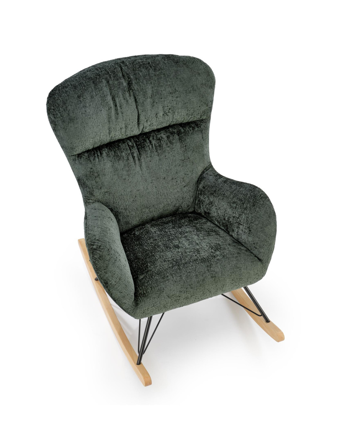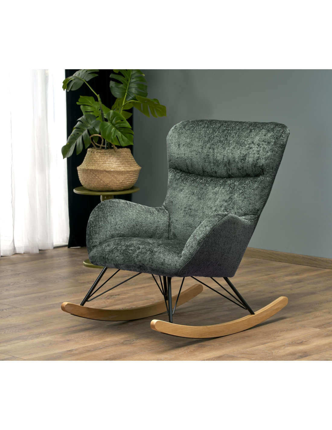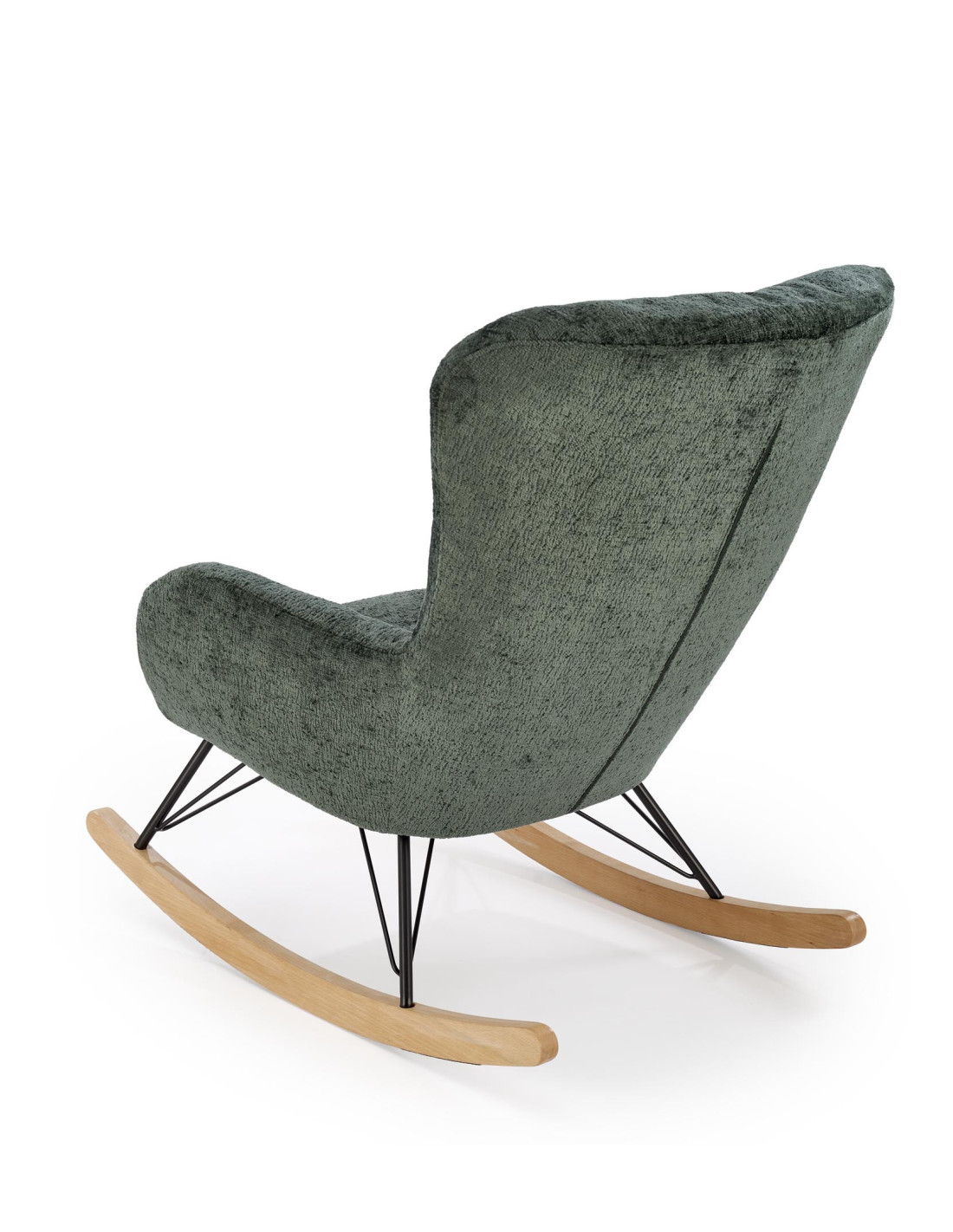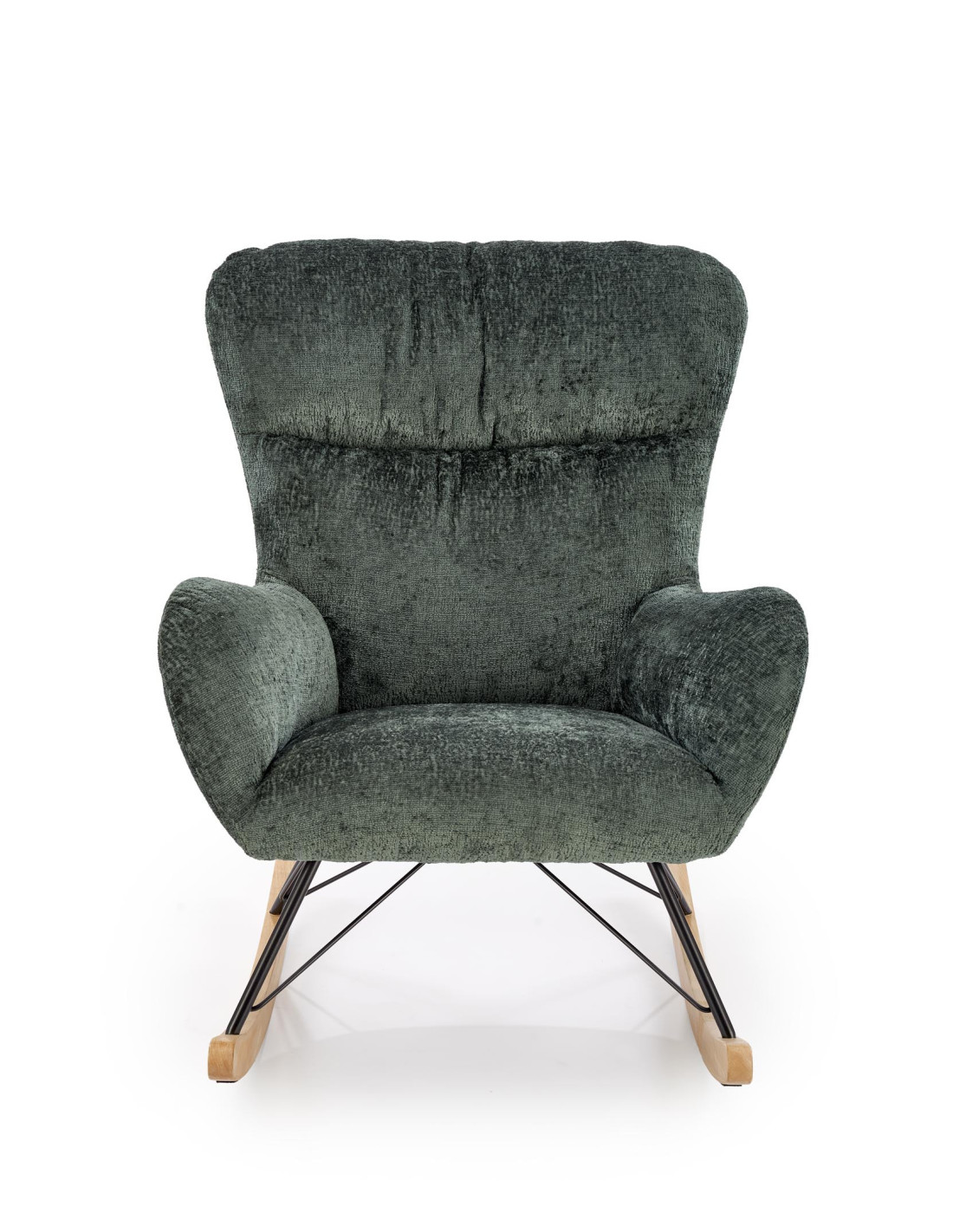 Przedstawiamy Ci fotel bujany CASTRO, który łączy przytulny design z przyjemnością użytkowania. Jego ciemnozielone obicie jest nie tylko aksamitne w dotyku, ale również zachwyca swoją elegancją. Zaokrąglone oparcie oraz podłokietniki zapewniają wygodę, a stalowe nogi malowane na czarno w połączeniu z płozami z litego drewna nadają mu nowoczesny charakter, który idealnie wkomponuje się w każde wnętrze.