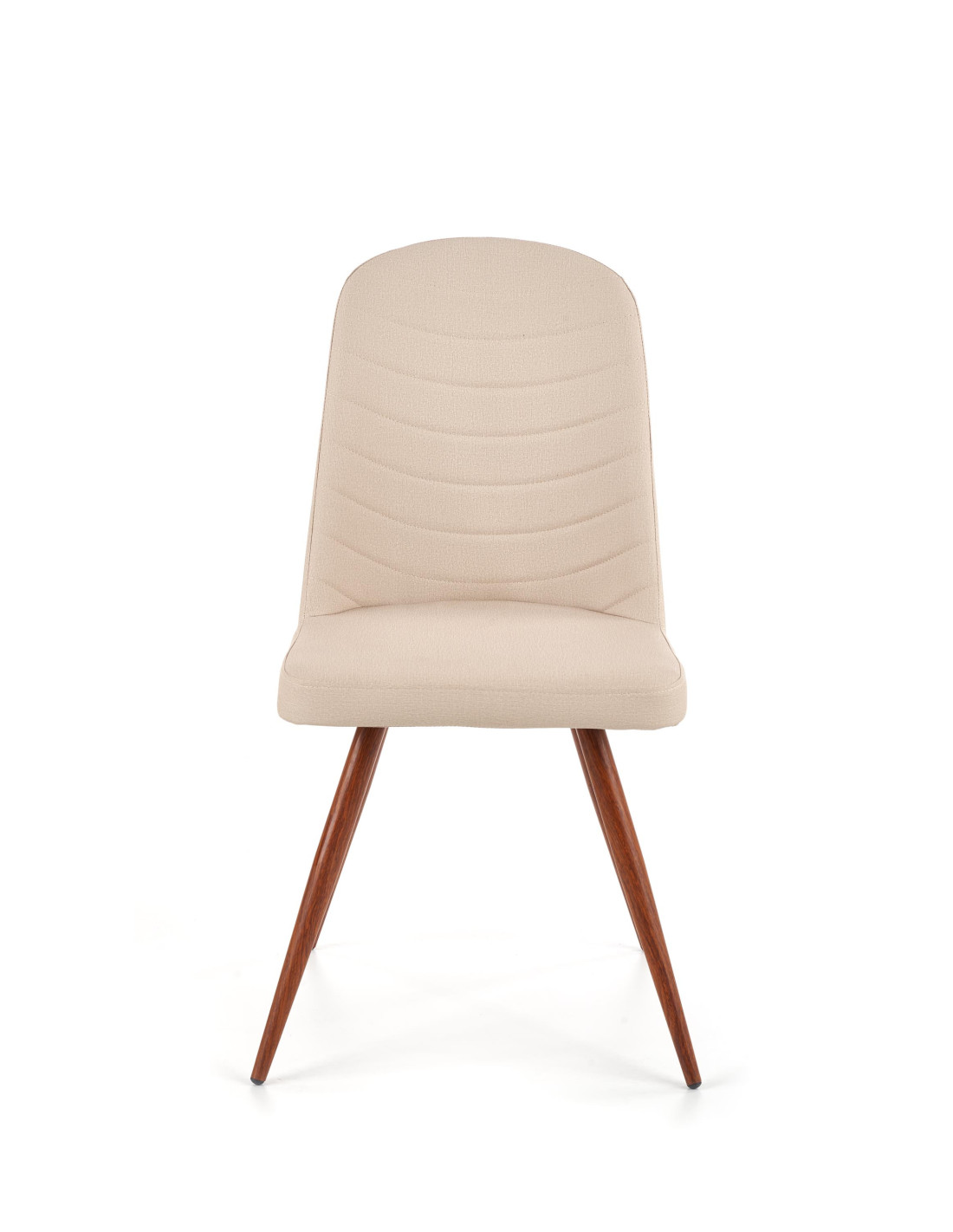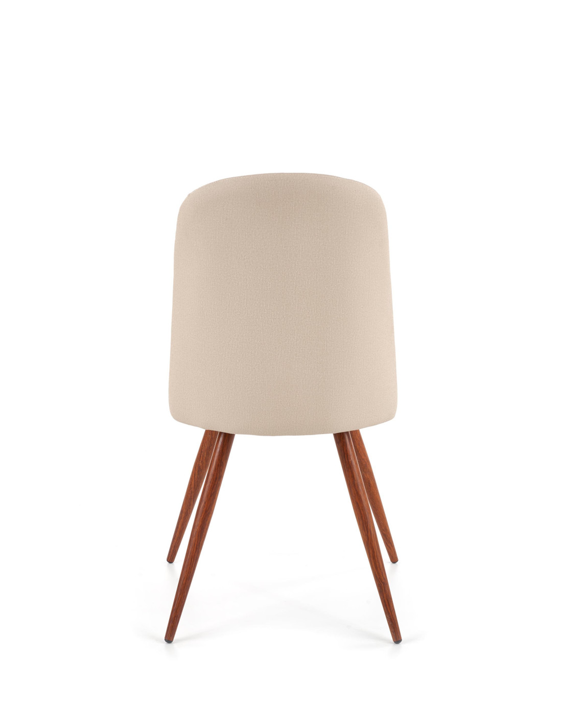 Dodaj piękny akcent do swojego wnętrza dzięki krzesłu K214, które łączy w sobie nowoczesny styl z minimalizmem skandynawskim. To eleganckie krzesło wykonane z eko-skóry w kolorze ciemnego kremu wyróżnia się tapicerowanym oparciem oraz siedziskiem, które zapewniają wygodę podczas długich godzin siedzenia. Delikatne przeszycia na oparciu podkreślają jego wyjątkowy charakter, a smukłe nogi w kolorze dębu miodowego dodają całości lekkości.