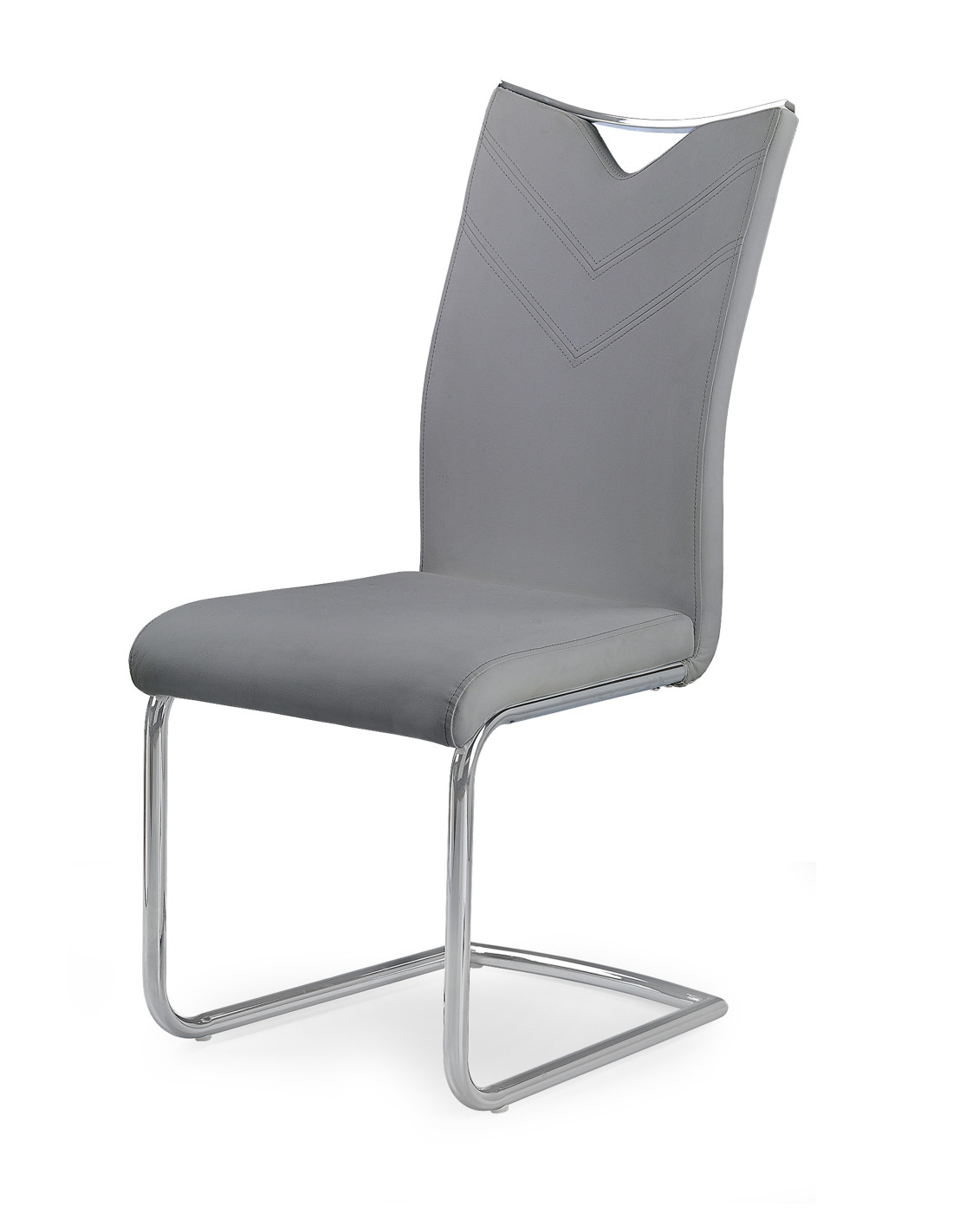 Krzesło K224 wykonane jest z chromowanej stali oraz eco-skóry w kolorze popielatym, co zapewnia mu nowoczesny i elegancki wygląd.