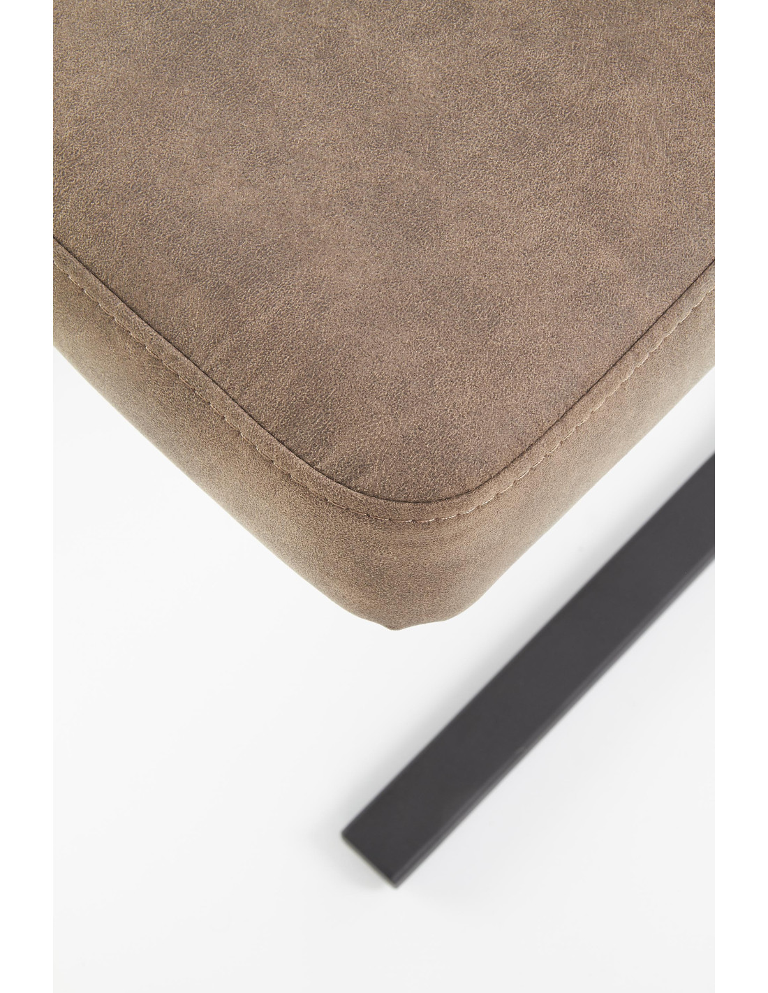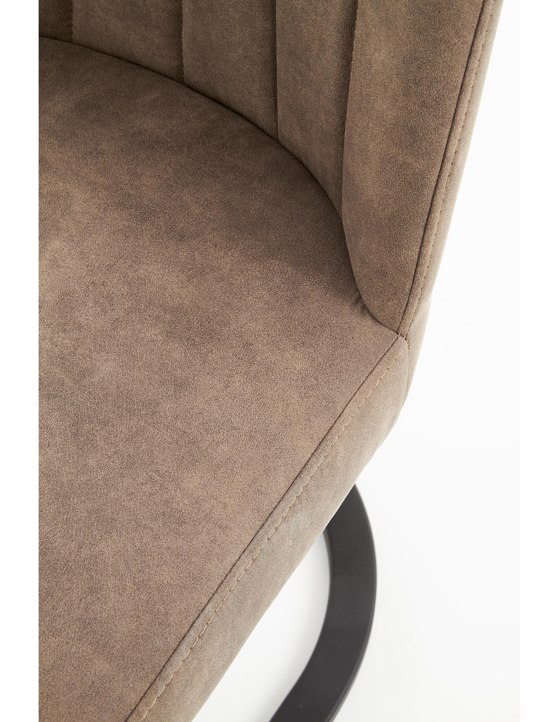 Krzesło wyróżnia się eleganckim designem, pionowymi przeszyciami oraz zakrzywionymi nogami, które zapewniają stabilność i nowoczesny wygląd.