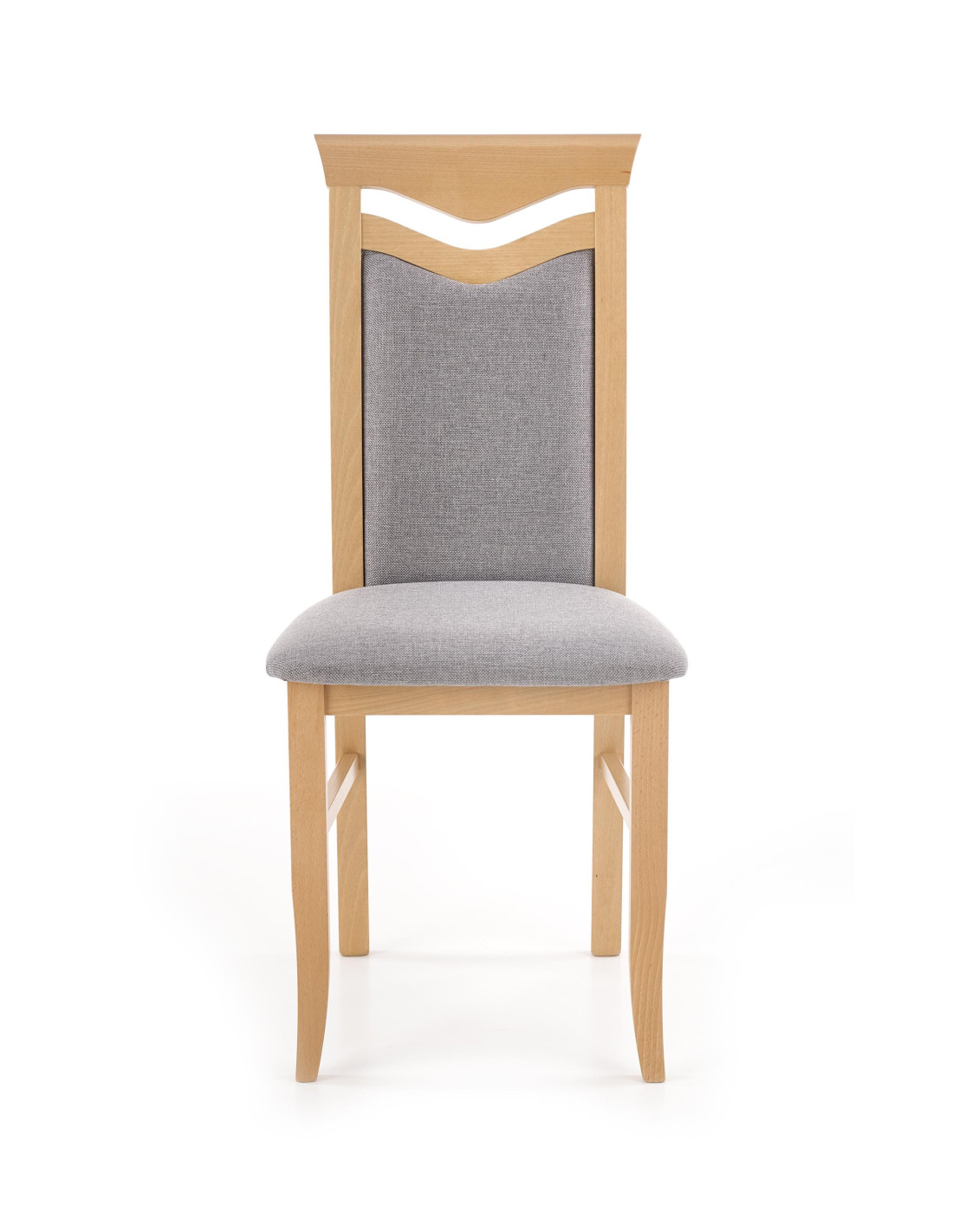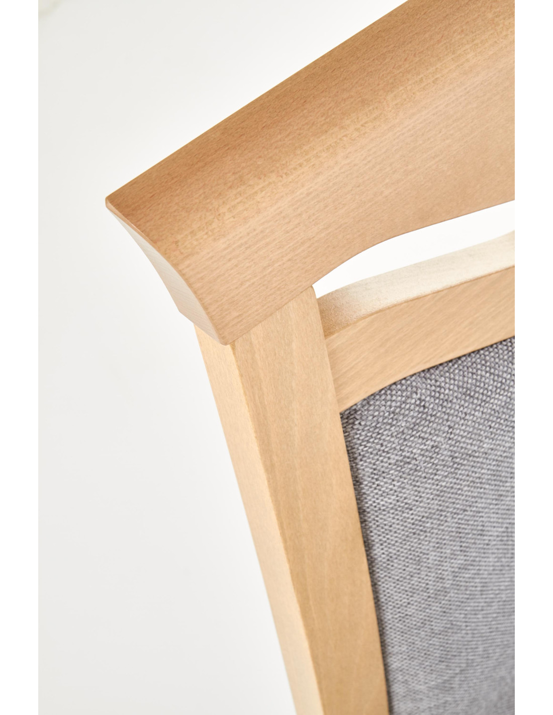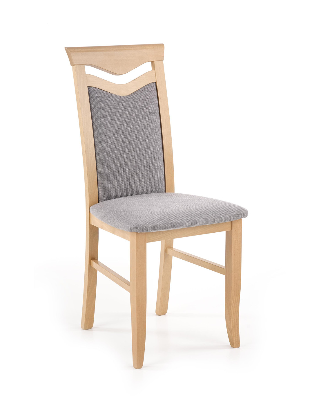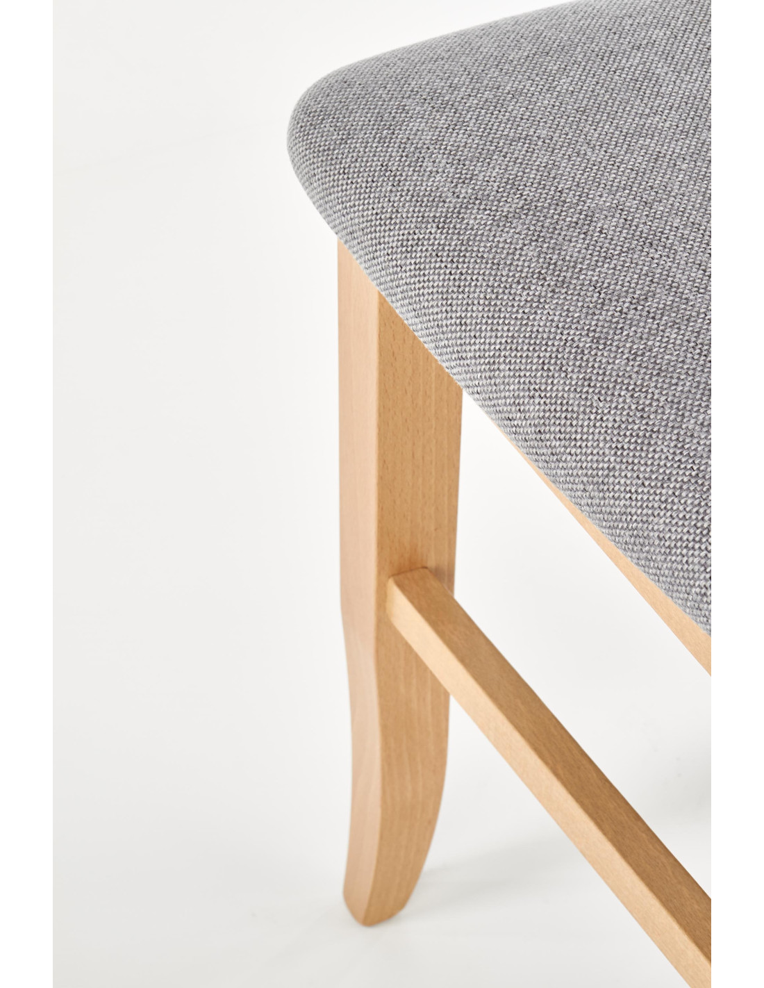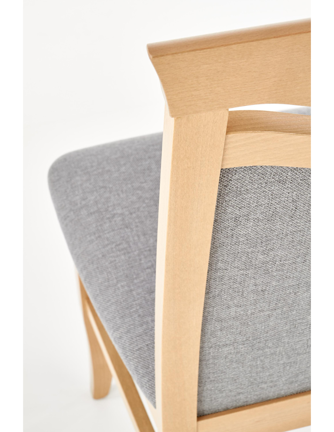 Krzesło wykonane jest z litego drewna bukowego oraz tkaniny w kolorze jasnoszarym, co zapewnia mu elegancki wygląd.
