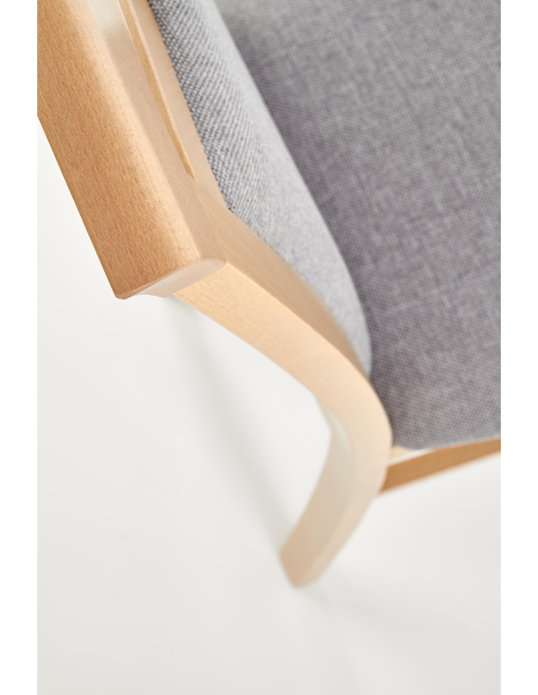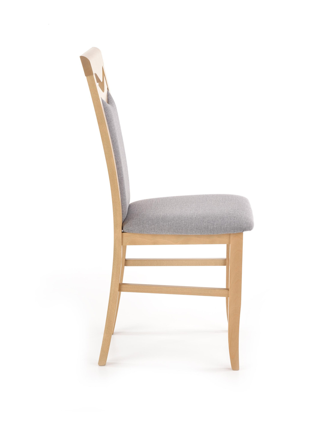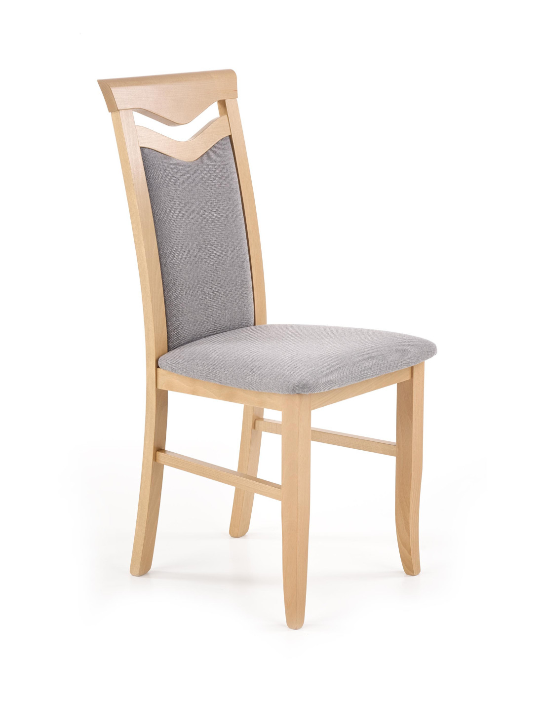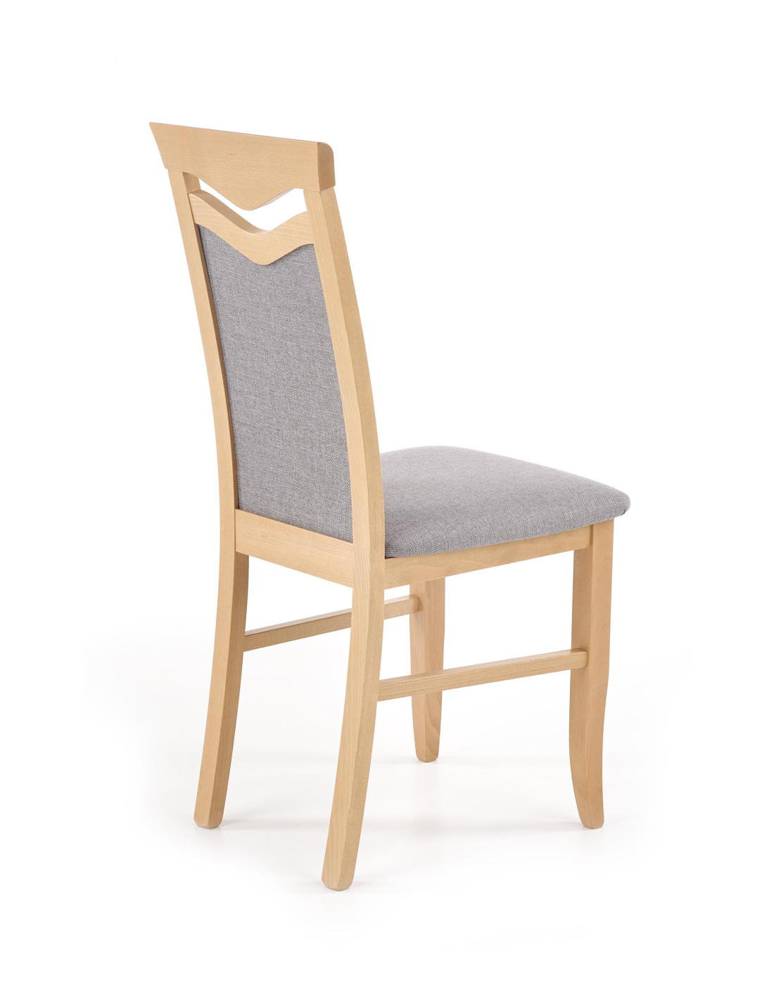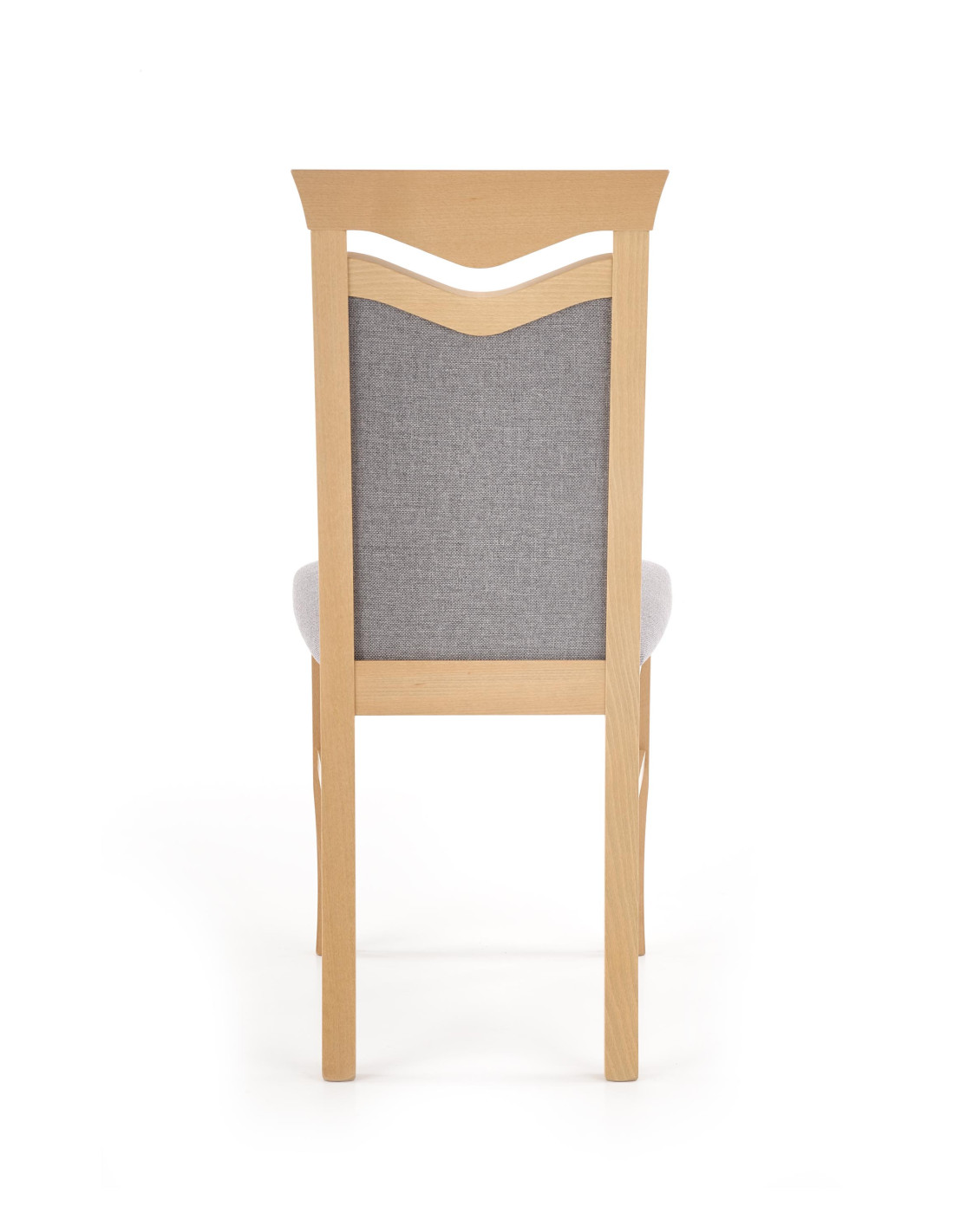 Krzesło wykonane jest z litego drewna bukowego oraz tkaniny w kolorze jasnoszarym, co zapewnia mu elegancki wygląd.