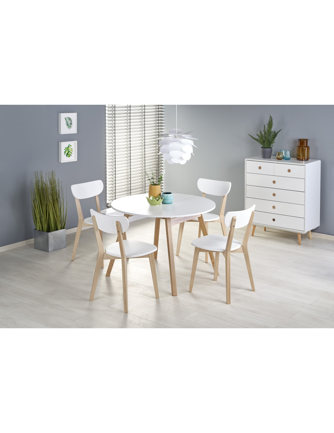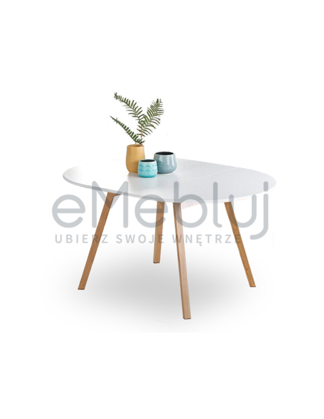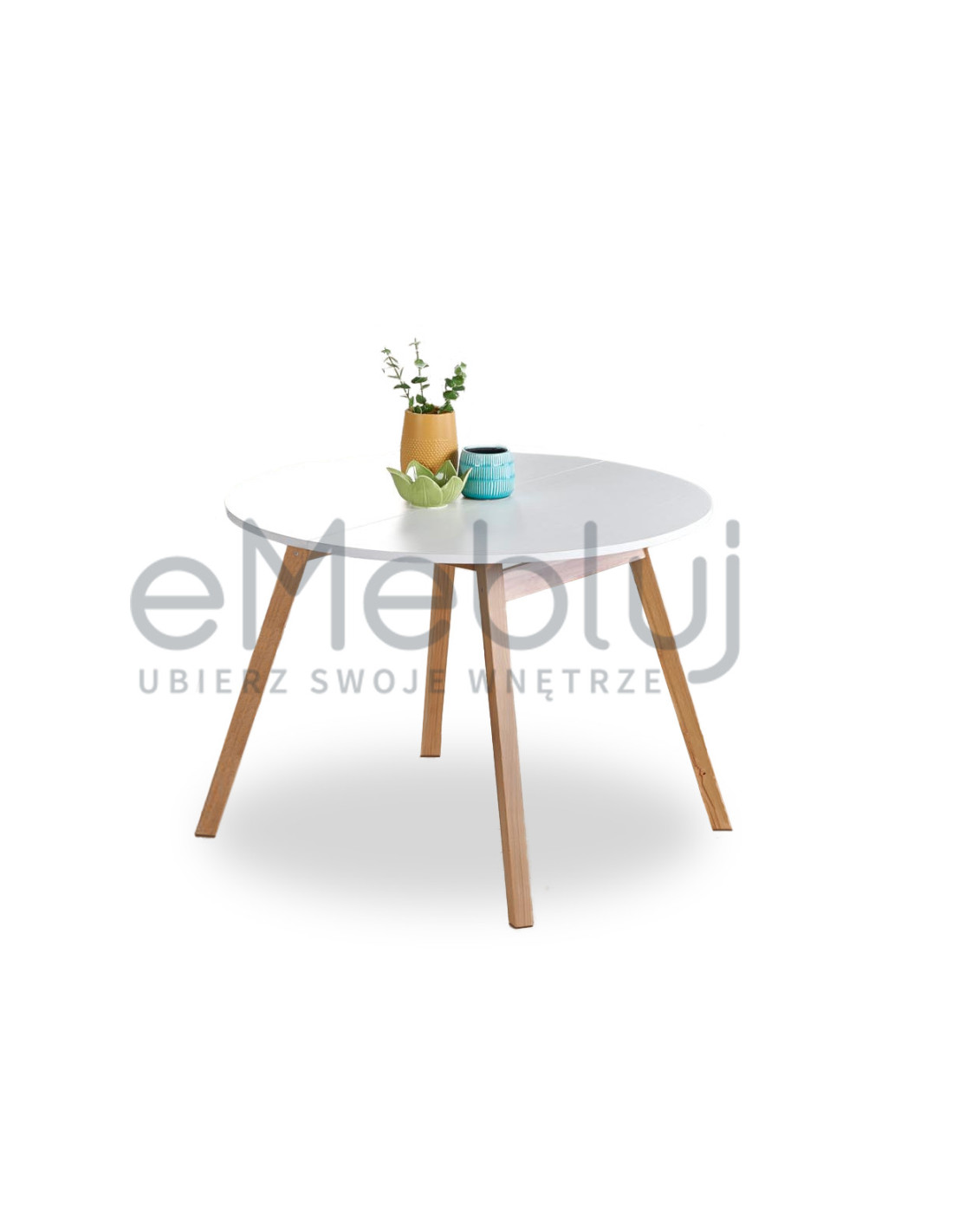 Wybierz rozszerzany stół RUBEN, który łączy w sobie funkcjonalność z minimalistycznym stylem skandynawskim! Jego biały matowy blat oraz nogi w kolorze dębu miodowego tworzą harmonijną całość, idealnie wpisującą się w nowoczesne aranżacje wnętrz. Ten okrągły stół nie tylko zachwyca wyglądem, ale także praktycznością, stając się centralnym punktem każdego spotkania przy wspólnym stole.