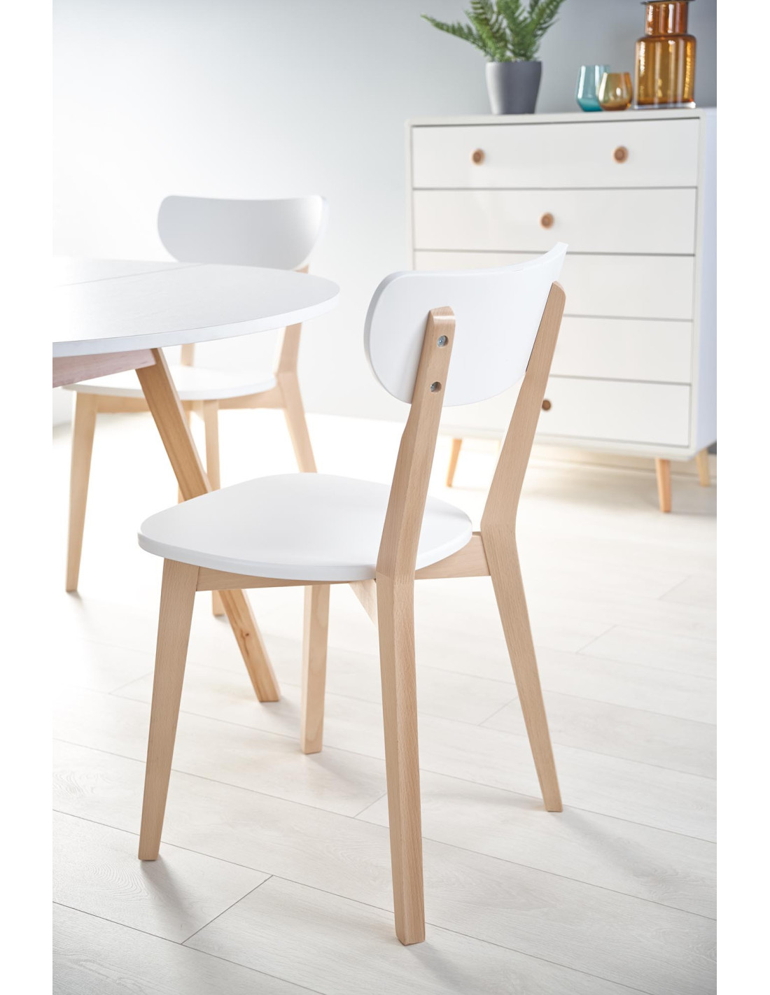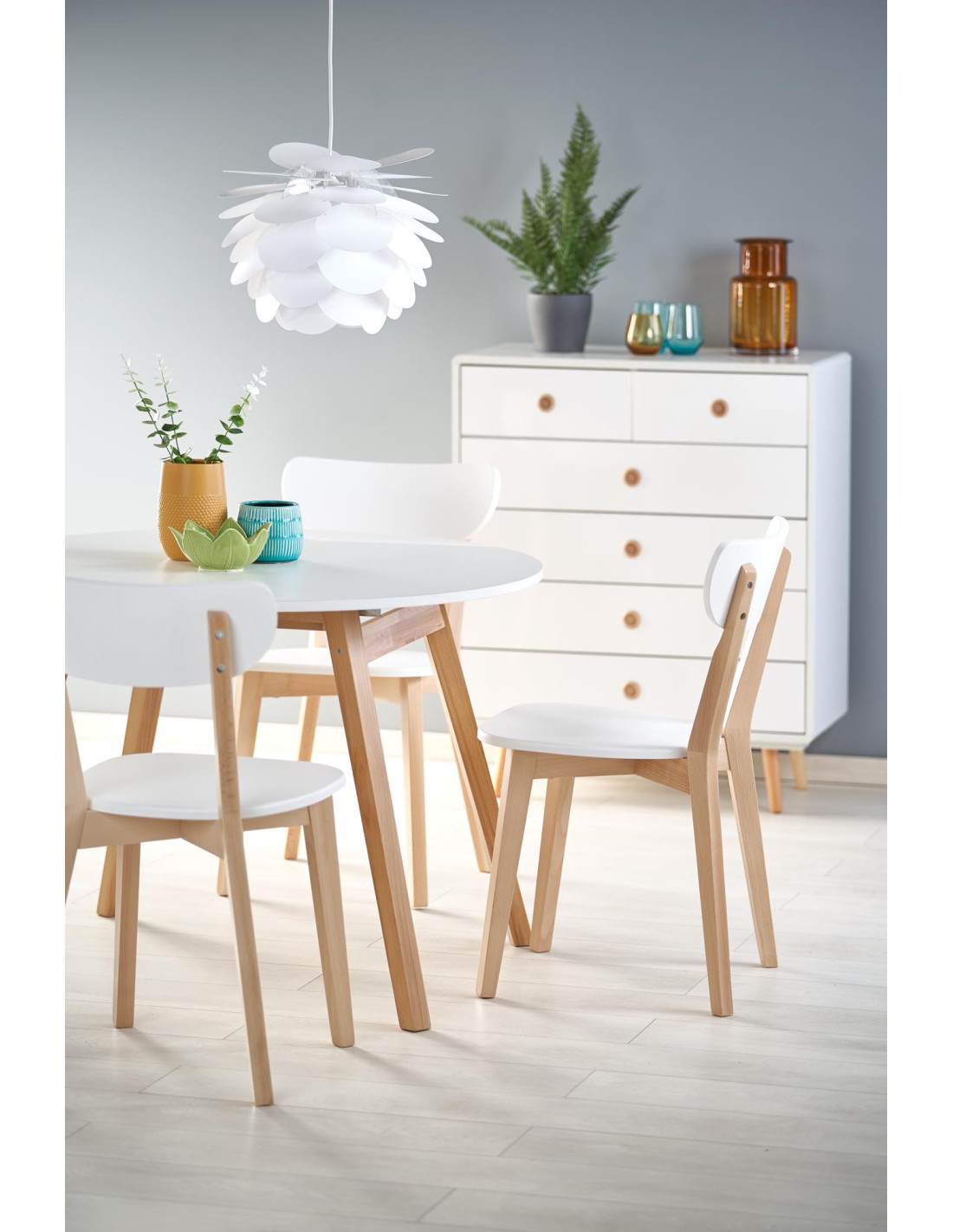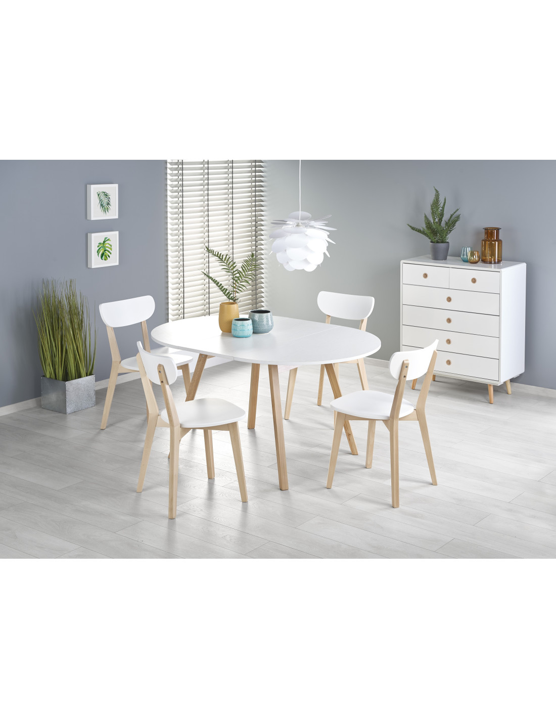 Wybierz rozszerzany stół RUBEN, który łączy w sobie funkcjonalność z minimalistycznym stylem skandynawskim! Jego biały matowy blat oraz nogi w kolorze dębu miodowego tworzą harmonijną całość, idealnie wpisującą się w nowoczesne aranżacje wnętrz. Ten okrągły stół nie tylko zachwyca wyglądem, ale także praktycznością, stając się centralnym punktem każdego spotkania przy wspólnym stole.